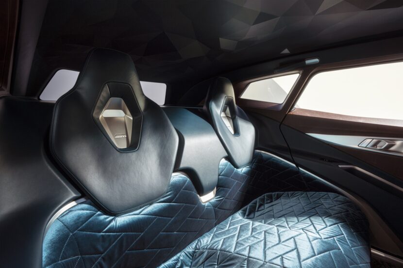 During our interview with BMW CEO Frank van Meel, he said the interior is a bit like Dr. Jekyll and Mr. Hyde, in that it’s half cockpit and half lounge. The front passengers are greeted with a sporty but very high quality cabin. Rich, aged leather gives it a vintage look, the three-spoke steering wheel is sporty and also wrapped in that aged leather, and the screens tilt toward the driver, like BMWs of yore. The seats also look immensely comfortable and supportive, with thick bolsters and fixed headrests.