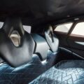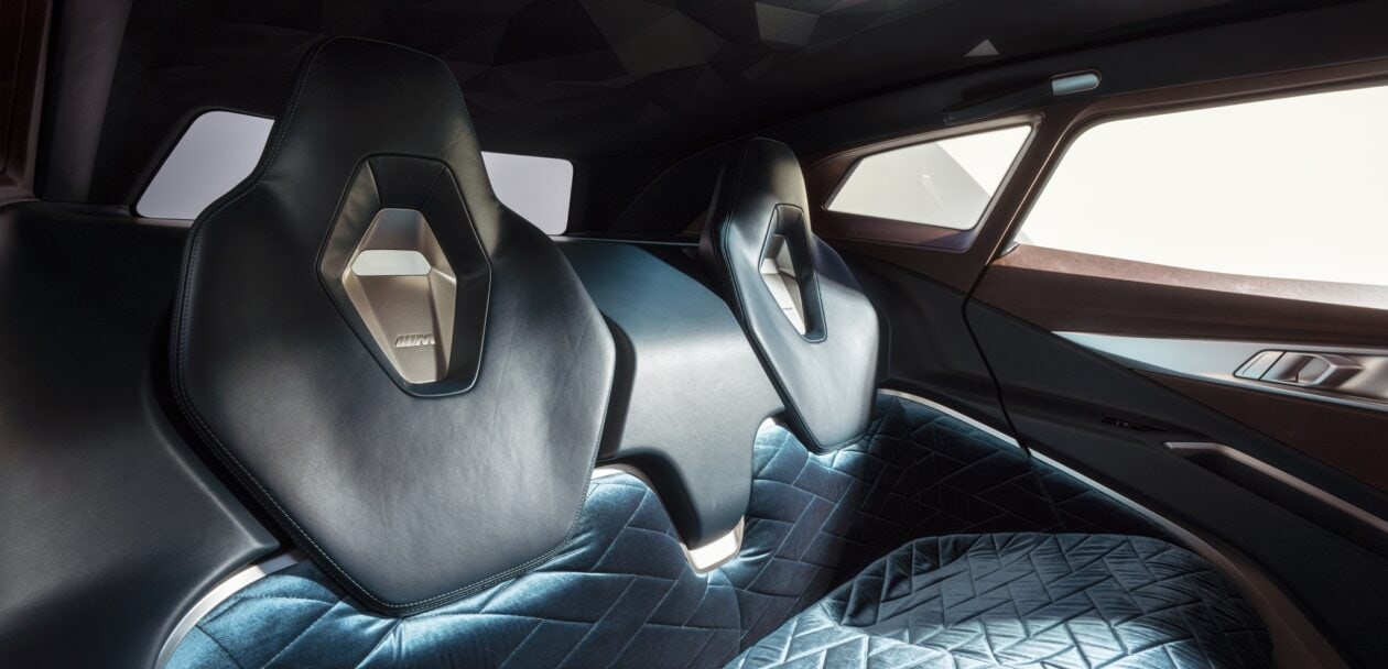 In the back seat, you’ll see the most unique looking rear seats of any BMW. The lower and upper portions are different shapes, materials, and designs. The lower portion is made up of a shiny fabric, while the upper portion seems to be leather. While it might not be the sportiest looking back seat, like that of the BMW M5 CS, it’s certainly premium looking.