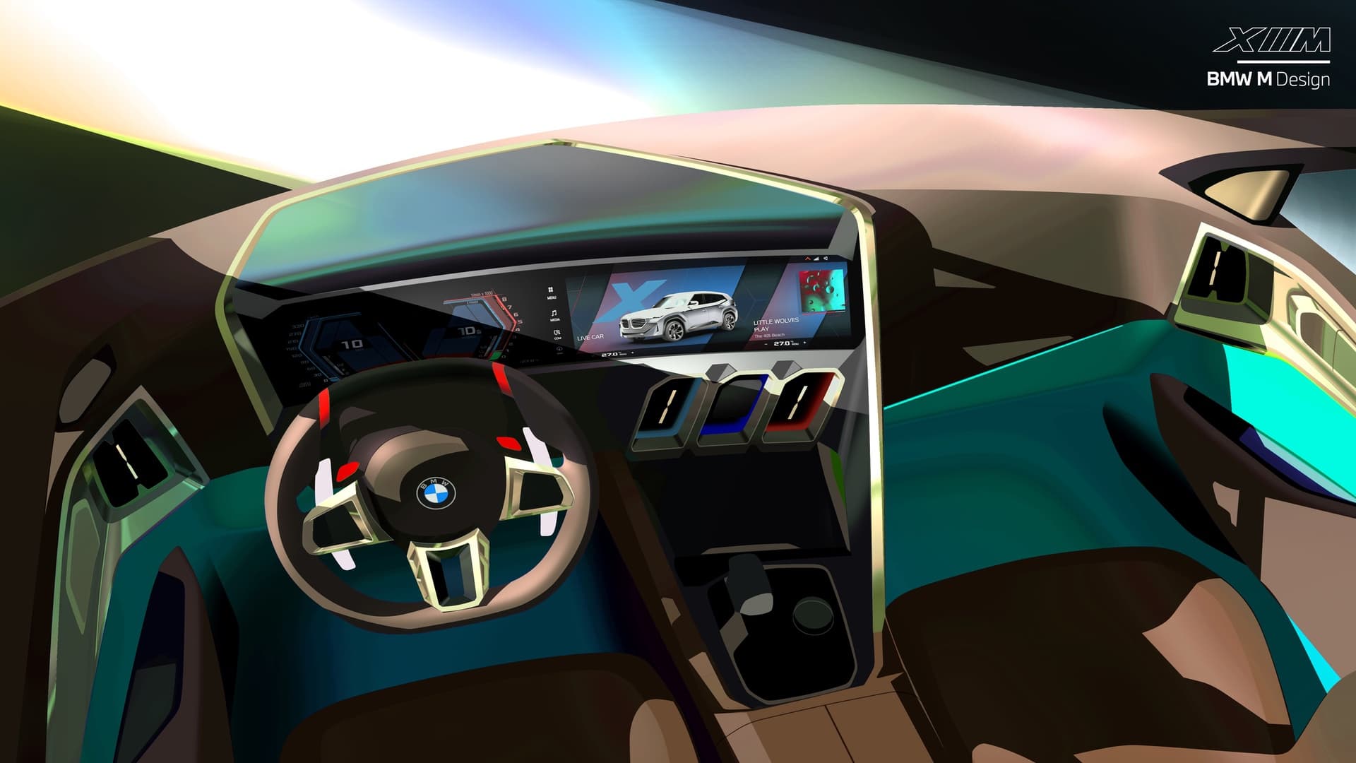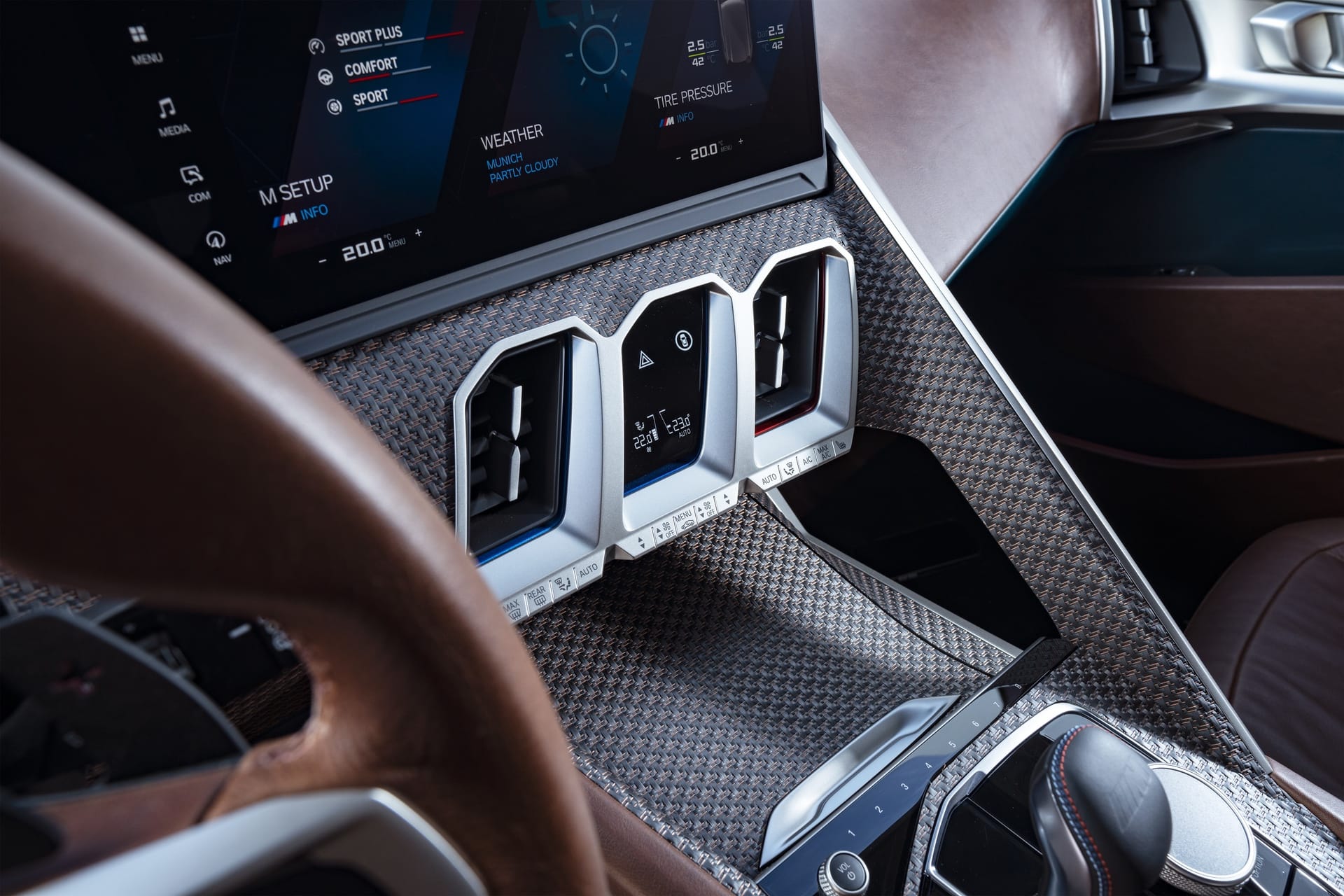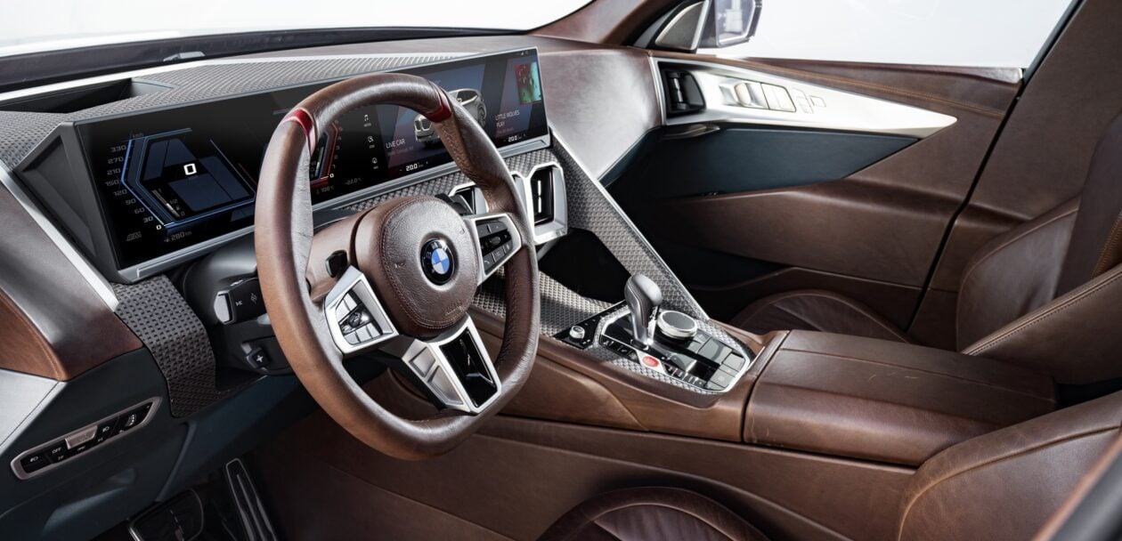 BMW M used a new sort of vintage leather in the XM, which looks as if it’s been aged, like an old baseball glove. It looks cozy and soft, especially on the seats, which look like they’ll provide hours of comfy driving. That same leather covers the steering wheel and looks like it will feel lovely to hold.