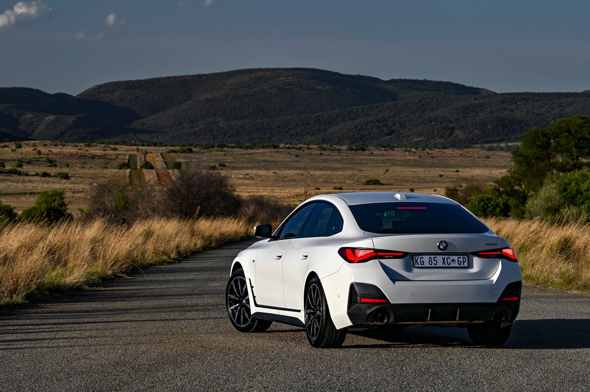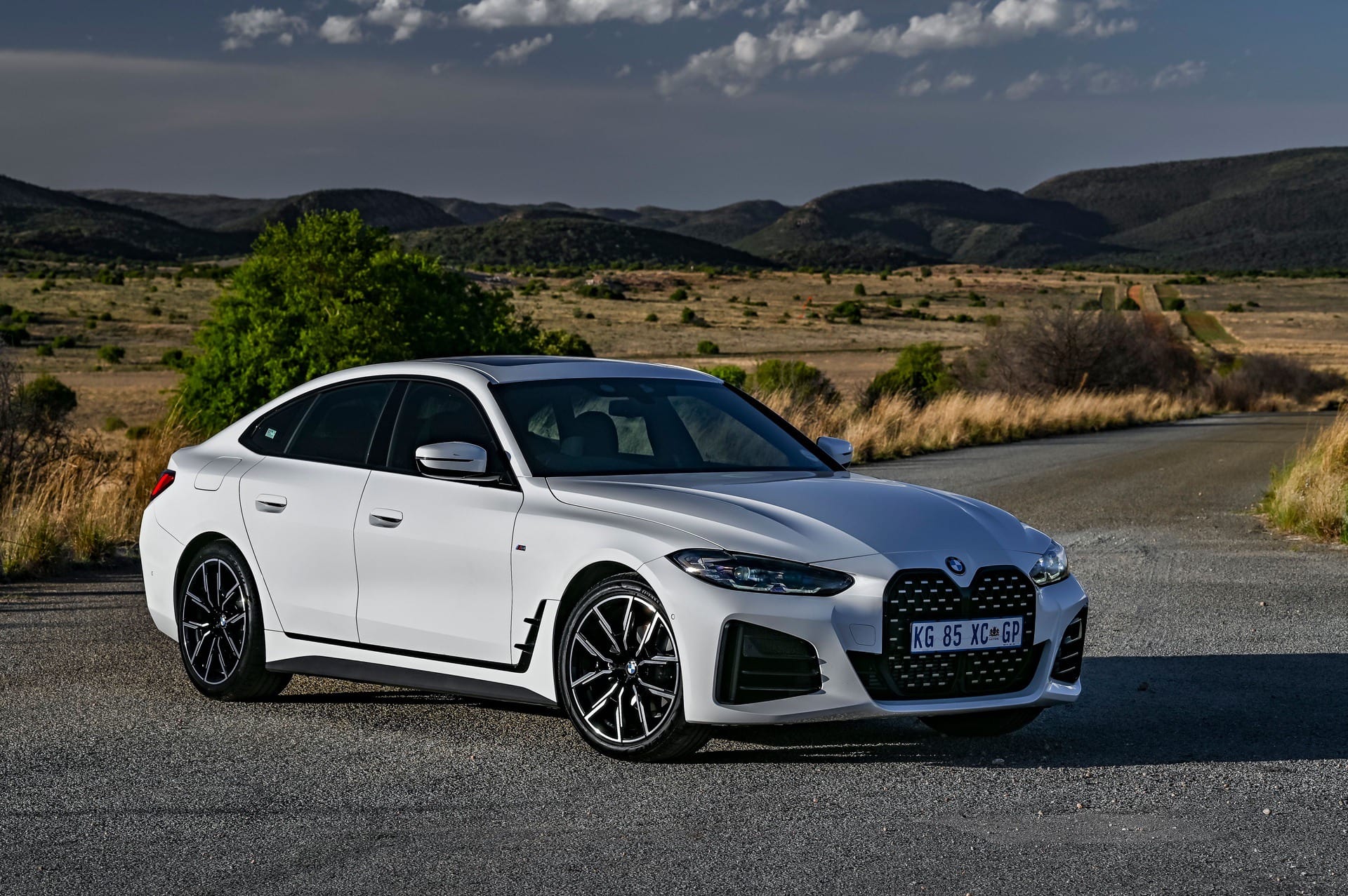 Hailing from South Africa is a new BMW 4 Series Gran Coupe (G26) in a stylish black and white look exterior combination. The BMW 420i Gran Coupe features an M Sport Package with the extended Shadow Line option which adds black contrasts to the Mineral White Metallic color. The Shadow Line adds a black lacquered kidney frame, tailpipe trims in black chrome, together with the black “hockey stick” on the side.