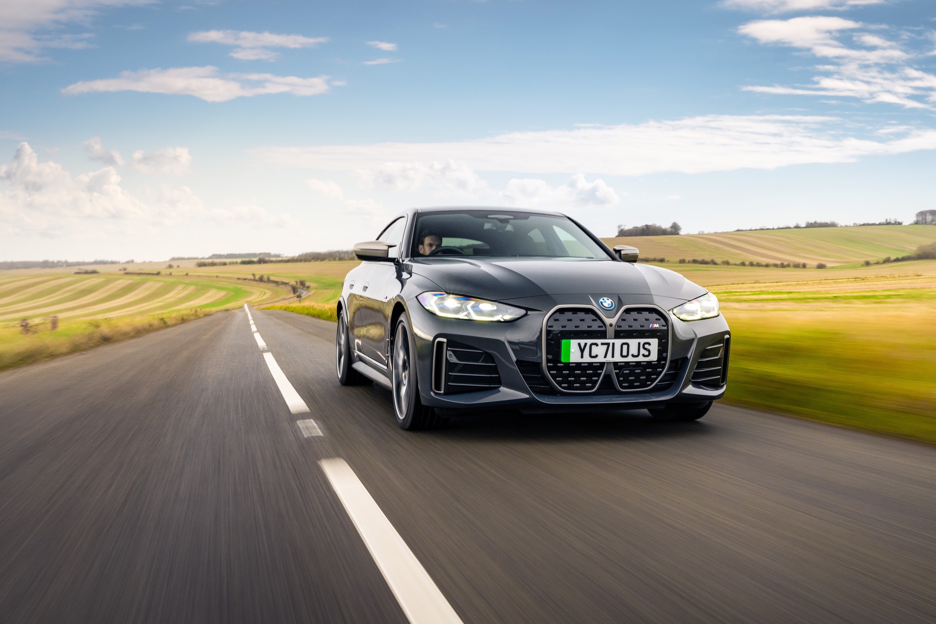 Dravit Grey is just one of the many different colors offered for the BMW i4. Customers around the world will have a choice between Alpine White, Mineral White, Black, Black Sapphire, Skyscraper Grey, Sunset Orange, Tanzanite Blue, San Remo Green, Aventurine Red, Brooklyn Grey and Frozen Portimao Blue. Some of those colors are specific to a model line – i440 vs. M50 – or even distributed by “accents”.