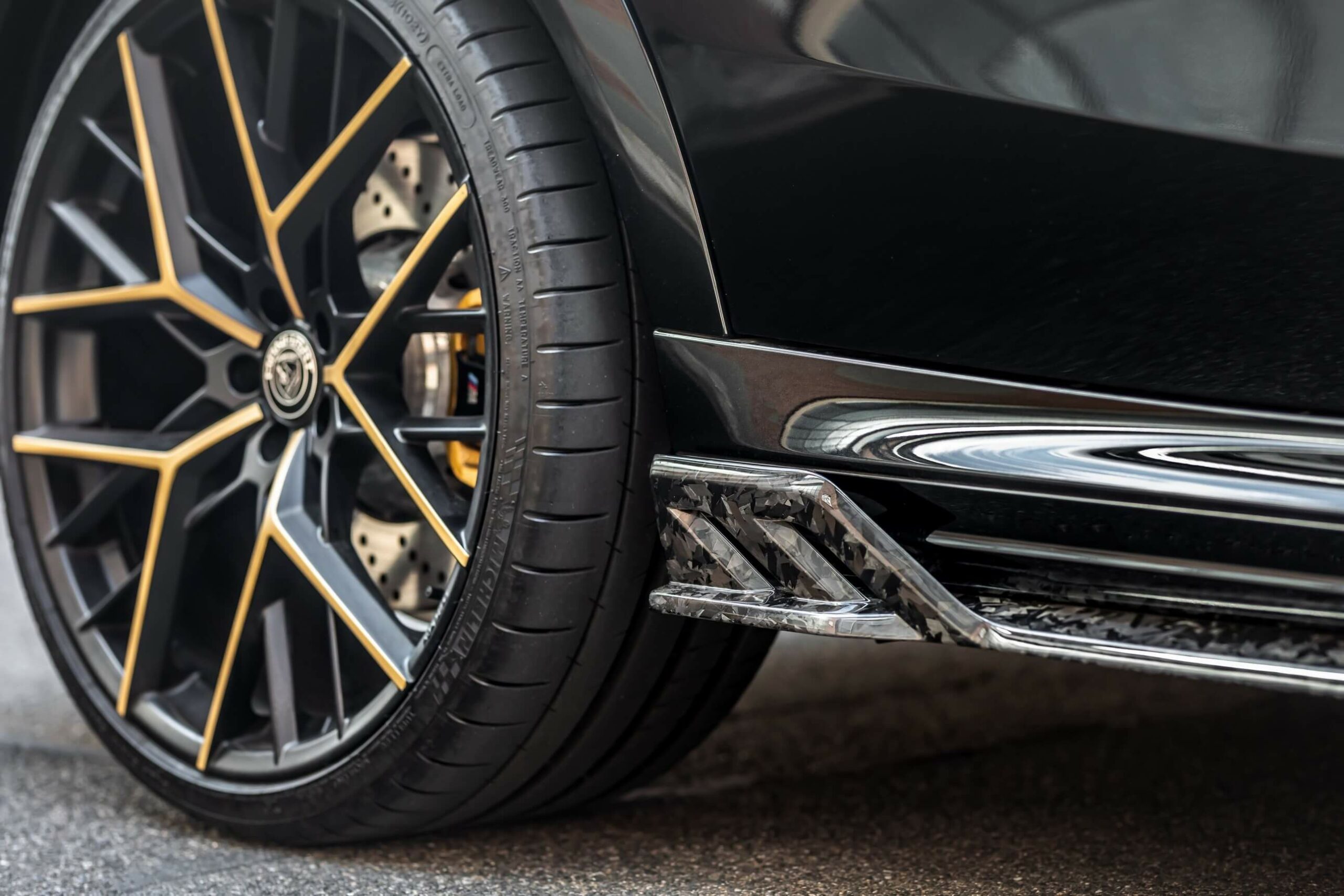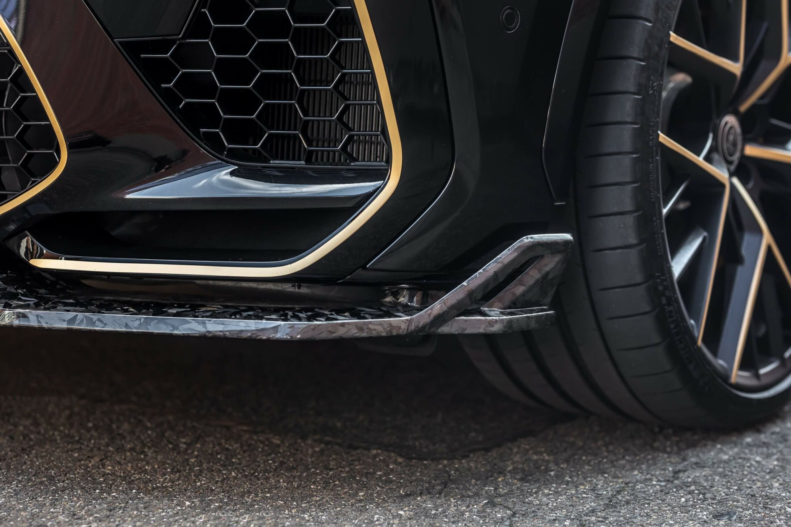 The predominantly black body wears contrasting gold accents also noticeable on the brake calipers and the Y-shaped spokes of the wheels. A gold strip has been applied onto the side mirror caps, now finished in forged carbon to match the custom front spoiler lip and the rear diffuser. The subtle tailgate spoiler has a similar look, as do the concave rear bumper trims and the outline of the kidney grille.