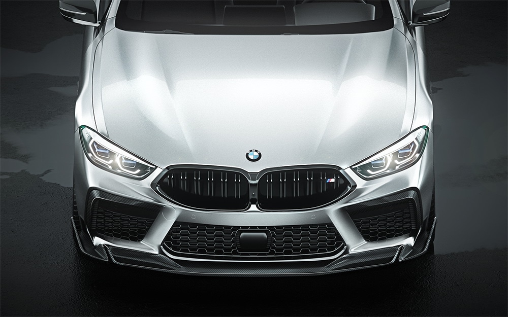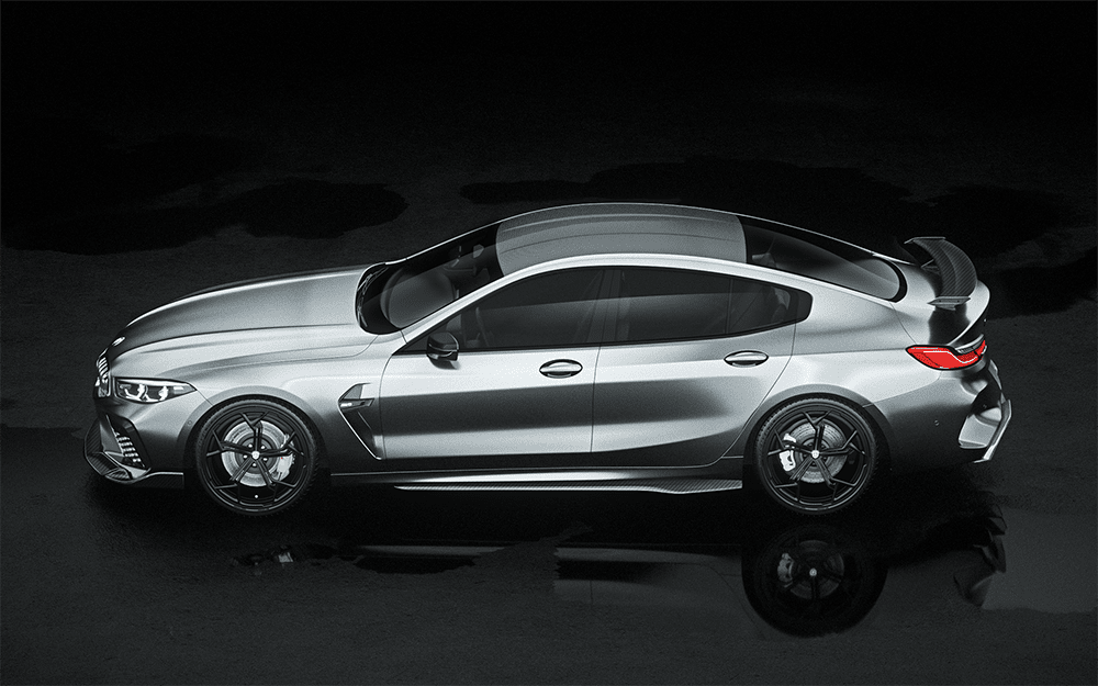Work started at the front where the bumper now hosts a larger spoiler lip with chunky endplates to lend the car a more aggressive stance. There’s more carbon fiber to be found on the L-shaped vent trim while retaining the massive air intakes of the standard M8 Gran Coupe. Moving at the profile, the side skirts have new extensions to make the body appear slightly wider and therefore more imposing.