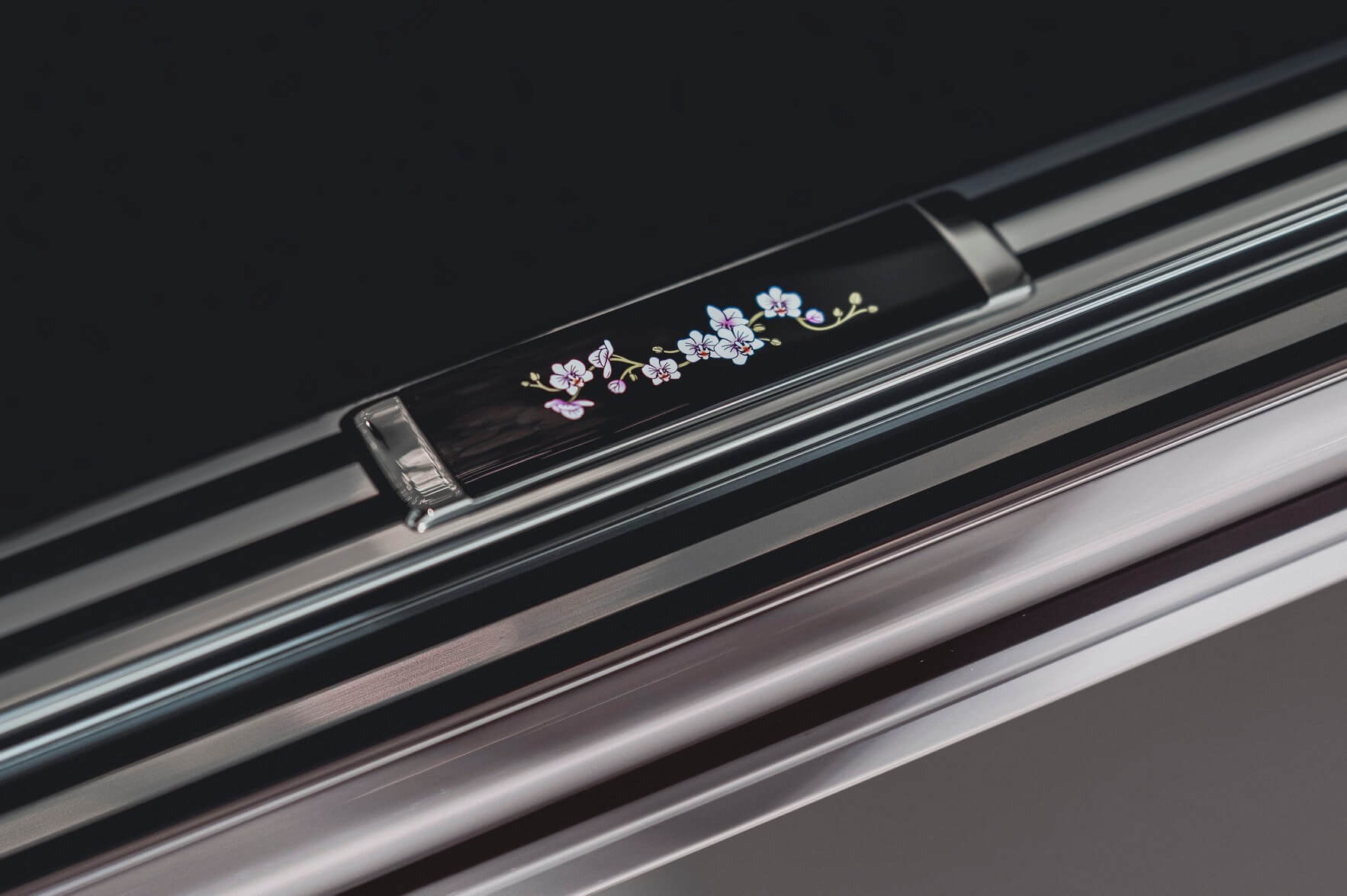 The stretched Phantom has a unique cabin with an exquisite application of silk on the dashboard. Helen Amy Murray reinforced the orchid theme with manually inserted silk. The veritable artwork is nestled behind an uninterrupted glass panel spanning across the entire dashboard. Its Grace White background is combined with Havana and Smoke Grey with Dark Olive stitching to accentuate the floral motif.