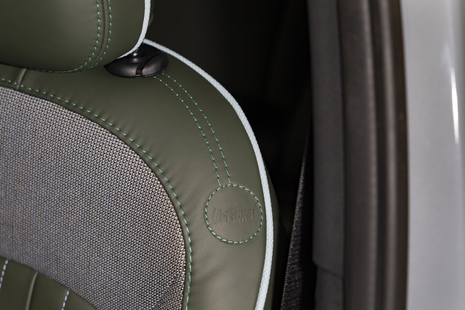 Inside, sport seats are trimmed in MINI Yours Leather Lounge Sage Green, with light contrasting seams and piping, as well as textile inserts.