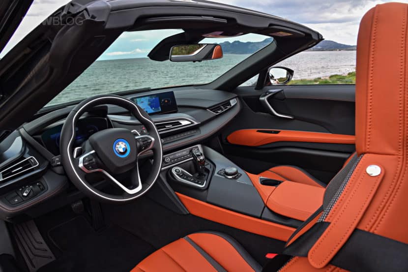One of my favorite advantages of the i8 Roadster over the coupe is that the beautiful interior on display for all the world to see. Standard Carbon Fiber trim pairs great with the great leather options the i8 had available to it. Most of the colors are bright and they all present great – ivory, “e-Copper” (think cognac), Dalbergia Brown, and of course standard Black. The gauges, while digital, are still better looking than iDrive 7 gauges – with a classic speedometer look and bold colors that change with the drive mode.