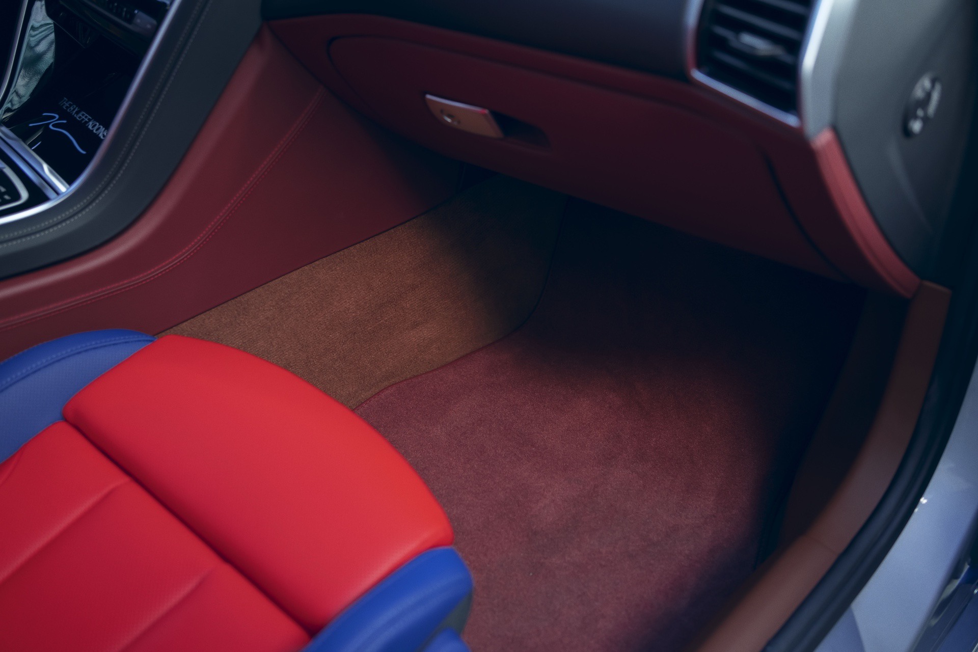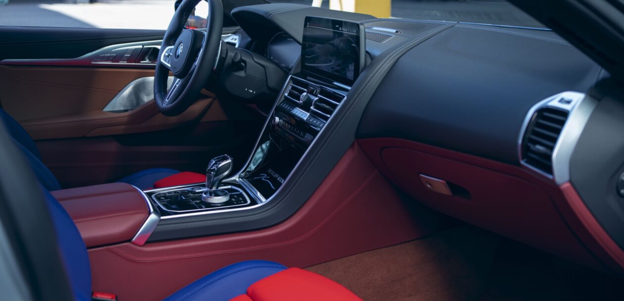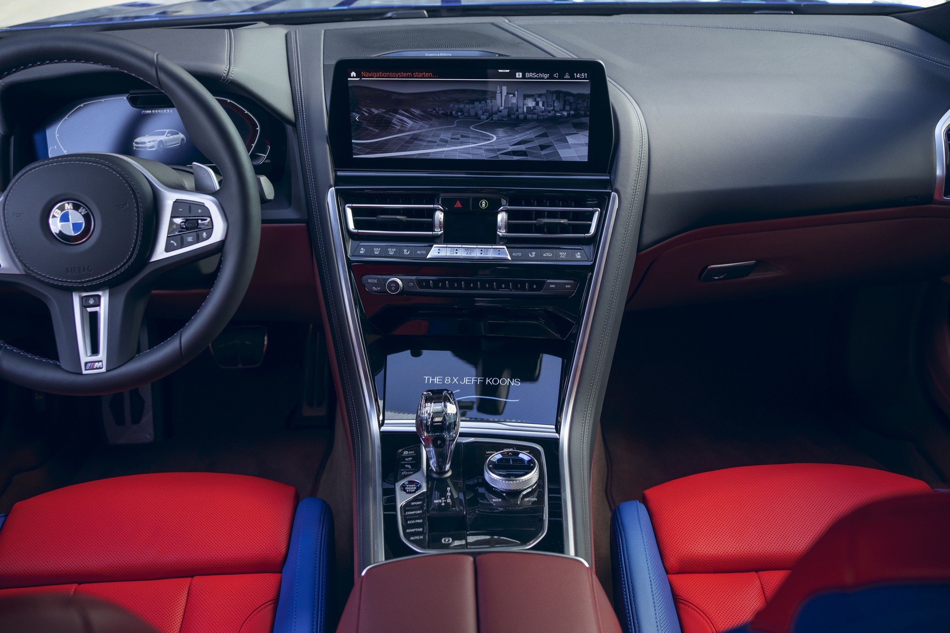Inside, this unique 8 Series Gran Coupe gets a very Superman-esque color scheme, with tons of blue and red, including the red headliner and floor mats. It also gets piano black trim, with Koons’ signature on the cupholder cover.