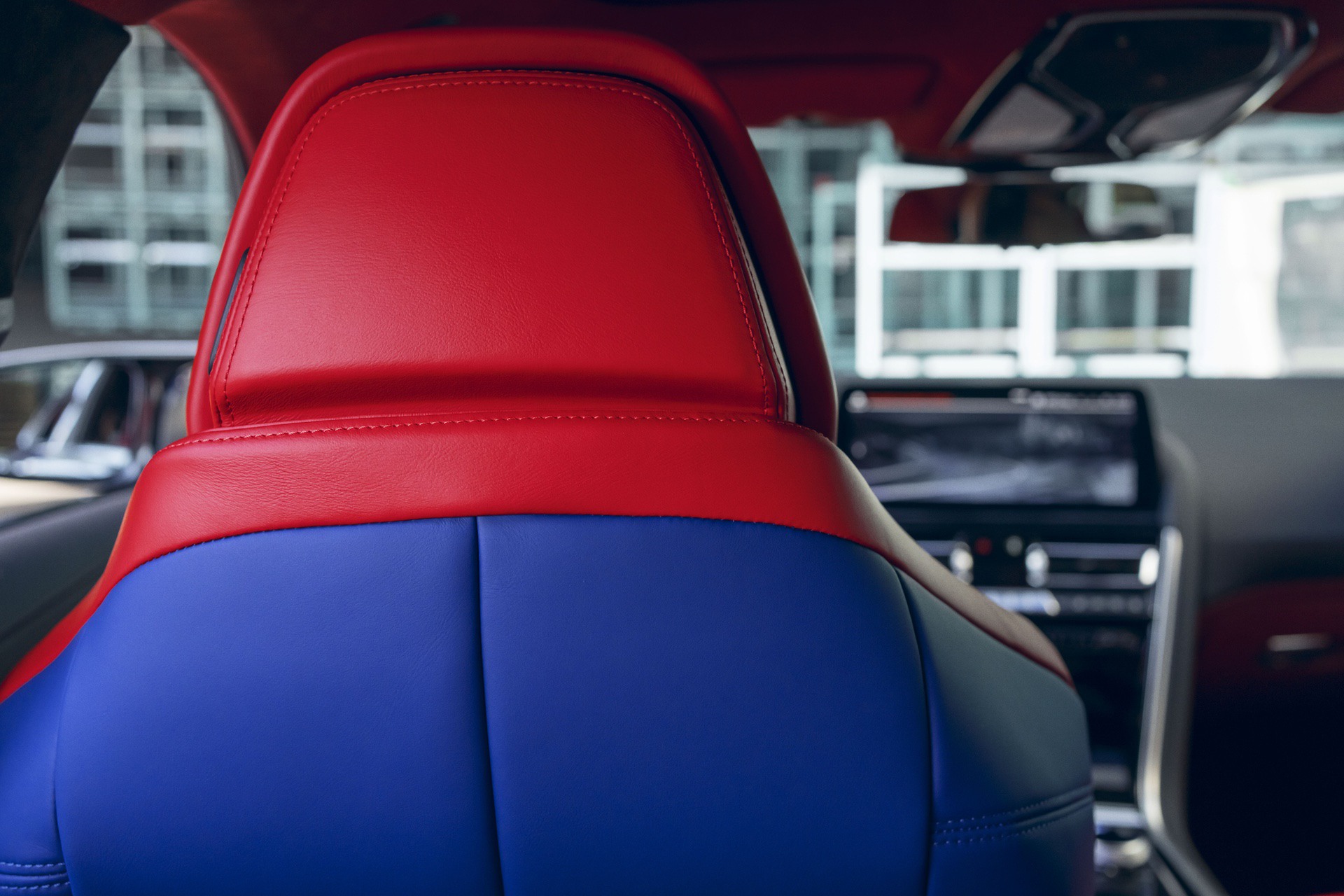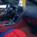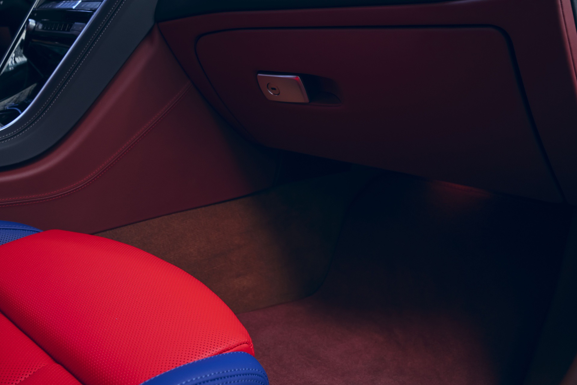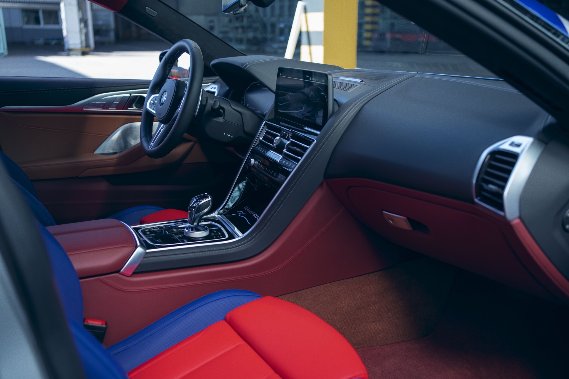 Inside, this unique 8 Series Gran Coupe gets a very Superman-esque color scheme, with tons of blue and red, including the red headliner and floor mats. It also gets piano black trim, with Koons’ signature on the cupholder cover.