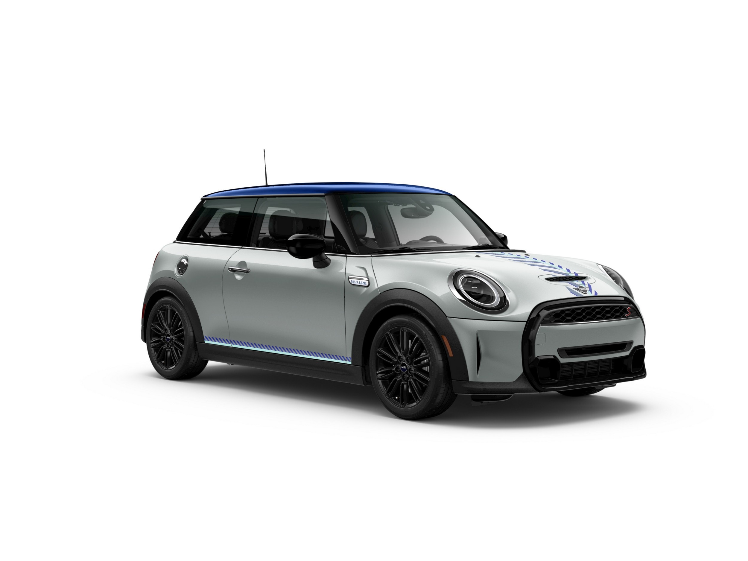 What makes the Brick Lane Edition worthy of being labeled as a special version? A combination of visual tweaks and a generous array of standard equipment. Both body styles share the White Silver Metallic finish with the roof painted in Soul Blue for a contrasting effect. To spruce things up, MINI is painting the side mirror caps in black and is throwing in some chrome accents.
