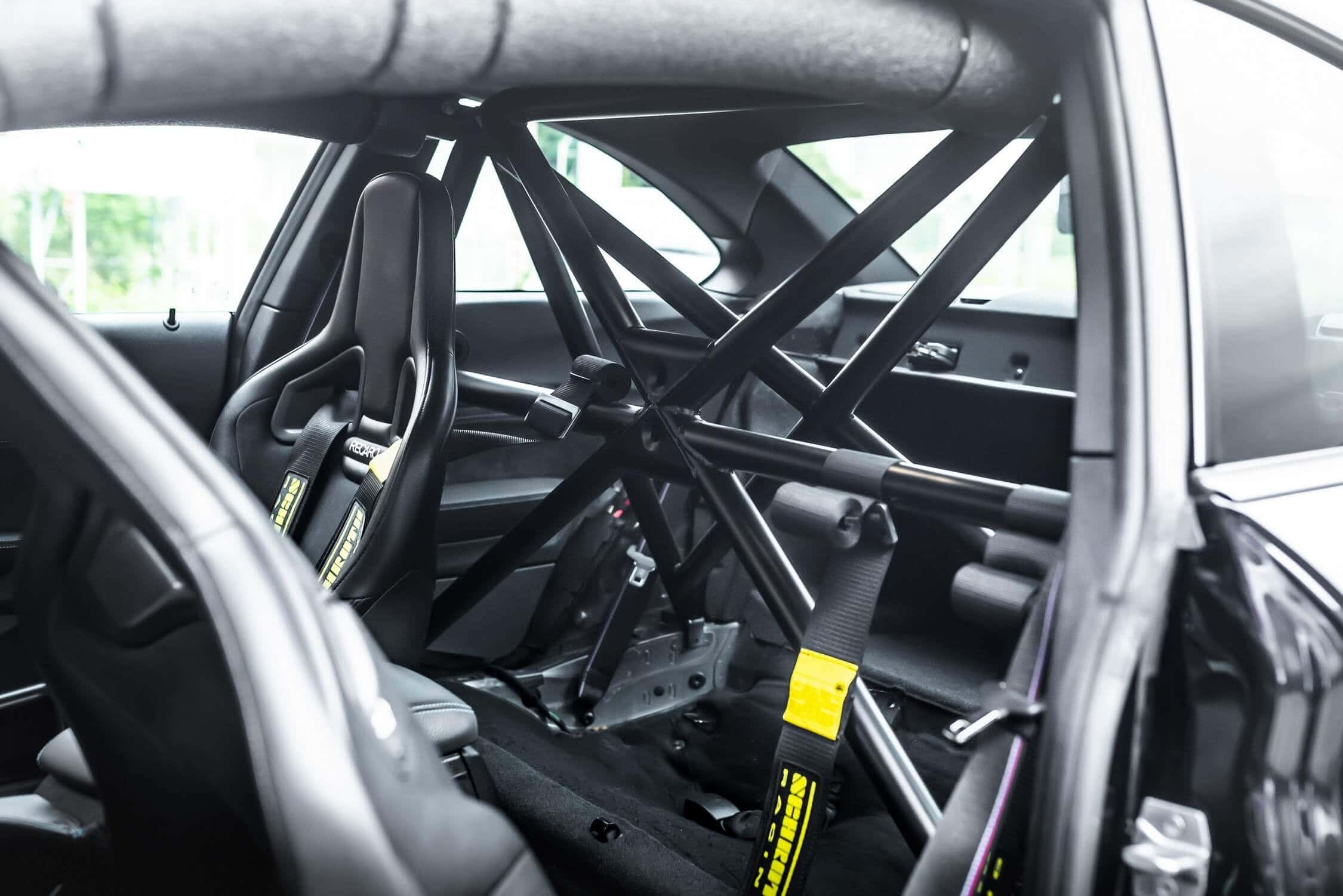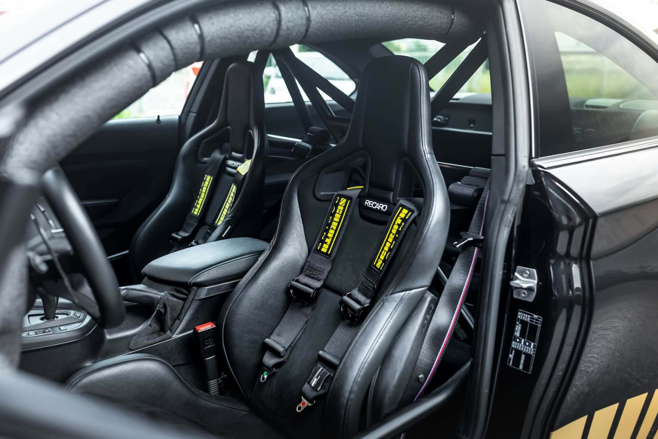 Speaking of race cars, there’s a full roll cage inside where the rear bench has been removed to save weight. Manhart’s send-off for the F87 has Recaro bucket seats with harnesses, not to mention a lot of carbon fiber and an auxiliary screen mounted where you’d normally find the center-left air vent.