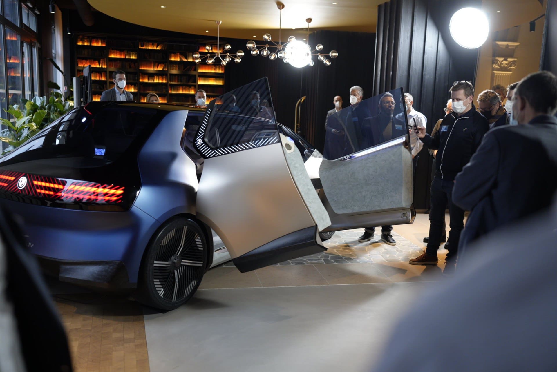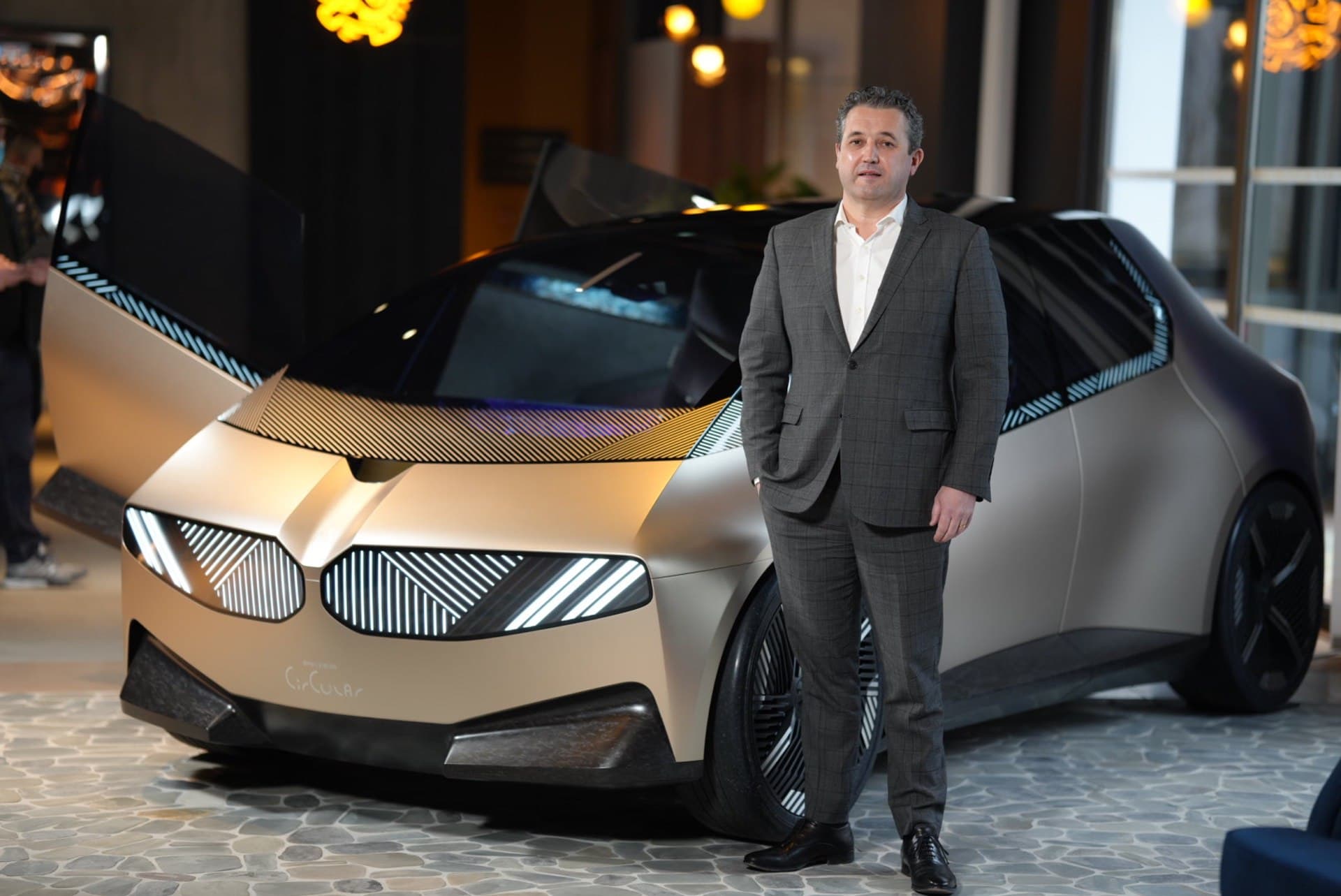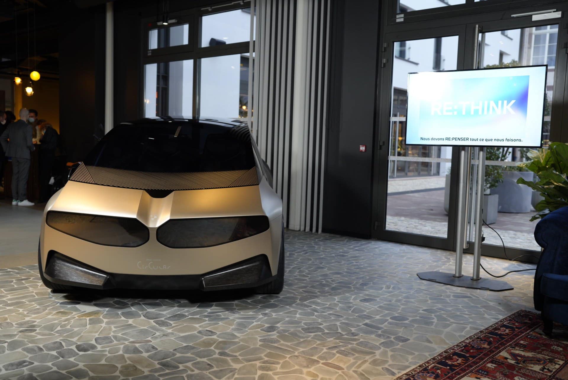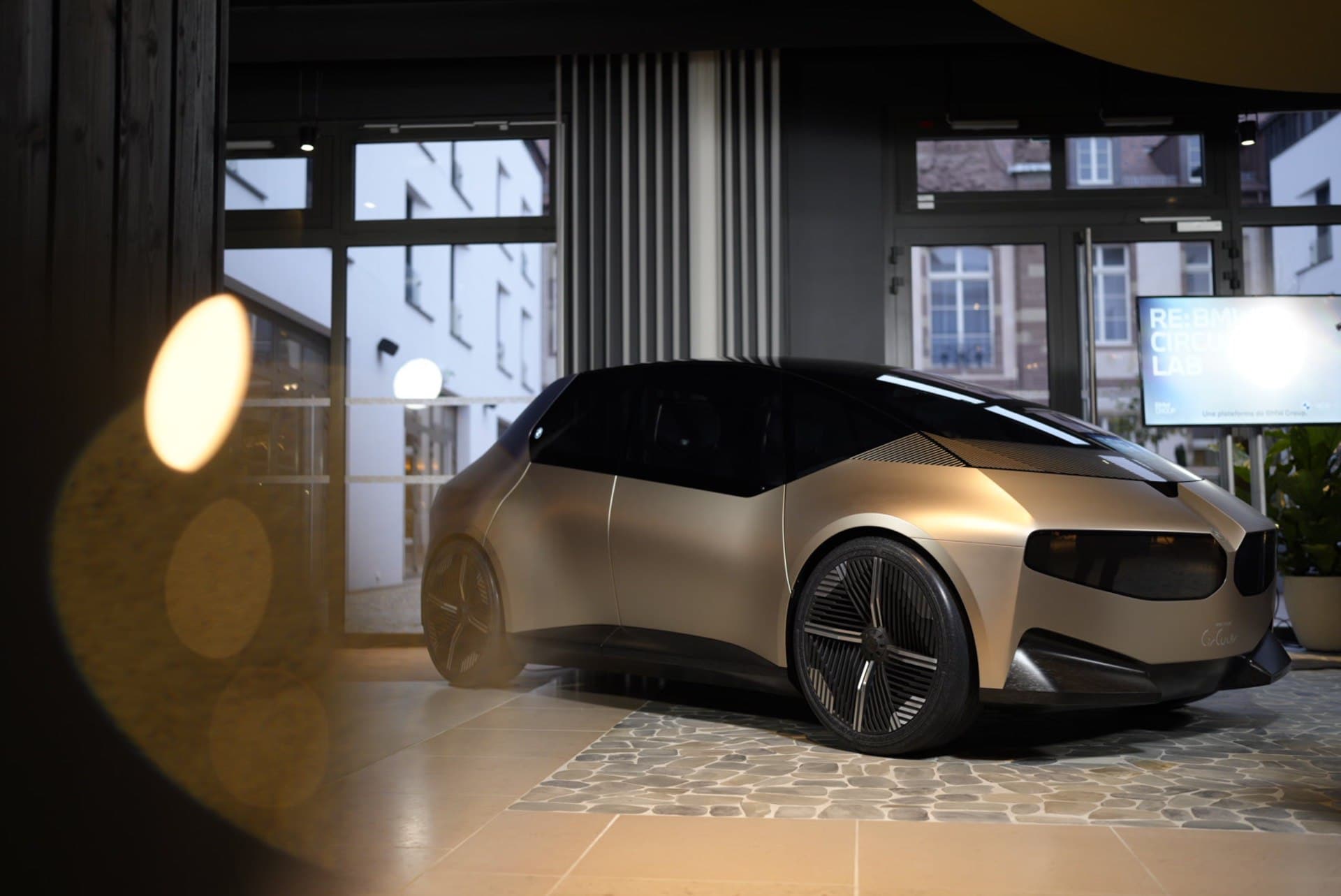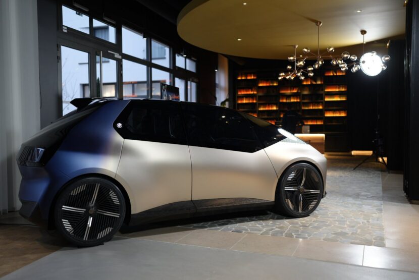 Today, we get to see again the BMW i Vision Circular and its funky design in these new photos from France. The exterior of the i Vision Circular looks unlike any other BMW before it. The kidney grilles and headlights are digital, the taillights are built into a rear glass panel, and its body isn’t even painted. The latter is the funkiest of its exterior design quirks. Rather than paint the body shell, the i Vision Concept’s aluminum panels get light gold anodized finish, which BMW calls Anodized Mystic Bronze.