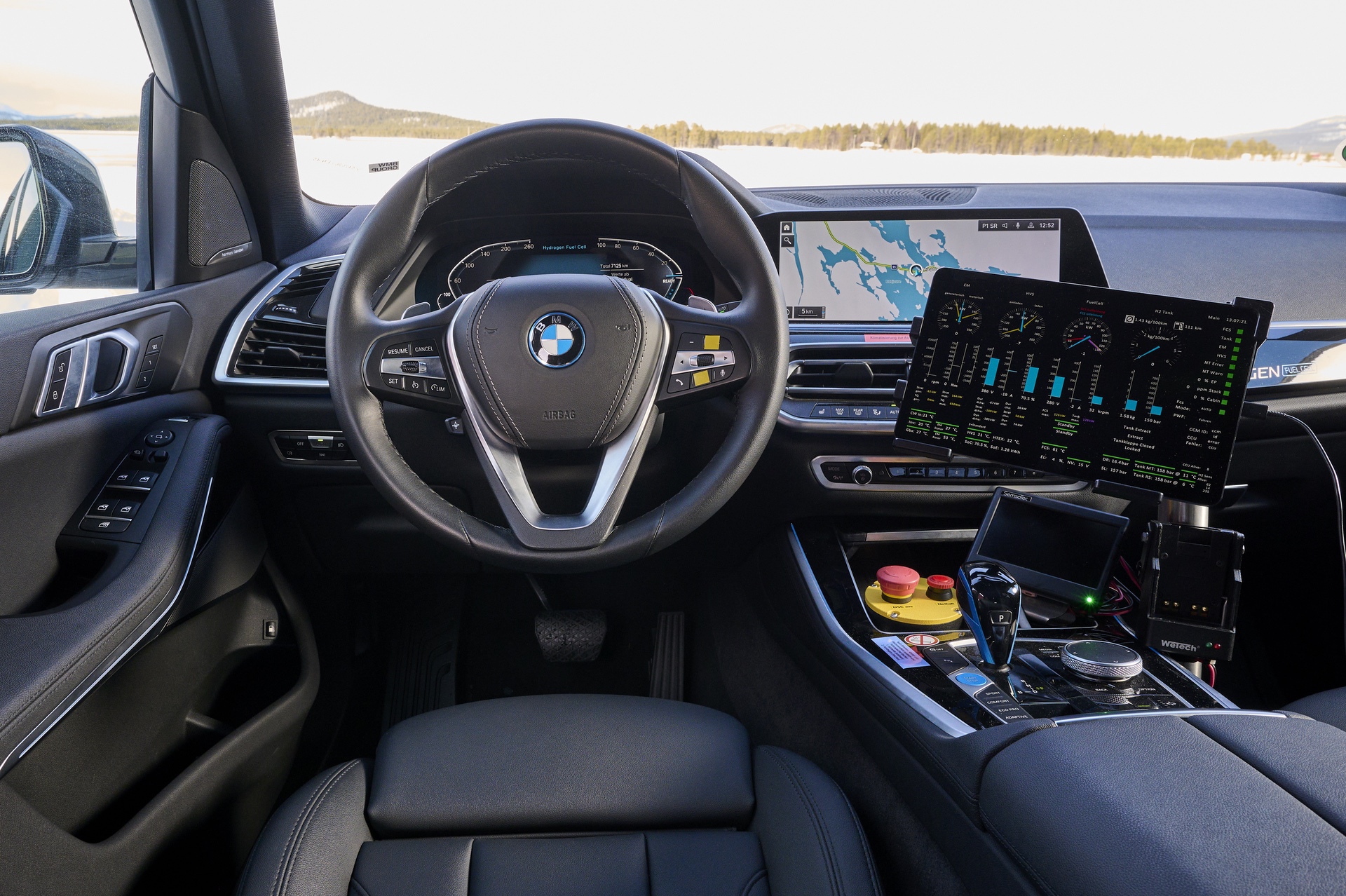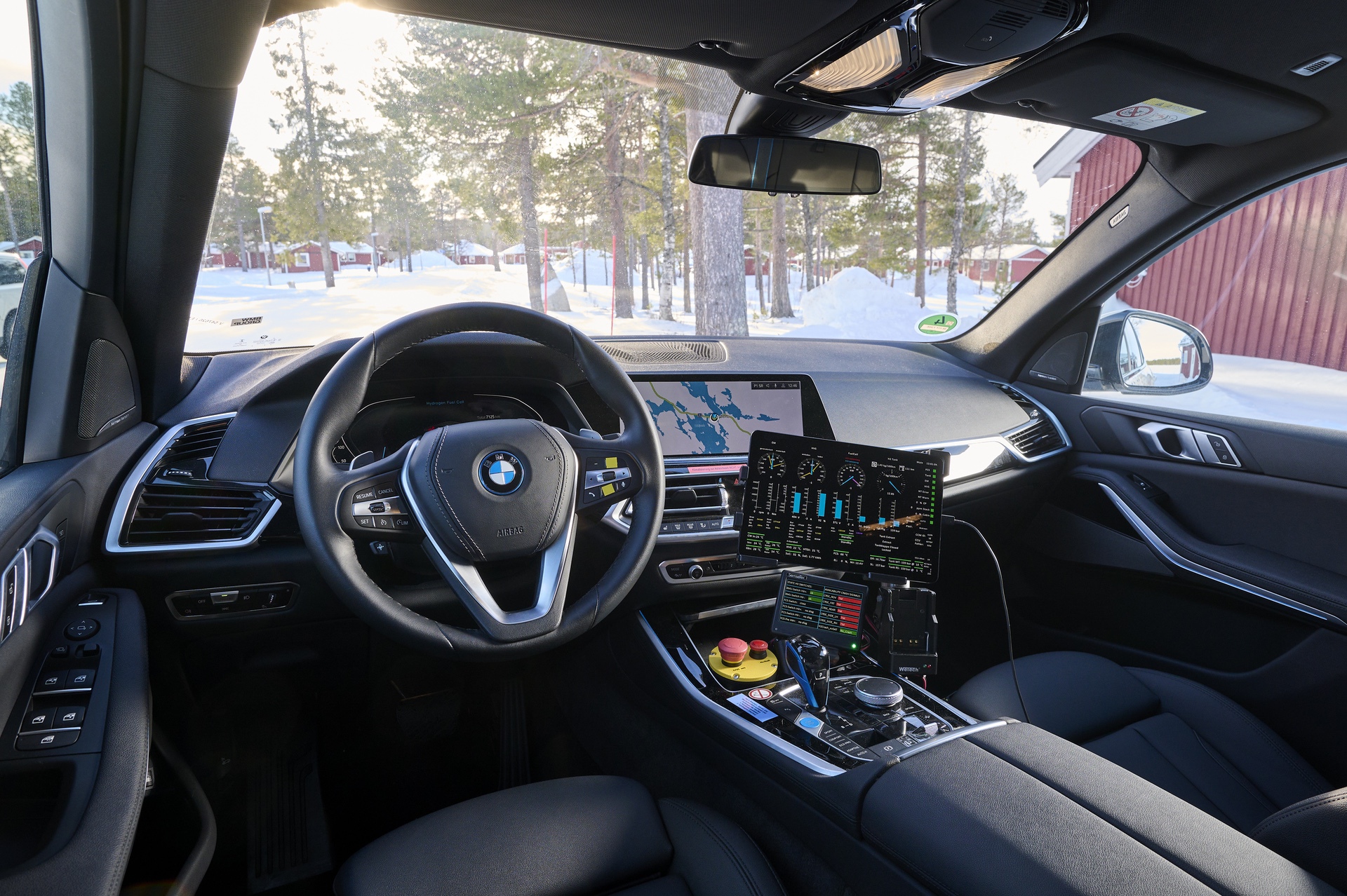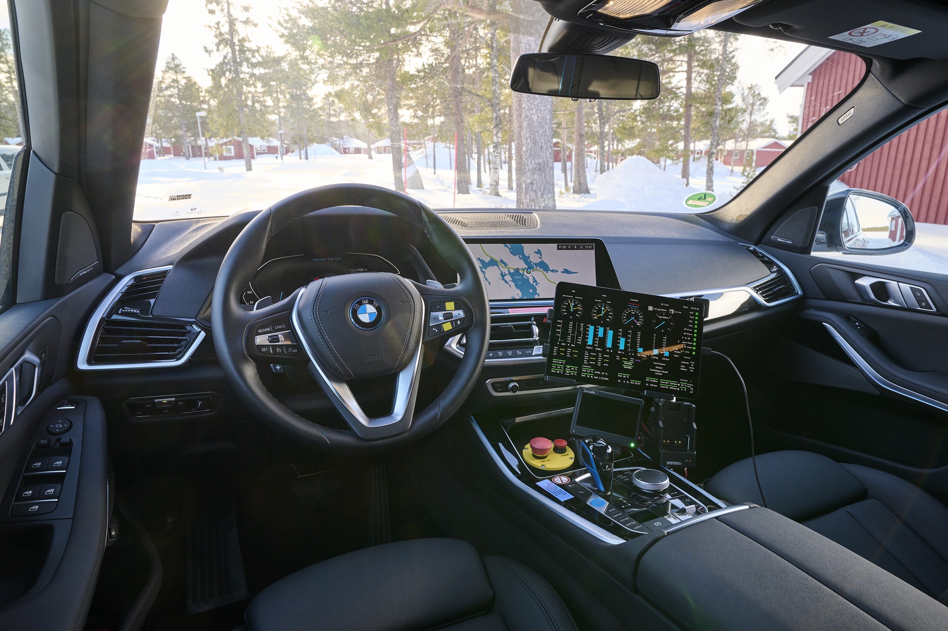 First leg of the test drive will take us from the Hotel Kraja in Arjeplog all the way to the Arctic Circle. A long stretch of curvy, yet snowy and icy roads, will give me the chance to experience what it feels like to live with a fuel cell vehicle. The iX5 Hydrogen Prototype is a rear-wheel drive vehicle, but it comes equipped with proper winter tires. So decent traction and grip. The interior is decked out with a series of testing equipment which captures data in real time and transmits it globally to BMW engineers. All in a matter of milliseconds.