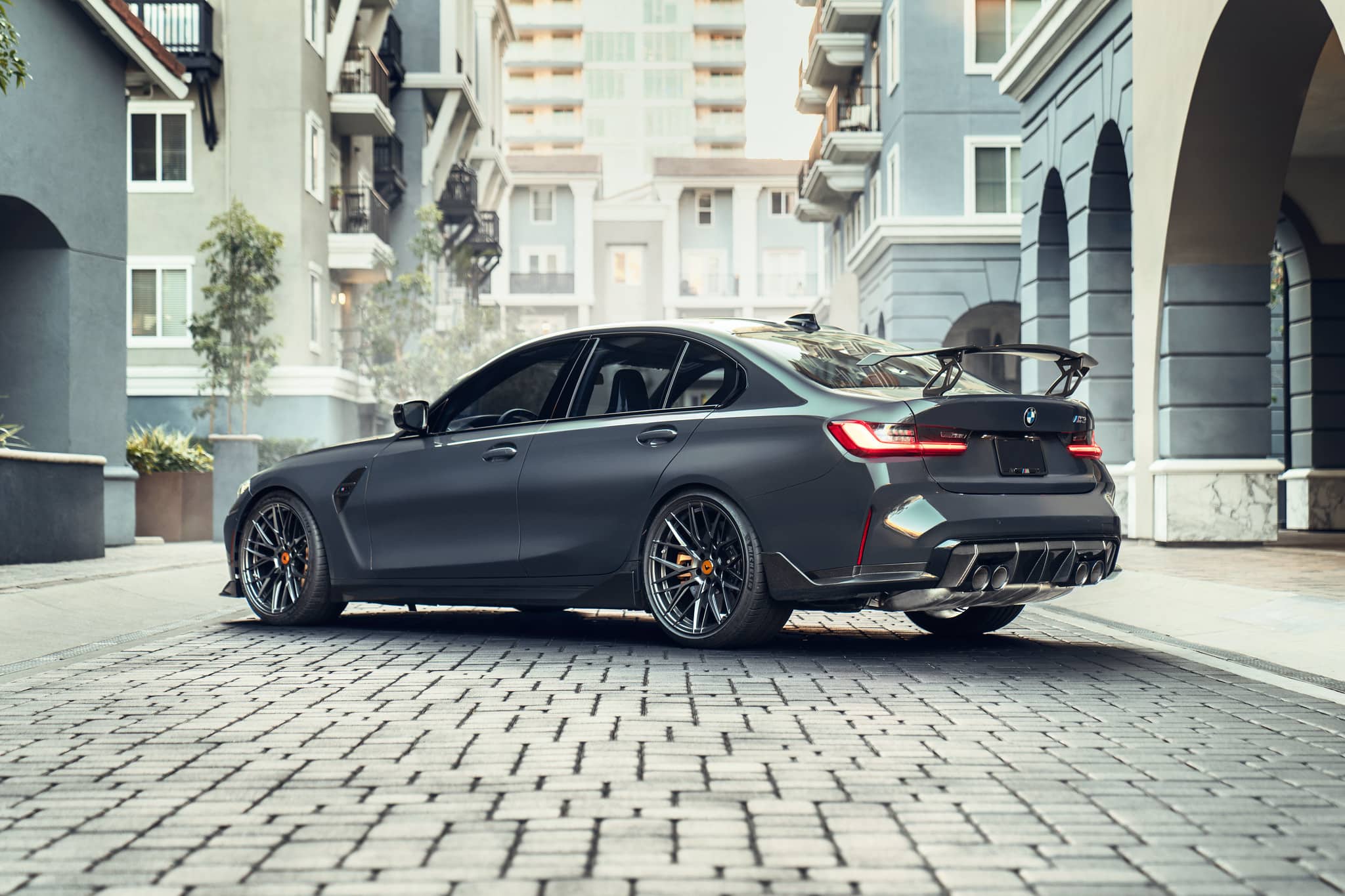 For starters, this BMW M3 G80 stands out with the new VRS Carbon Fiber Front Spoiler which not only gives the car a meaner look, but it also helps with downforce and aerodynamics. Next we have the VRV GTS Carbon Wing Blade with Aluminum Uprights sitting on top of the trunk giving the car a racing-inspired look. That massive wing will help tremendously with downforce on the track.