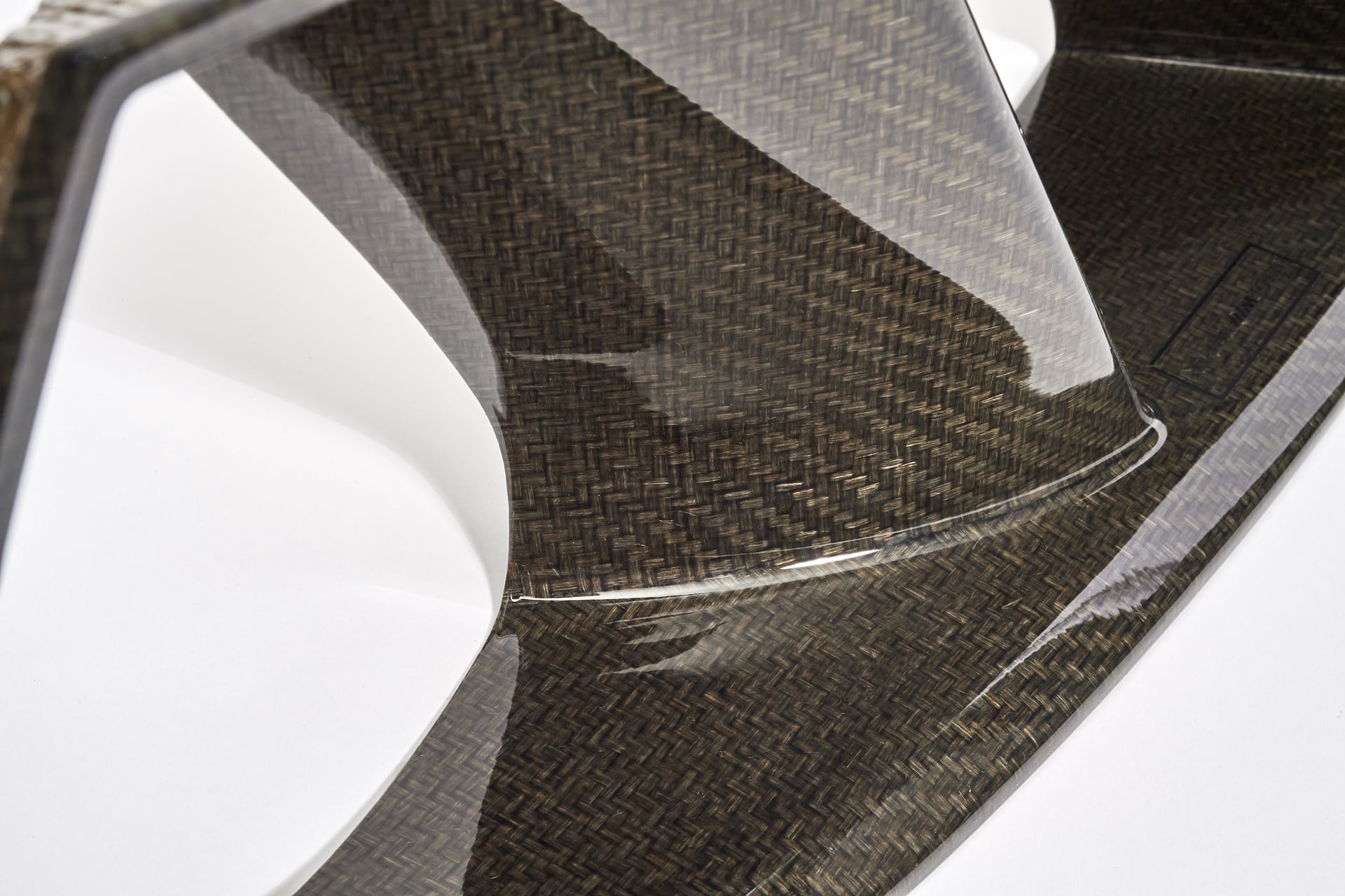 Inspired by leaf veins, the powerRibs™ reinforcement technology developed by Bcomp maximizes stiffness with minimal weight by creating a 3D structure on one side of a thin-walled shell element. This enables a decrease in the amount of base material used, thereby reducing weight, costs and consumables in production. The ampliTex™ reinforcements add a visible layer of flax fibres as a carbon-neutral replacement for the conventional covering material.