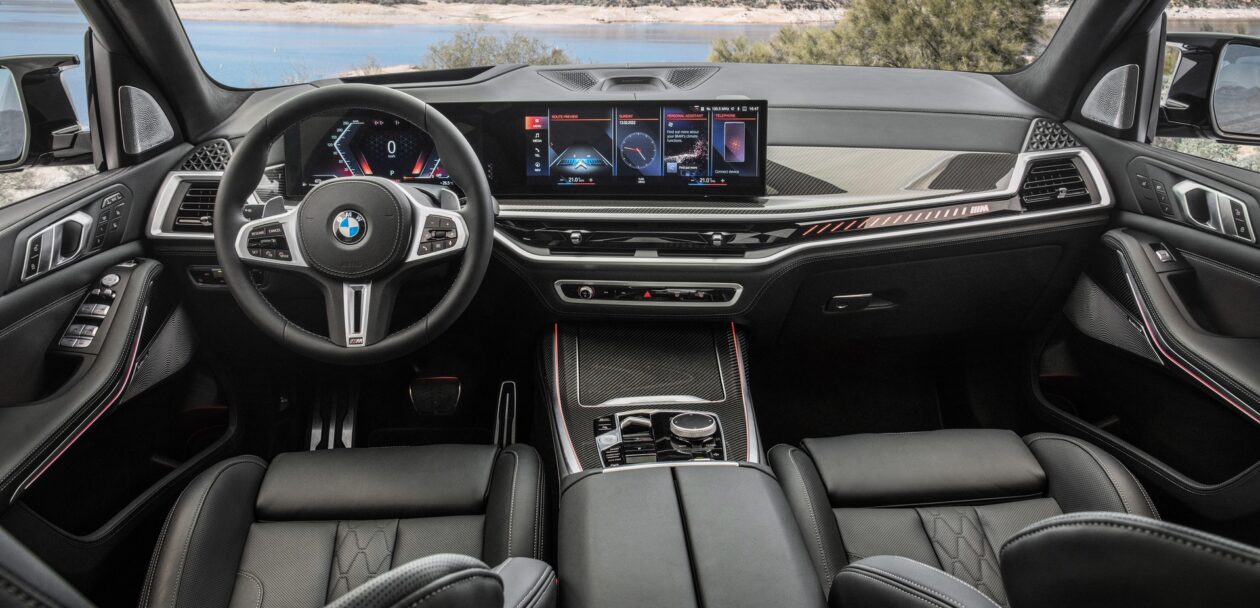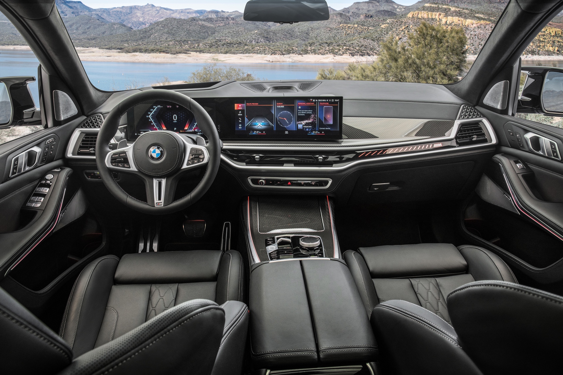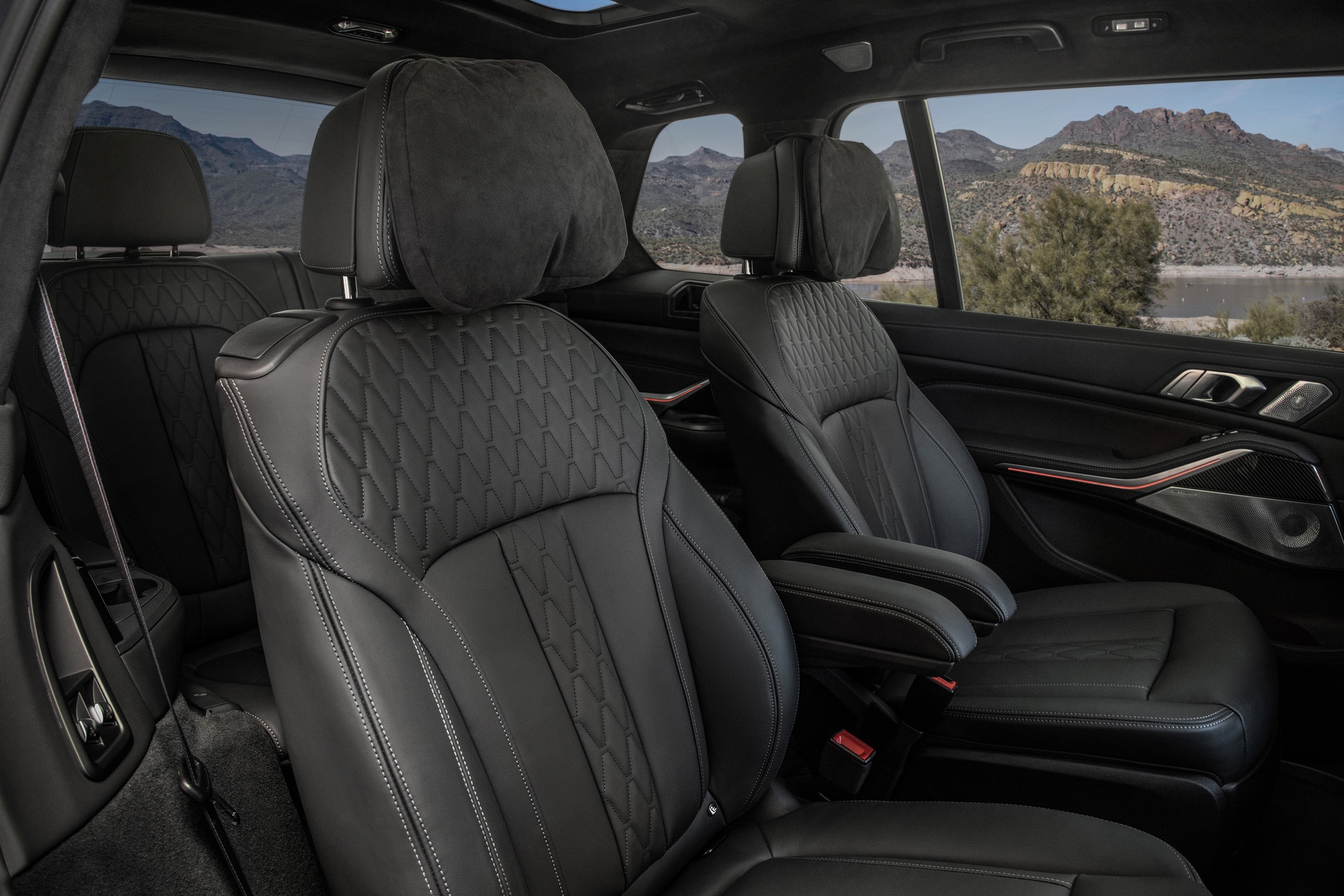 Stepping inside, you can immediately tell it’s the M60i by the namesake lettering on the illuminated door sills. Of course, BMW is installing plenty of M-branded goodies just about everywhere you look as even the ambient lighting and Alcantara headliner are M-specific. As standard, the top dog in the X7 family gets Extended Merino leather upholstery. At an additional cost, carbon fiber can be added, along with the retro BMW M 50 Years emblems.