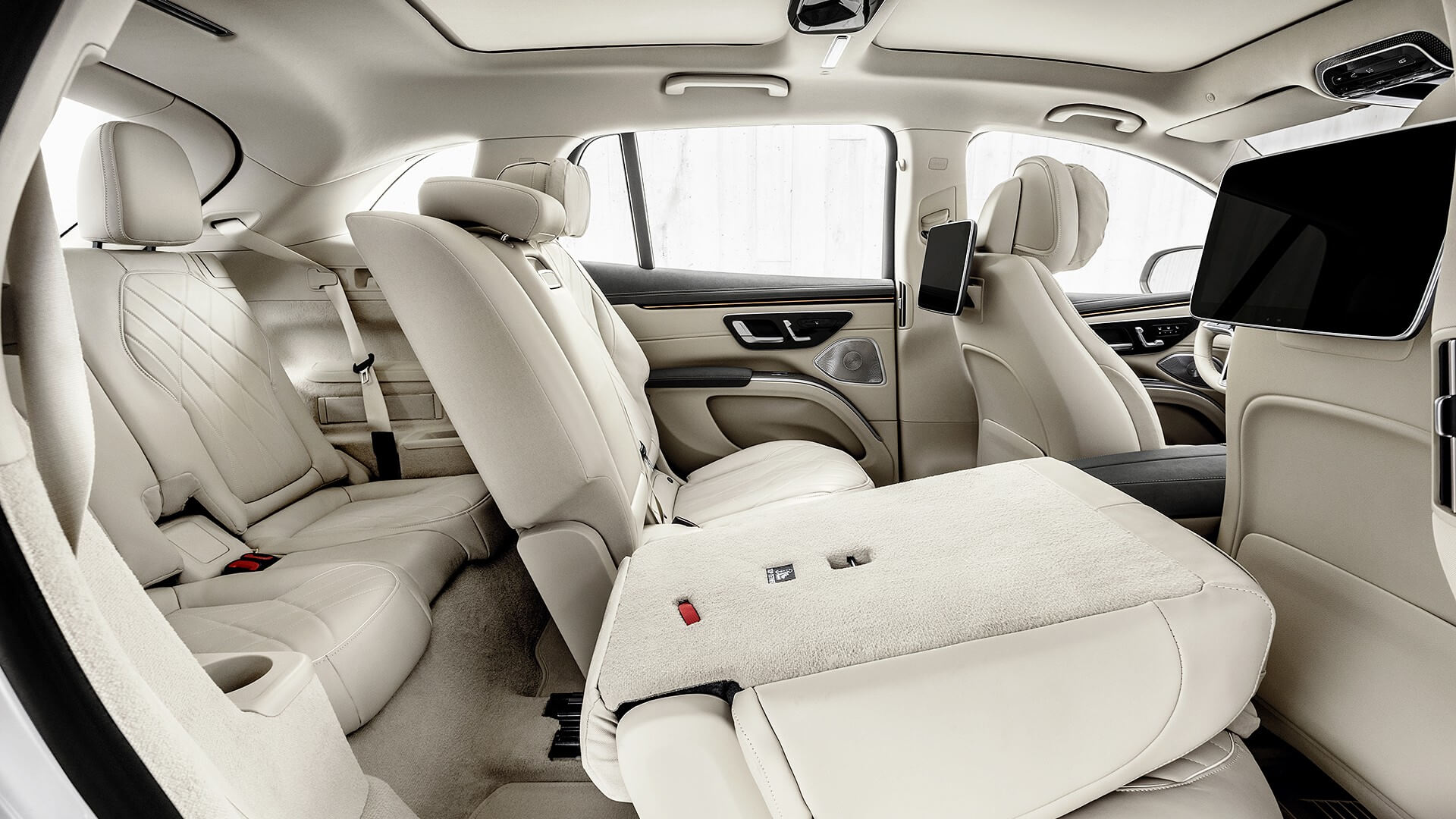 As the model’s name implies, it’s essentially an SUV version of the EQS, carrying over the hardware and technology. That means it shares the same massive 56-inch Hyperscreen with three front displays housed within a single piece of curved glass. As standard, it gets electrically adjustable second-row seats while those individual third-row seats will cost extra.