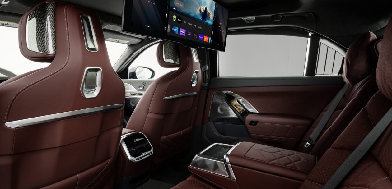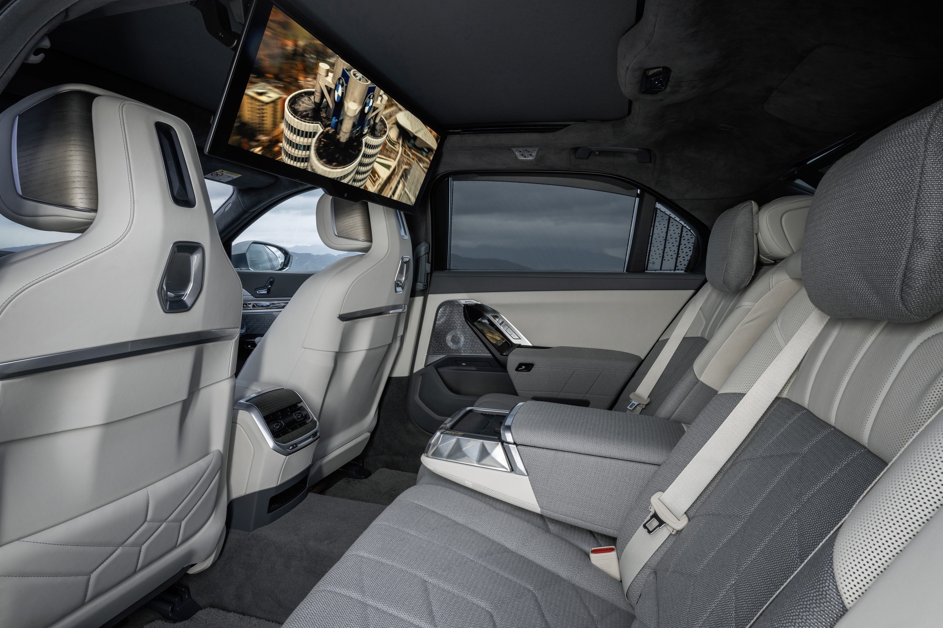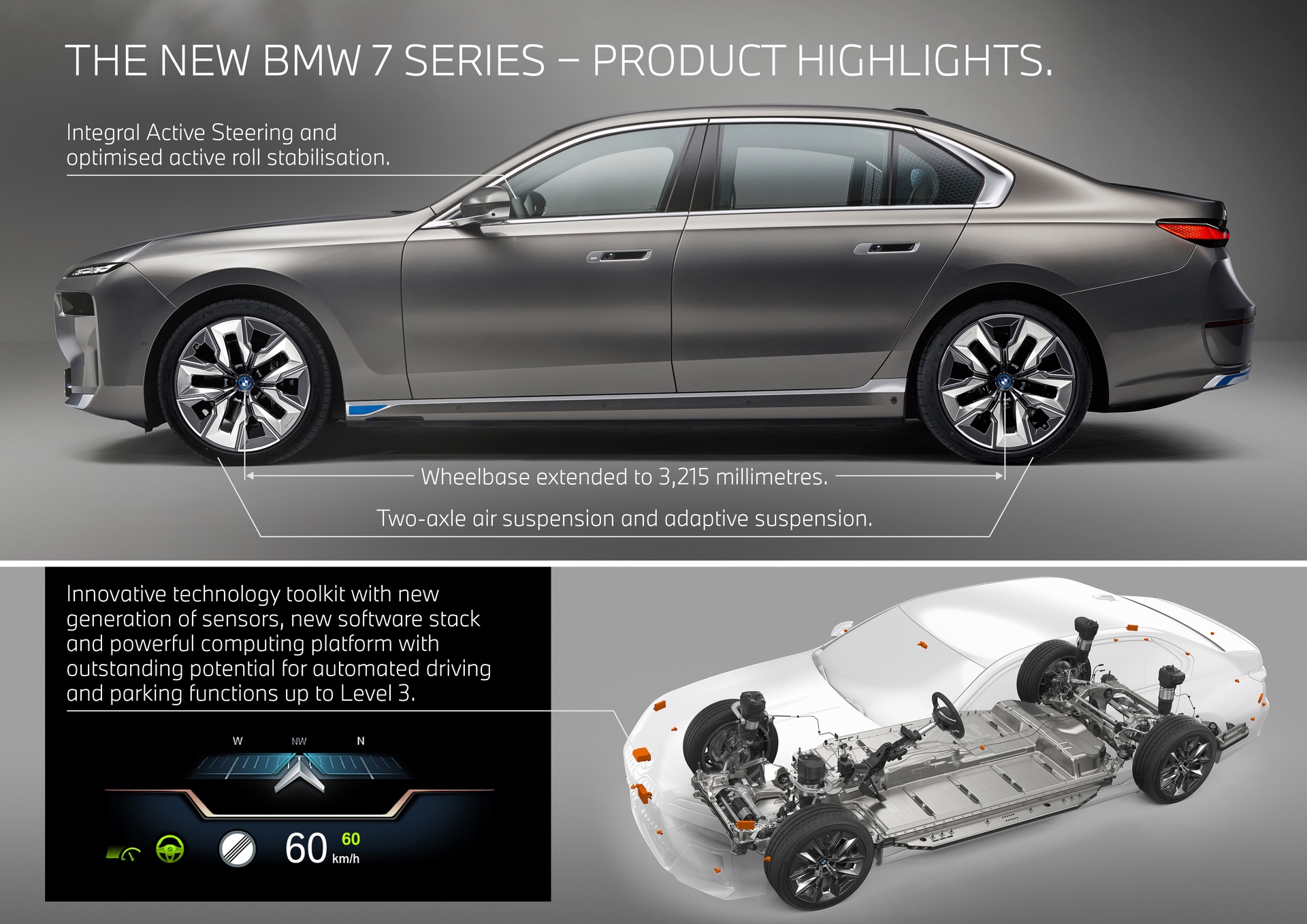It’s the first series-production BMW to get a two-tone Individual paint and rides on alloy wheels varying in size from 19 to 22 inches. Adaptive air suspension on both front and rear axles is standard, and so is rear-wheel steering with a maximum angle of 3.5 degrees. At low speeds, the rear wheels turn in the opposite direction to the front wheels to shorten the turning circle by 0.8 meters. At higher speeds, all four wheels turn in the same direction for greater stability.