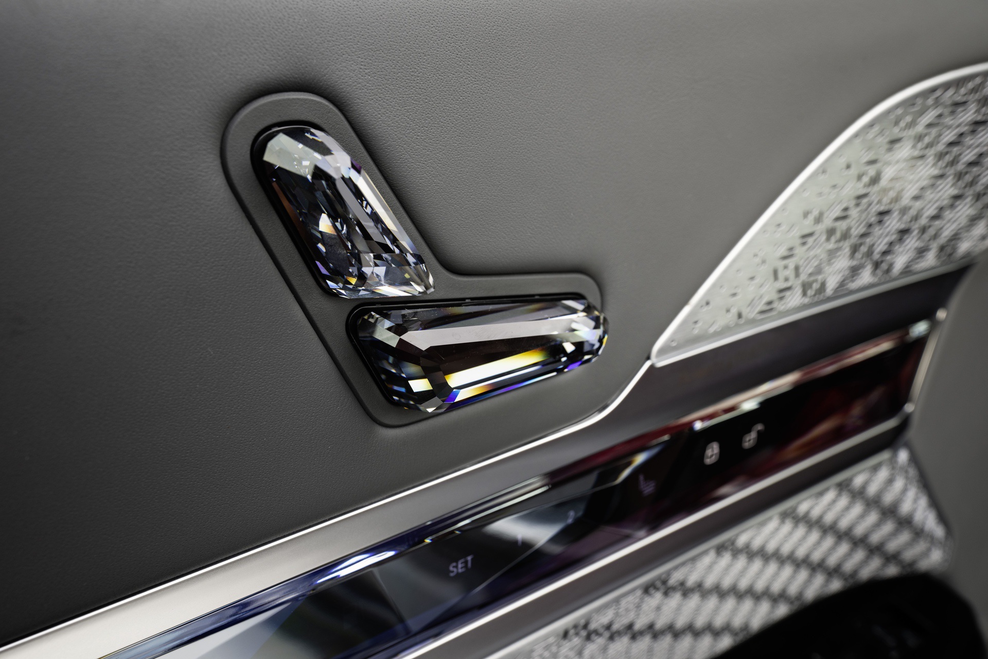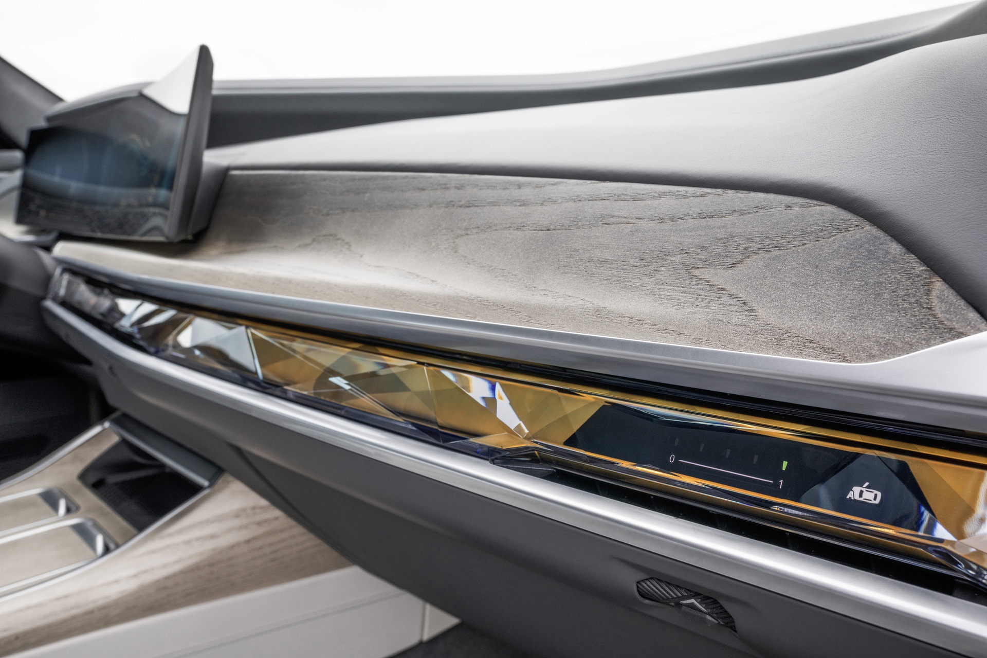High-end versions of the BMW 7 Series G70 will have fancy Iconic Glow headlights incorporating Swarovski crystals arranged in an “L” shape. Serving as the daytime running lights and the sidelights, these will be illuminated by 14 LED units. The lights do a little “dance” when you approach the car, accompanied by the light-up contour of the kidney grille. In addition, the lights built into the door sills project graphics onto the ground to greet the driver.