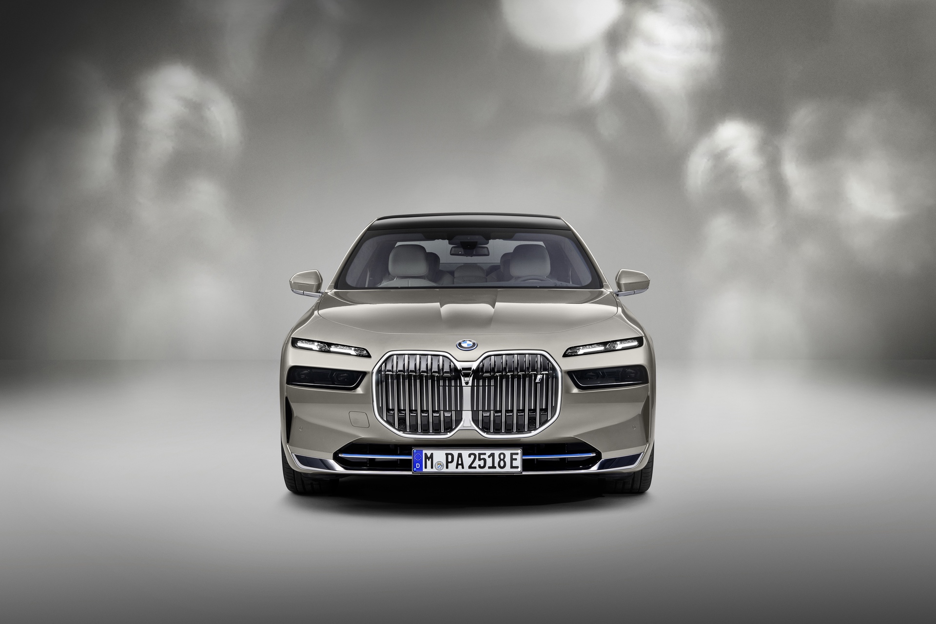 The main headlights are located below, almost hiding beneath a heavily tinted panel that might go unnoticed on a black car. This layout certainly gives the 7 Series a polarizing look, making it stand out compared to the Audi A8 and Mercedes S-Class. These quad lights flank a bigger-than-ever grille, which carries the letter “i” on the purely electric model.