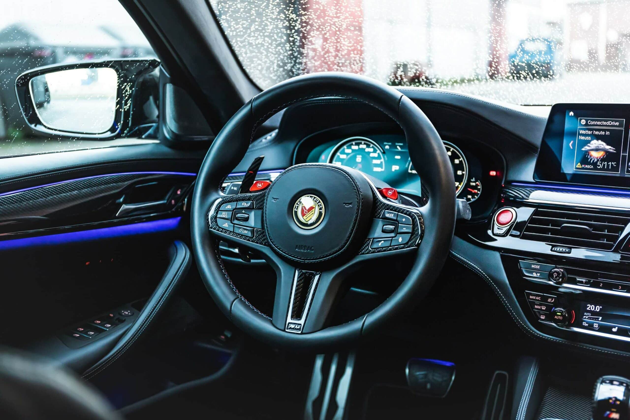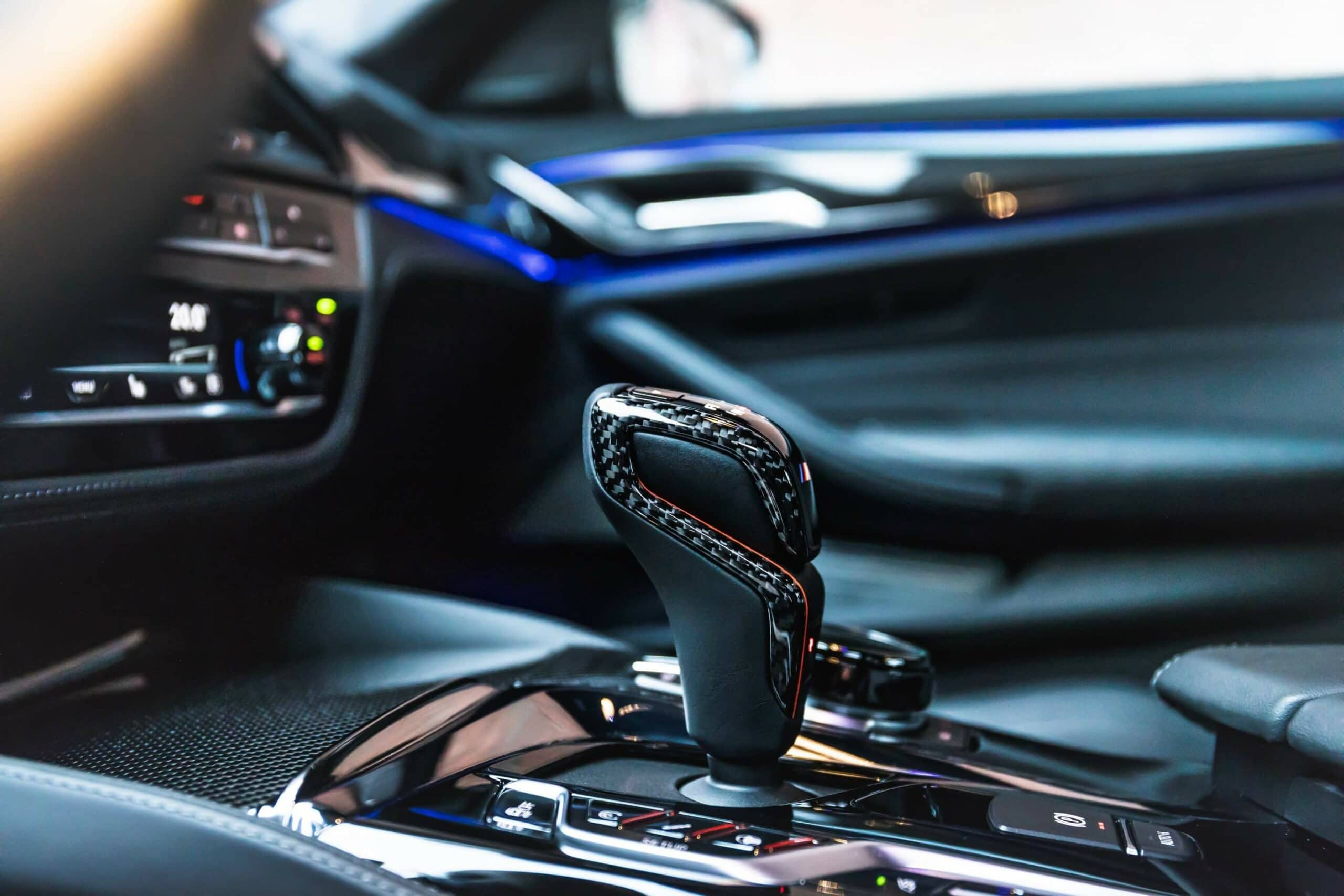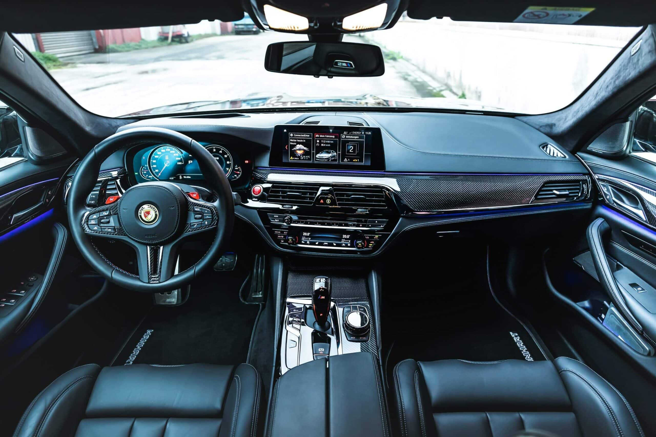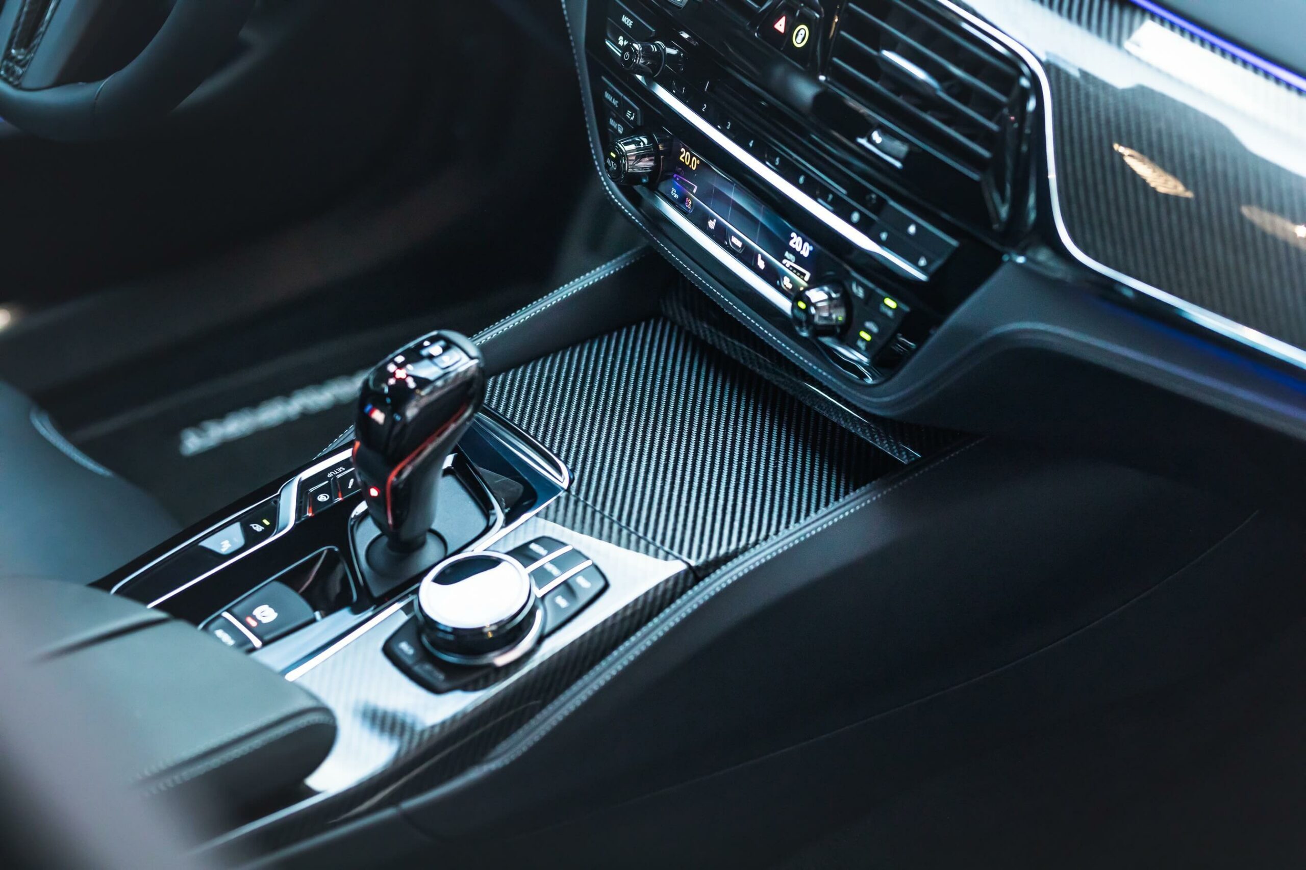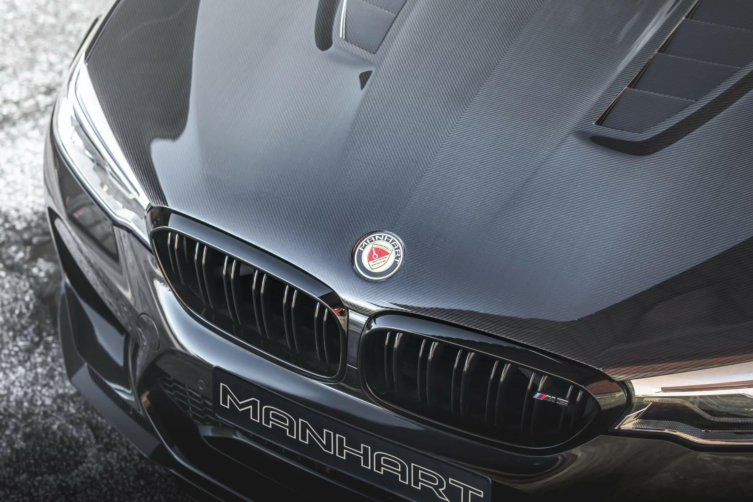 The carbon fiber theme continues inside where we notice the CRFP treatment for the shift paddles, door cards, and dashboard. In addition, Manhart applied it on the steering wheel and center console. Lastly, the floor mats proudly carry the tuner’s name just so you know who modified the M5.