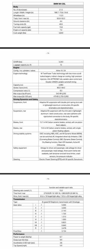 Speaking power, the M4 CSL’s version of the S58 engine–a 3.0 liter twin-turbo inline-six–makes 550 PS (543 horsepower) and 479 lb-ft of torque. That’s up 47 horses from the M4 Competition but has the same torque. Though, nothing crazy was done to make the extra power. Only a simple software tune and an increase in boost pressure were needed to get the desired 550 horsepower, as the S58 is already a pretty advanced engine by itself. Just don’t expect any wild carbon fiber air intakes or asymmetrical intake ducts, like the E46 M3 CSL had.