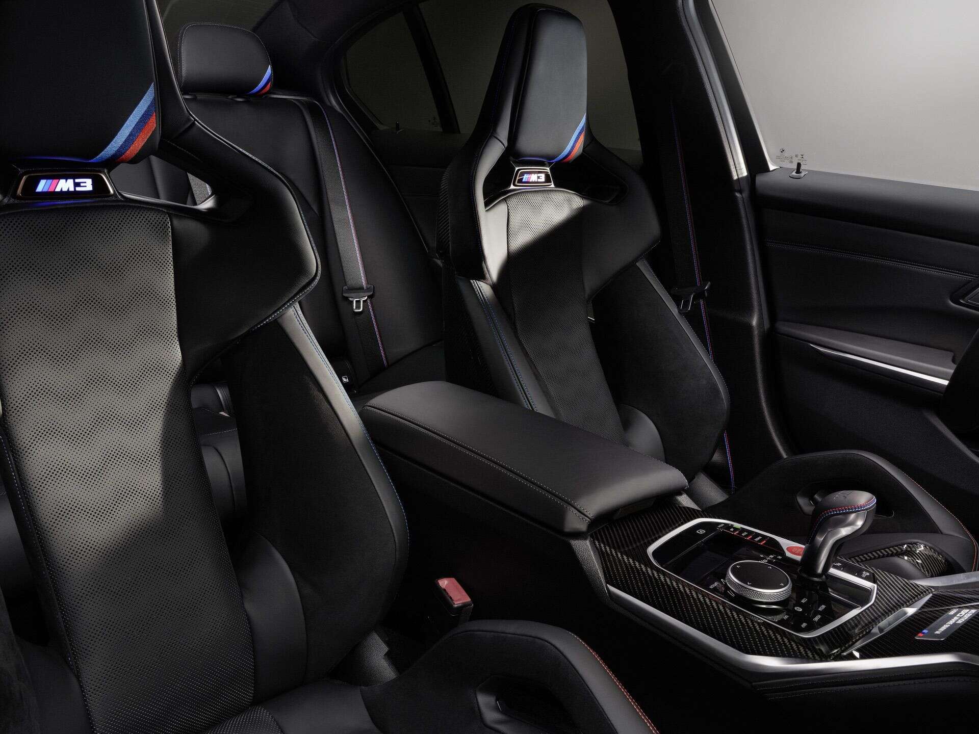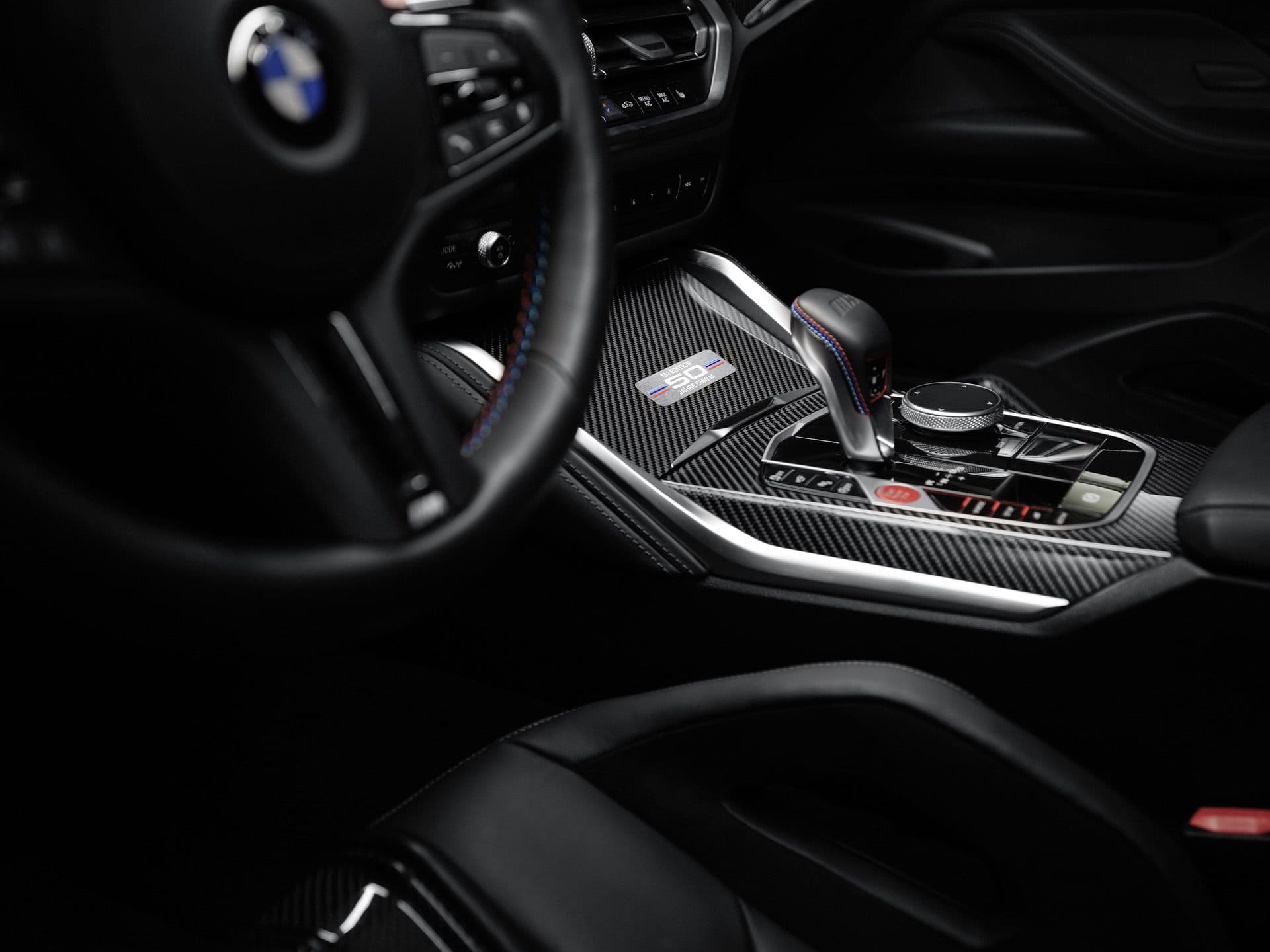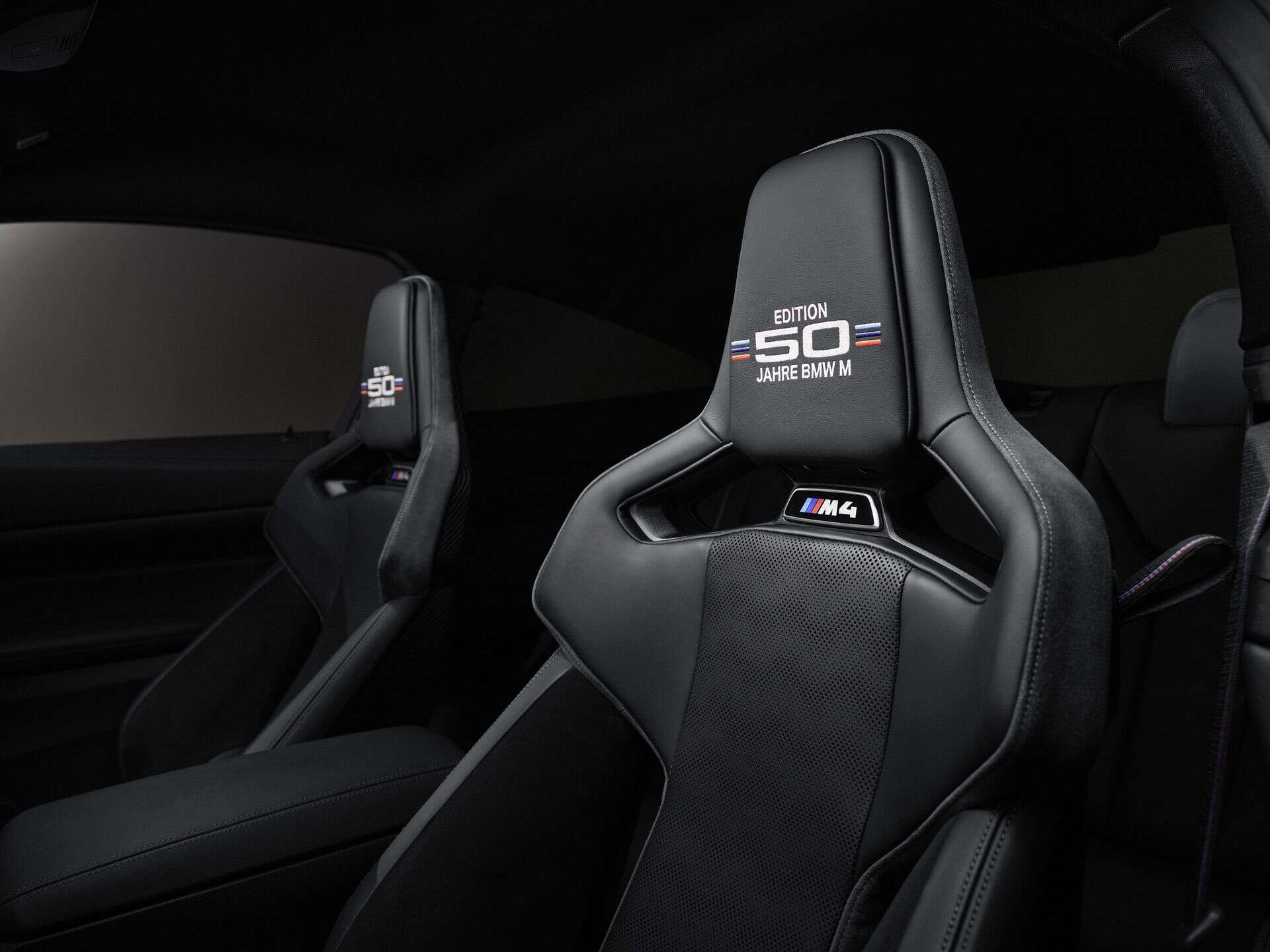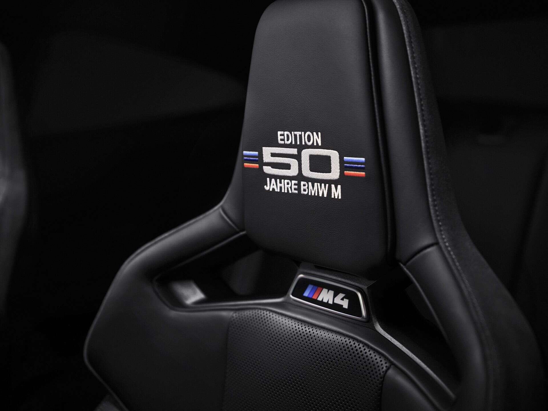 Inside, the door panels bear the lettering “Edition 50 Jahre BMW M”, a metal plaque on the center console with the lettering “M4 Edition 50 Jahre BMW M” and a corresponding imprint on the headrests of the seats.