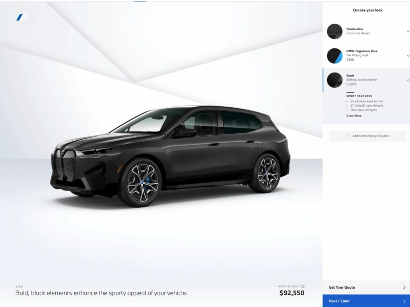 We have three “design” options as well – Shadowline, BMW i Signature Blue, and Sport. Shadowline is a zero-cost option and the car looks pretty sporty, but I’d spend the $2,800 for the Sport appearance package. It makes the iX look a lot more aggressive and also adds dark clear tail lights, which I think look a lot better than the standard ones.