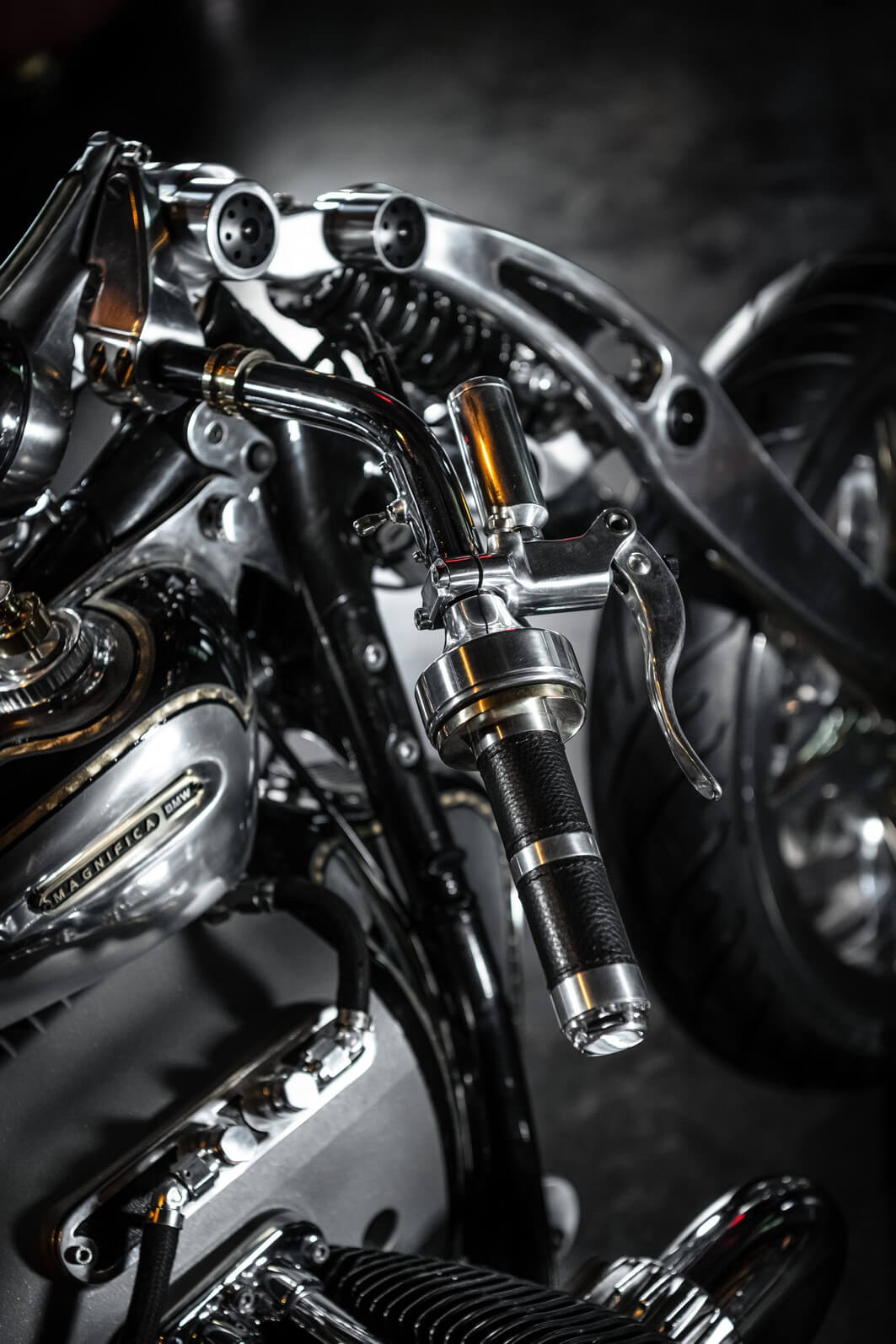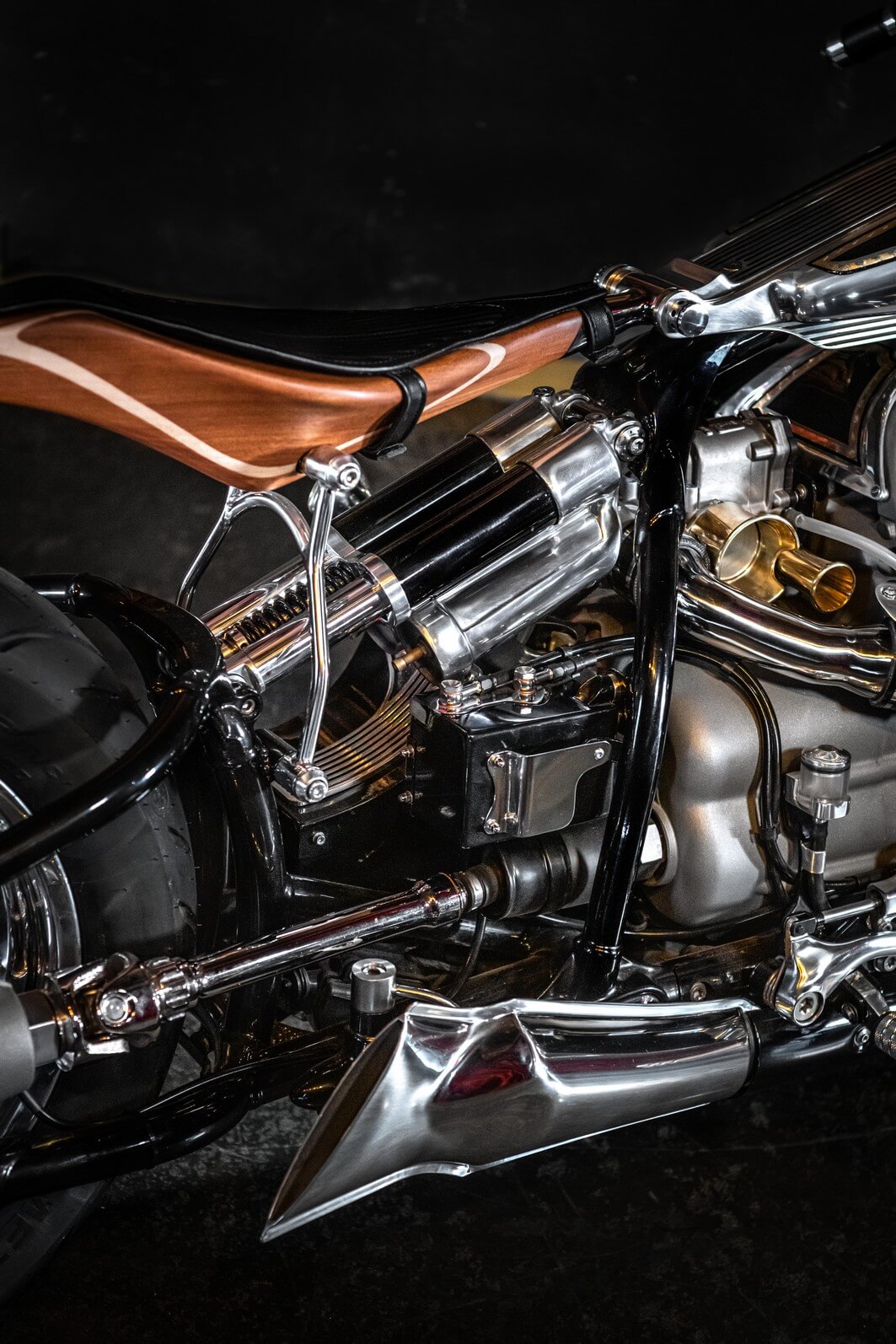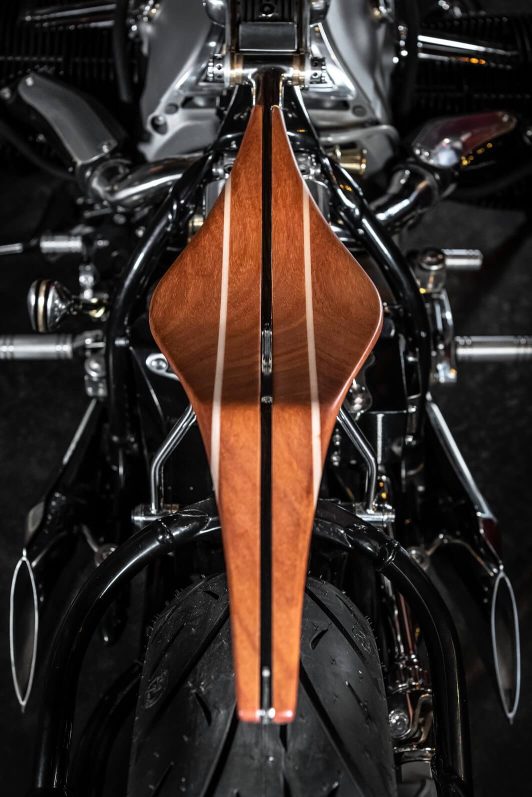 Not only does the R18 Magnifica look great, but all these changes have also objectively improved the bike since its weight has been reduced to 260 kilograms (573 pounds). That’s a significant diet of 85 kg (187 lbs) compared to the donor bike.  Also worth noting is that the tail and seat are one-piece suspension while the mahogany rear end with a polished stainless steel center section is a classy touch.