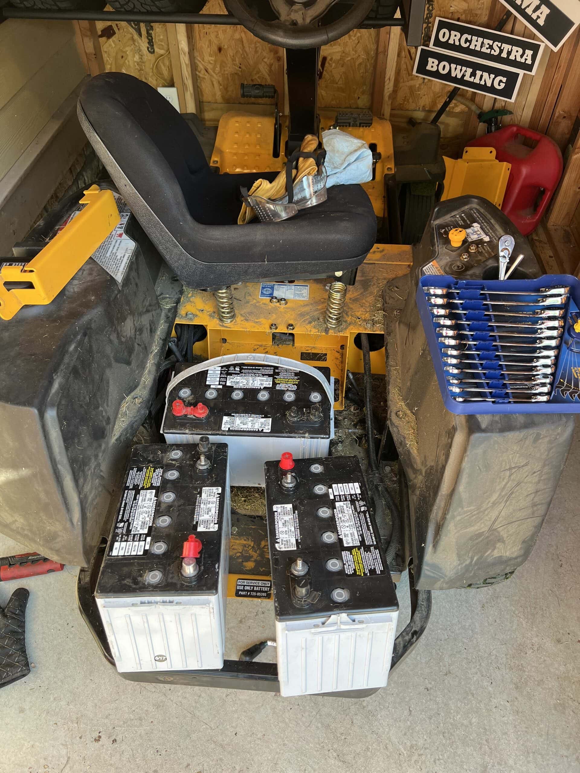 First step is figuring out how to remove these old batteries from the electric lawn mower. Thankfully the manufacturer had published a tech manual online for dealerships. I could read and follow the entire instructions on removing the old batteries and how to install the new ones. Much to my amazement, the layout was incredibly simple. There are four 12 volt batteries aligned in series. The positive end of one battery flows into the negative of the next one and so on. The only trick part was figuring out how to get the last battery under the seat. After a few busted knuckles, I’ve got them all out.