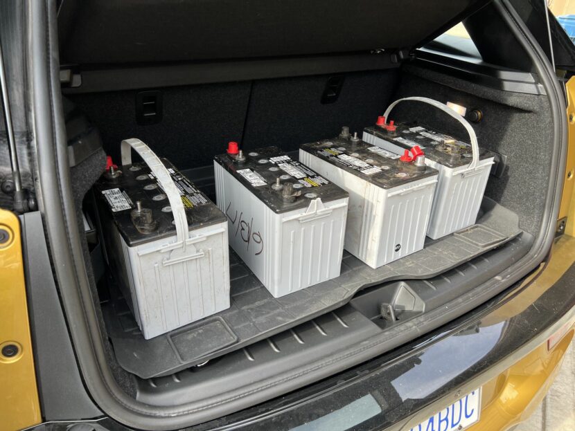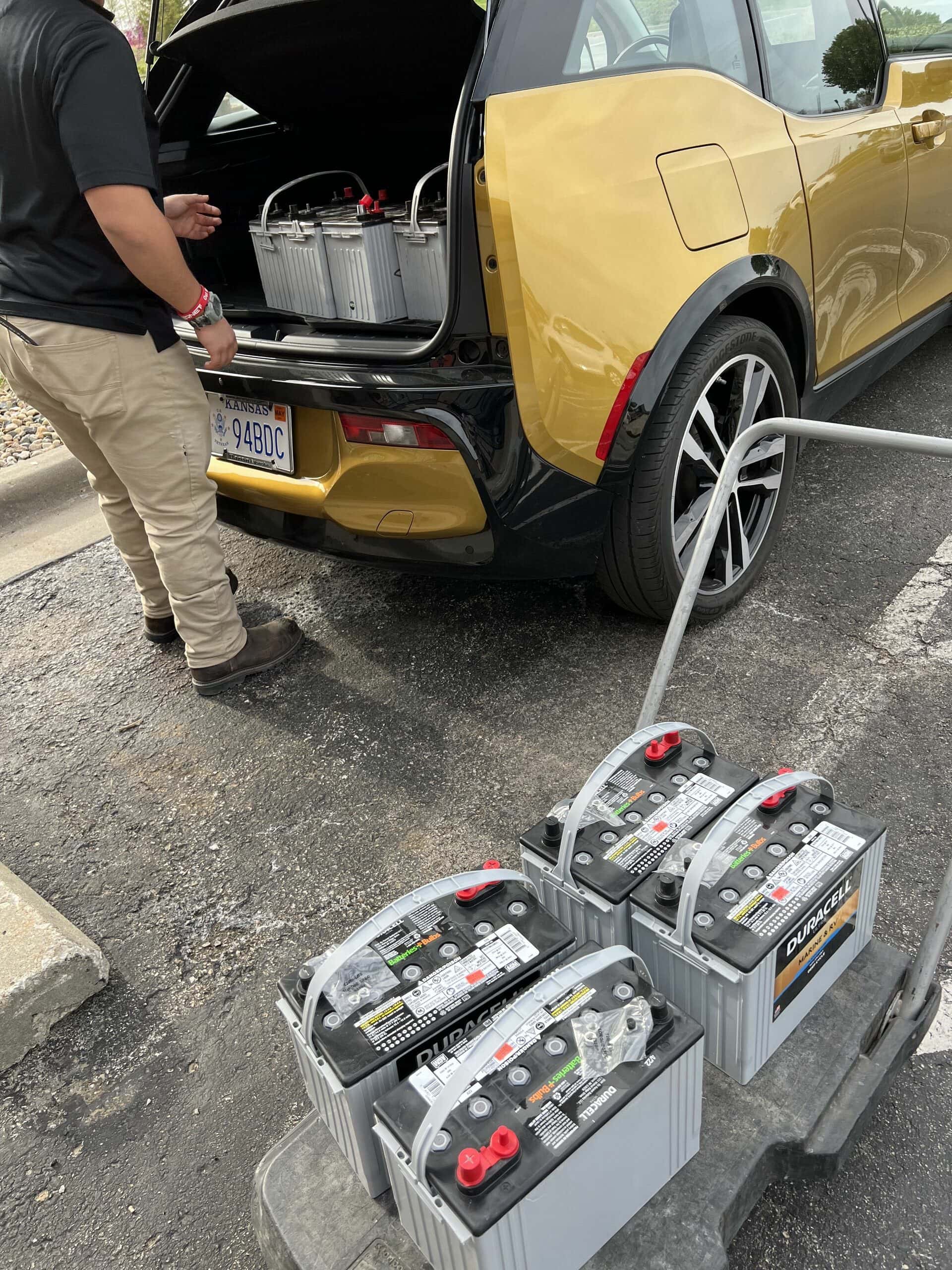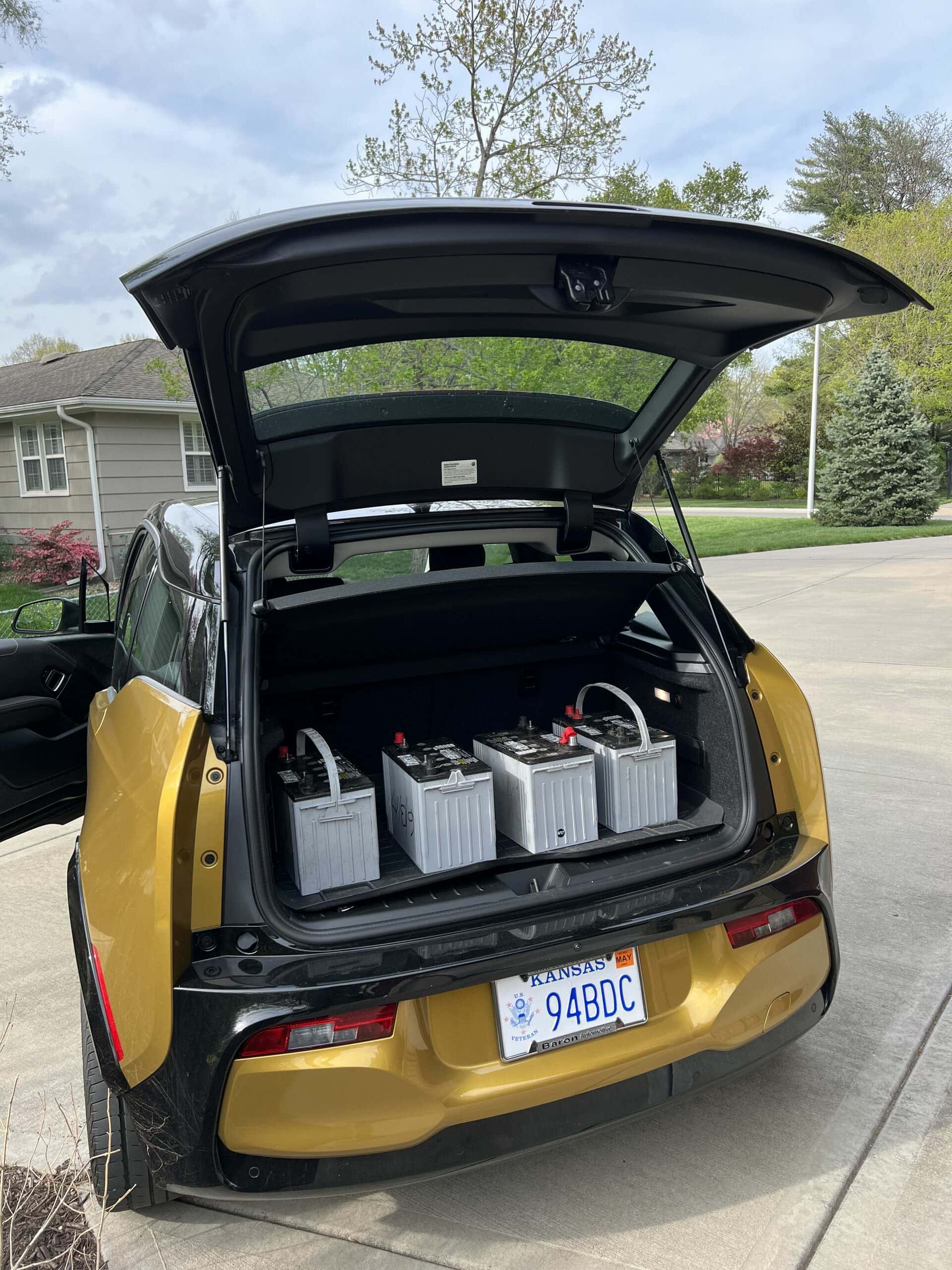 The next day, I loaded the four old super heavy old batteries in the trunk of my BMW i3. The high trunk of the i3 made loading these heavy batteries easy on my back. I was also thankful to have the WeatherTech Trunk liner to place the batteries on. The trunk mat held the batteries securely and gave me peace of mind to protect the carpet, even though these are sealed batteries.