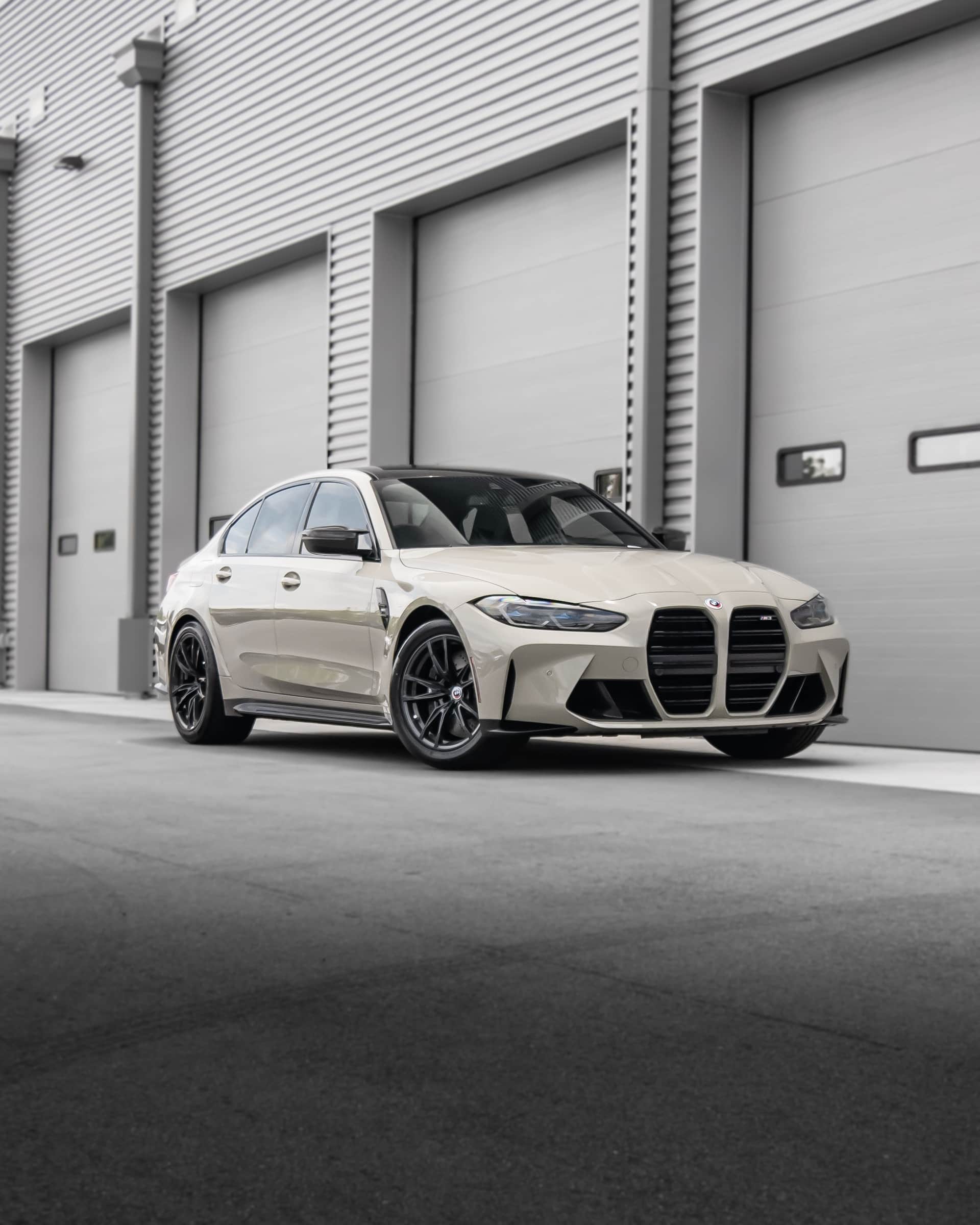 According to colors.rs, Fashion Grey is a vintage Porsche paint going all the way back to the 1950-53. Some BMW customers describe Fashion Grey as having a green hue in darker light conditions while looking very light under the sun. The exterior of this BMW M3 G80 exhibits a change in hue depending on which angle you are viewing it from. And you can easily see that in the photos below.