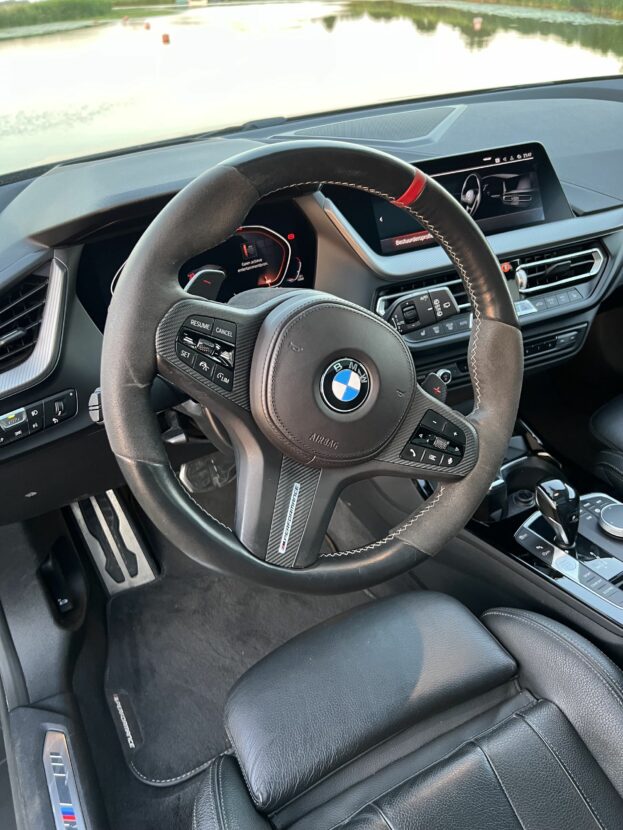 The M Performance parts on this particular car included the new exhaust with carbon fiber tips, carbon fiber polished mirror caps, side diffusers and 19 inch performance wheels. There are also larger front and rear diffuser. The rear roof diffuser is much more aggressive and comes with a subtle M Performance decal. This particular 2022 BMW M135i even had an M Performance Steering wheel with carbon fiber inserts and a red stripe at 12 o’clock position. The M Performance front clip features aggressive front dive planes. Next, the side skirts are very similar to the M Performance ones used on the new G82 BMW M4.