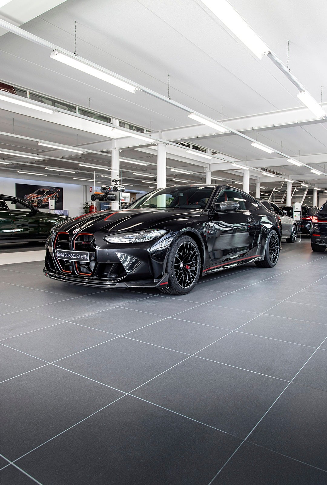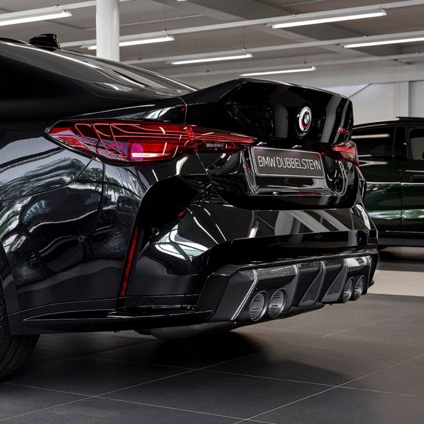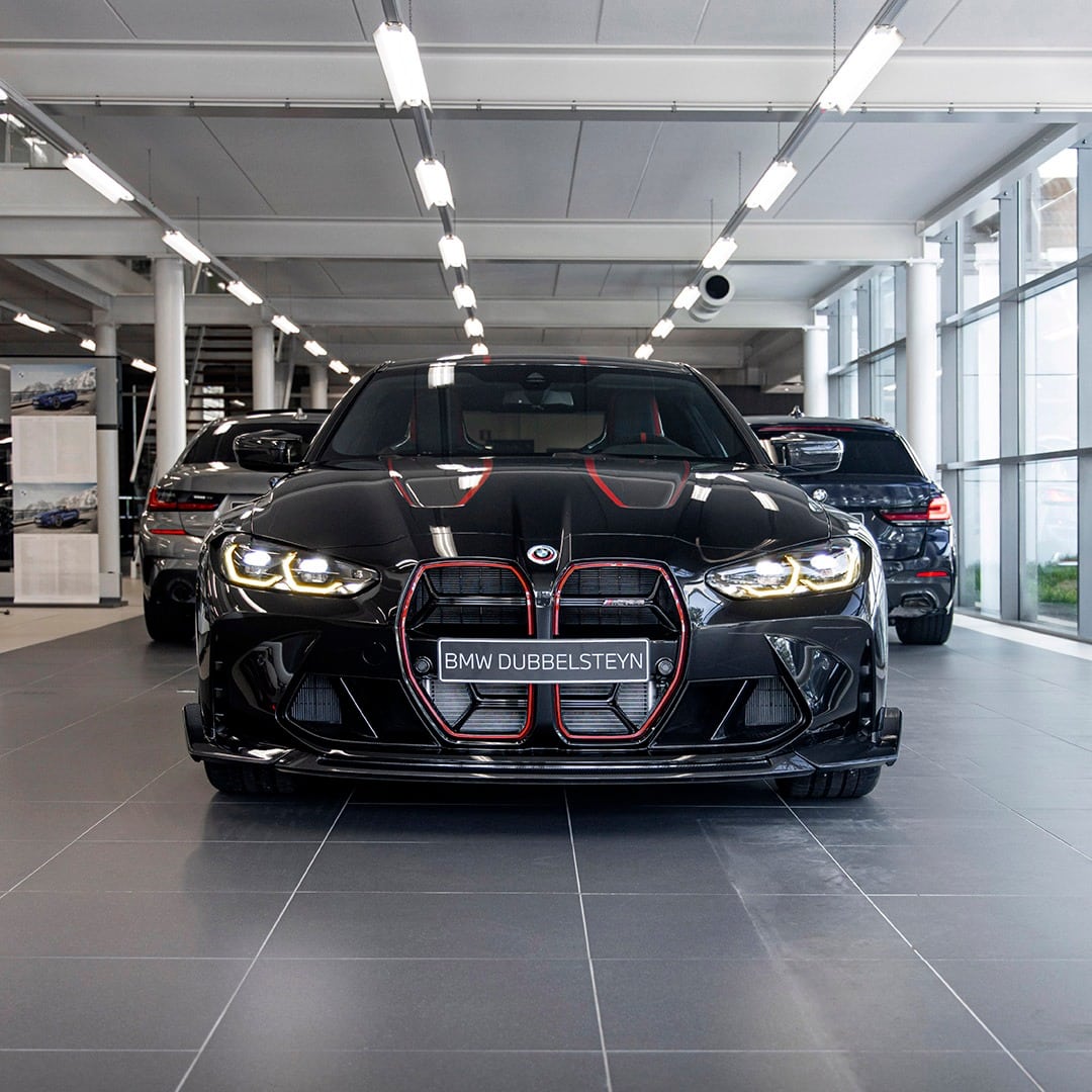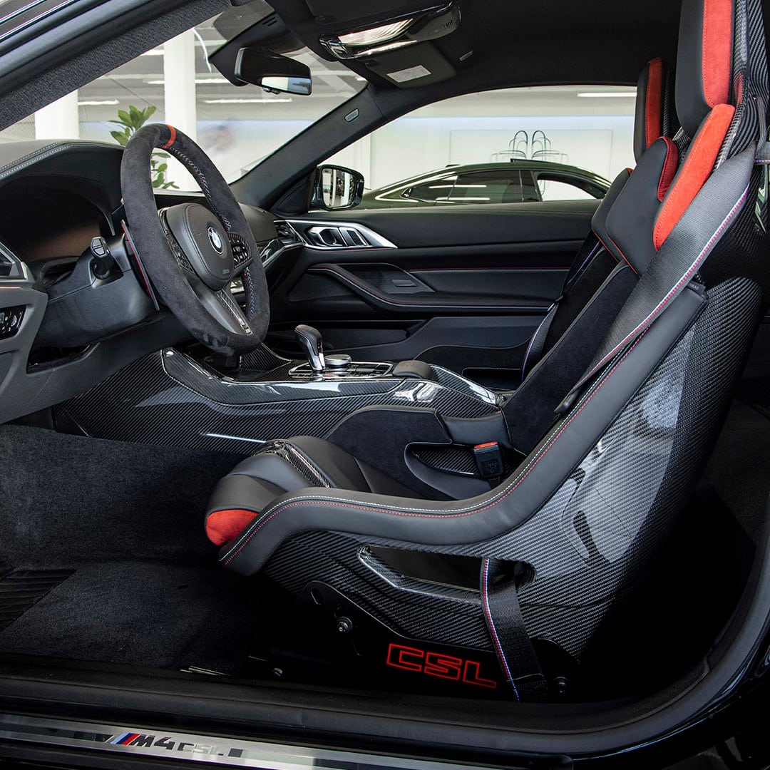 The M4 CSL showcased by Dubbelsteyn – BMW & MINI has a full leather Merino black interior with loads of carbon fiber and bucket seats. As with all CSLs based on the G82 generation, it does away with rear seats in an effort to shave off as much weight as possible. Compared to a regular rear-wheel-drive M4 Competition, it has lost a whopping 100 kilograms. Those bucket seats save about 24 kg while removing the rear ones has shaved off 21 kg.