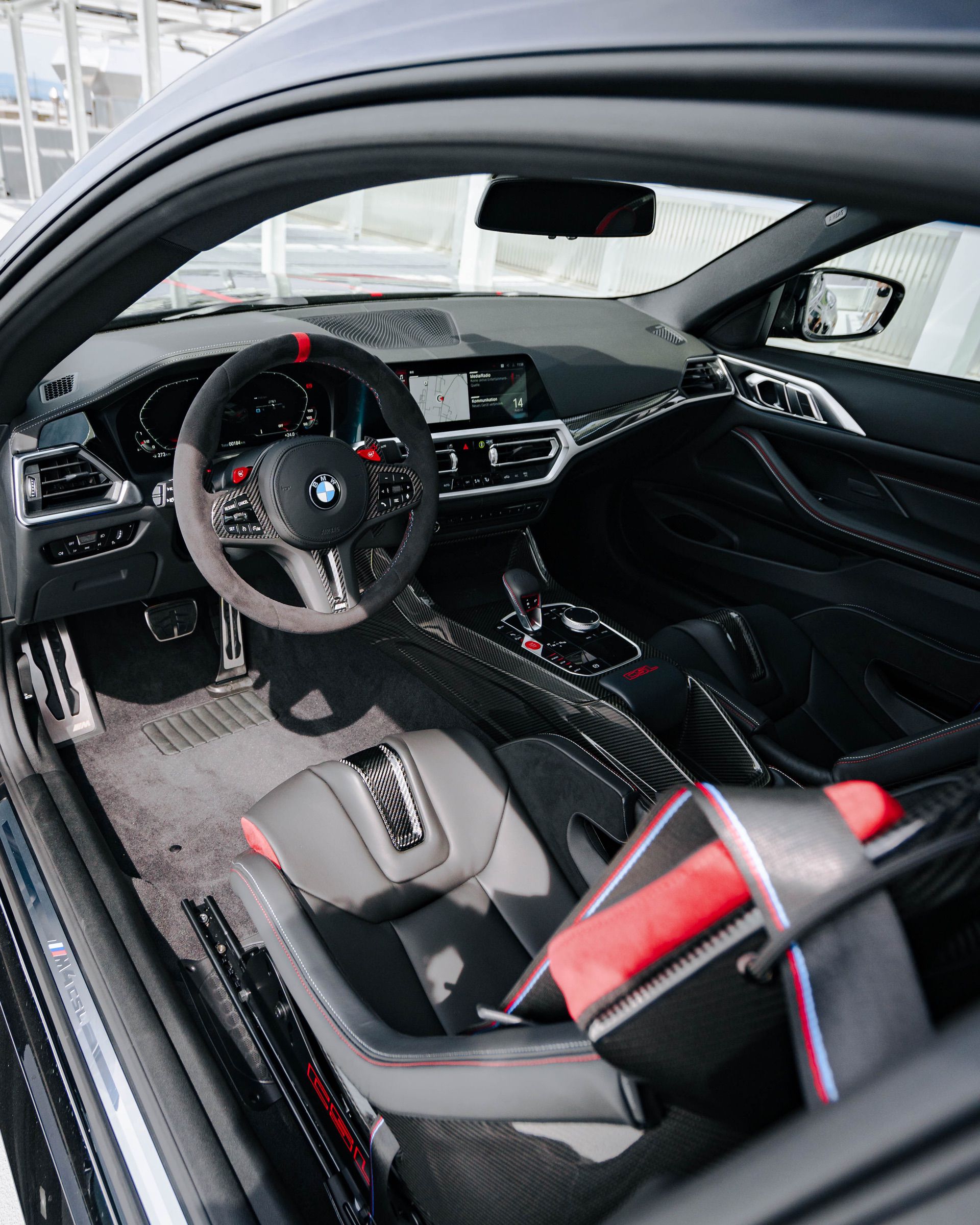 Same goes for the inside, where the cabin is almost entirely black, except for little bits of red trim and stitching here and there. The red can be found on the seats, the seatbelts, the “CSL” badge, and on the steering wheel. The wheel is Alcantara but gets a red 12 o’clock stripe, to add some pop. The only other color throughout the entire cabin is the subtle blue stripe on the seatbelts, to round out the M colors.