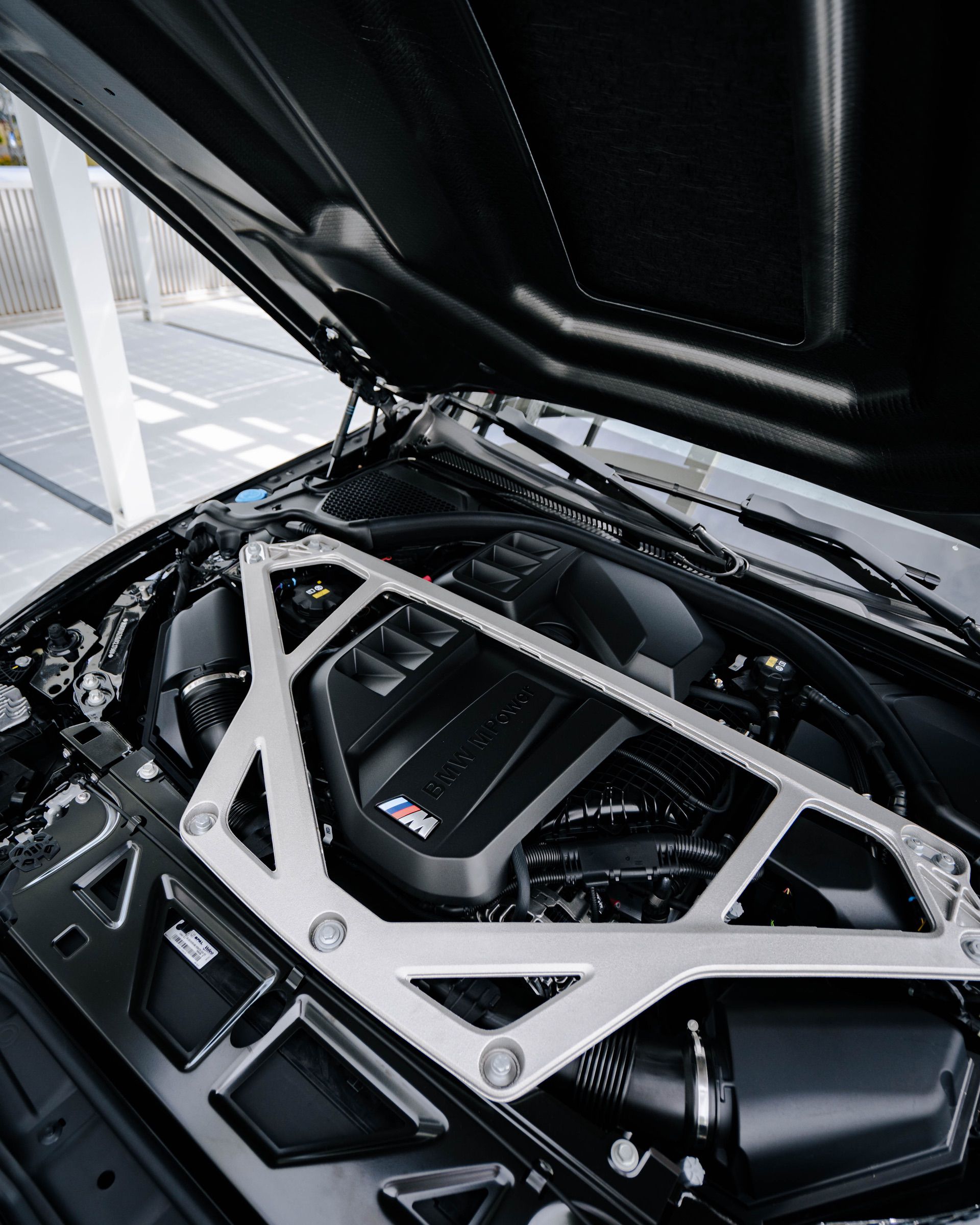 Seen here in this new photo gallery, the BMW M4 CSL is in Black Sapphire Metallic but it keeps the same grey hood stripes and red pin striping as every other CSL. So it has a very aggressive, menacing look. Those red accents are on the hood, on the side skirts, on the roof, and even on the badges. And because this car has all black wheels, those bits of red are the only flashes of color.