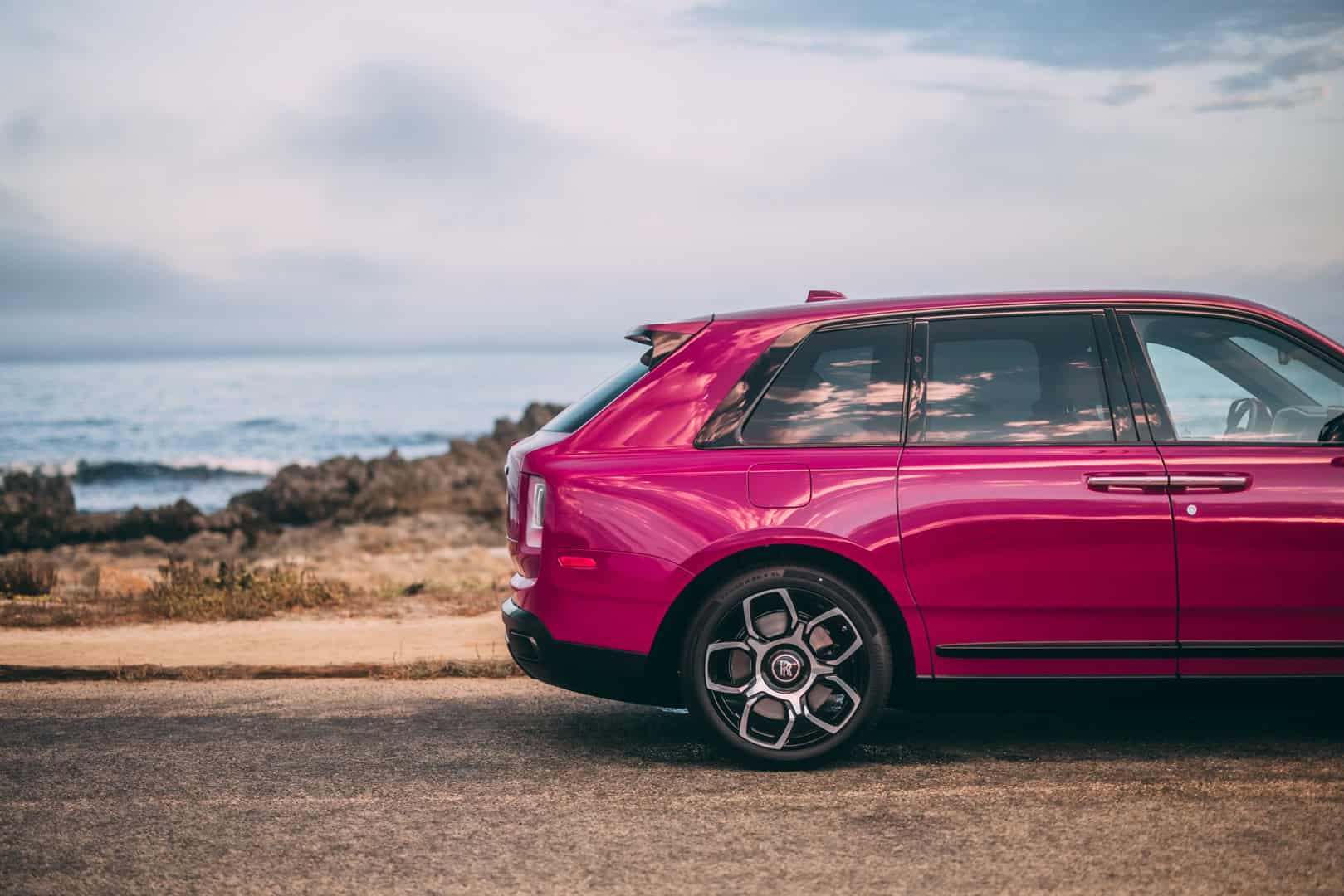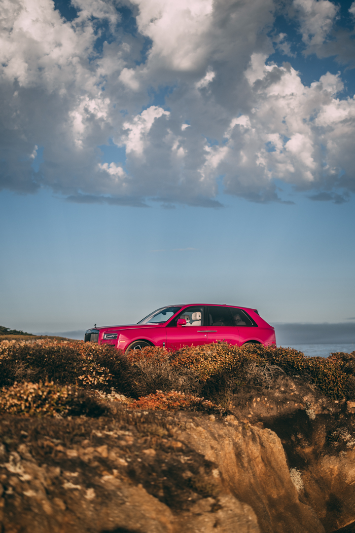 Interestingly, the Rolls-Royce Cullinan is a Black Badge model. Typically, Rolls shows off BB models in dark, brooding color schemes. However, this Pebble Beach Cullinan is a lovely vibrant shade of pink, with the Grace White interior leather. The white leather also gets Lime Green stitching, which is pretty fun. It’s cool to see such a bright color combination to contrast the black trim and badges of the Cullinan Black Badge. The best part is seeing the darkened Spirit of Ecstasy standing atop the pink hood, creating a great looking contrast. It also wouldn’t be a Rolls without special luggage and this Cullinan gets unique Peony Pink leather for its luggage, a first for Rolls.