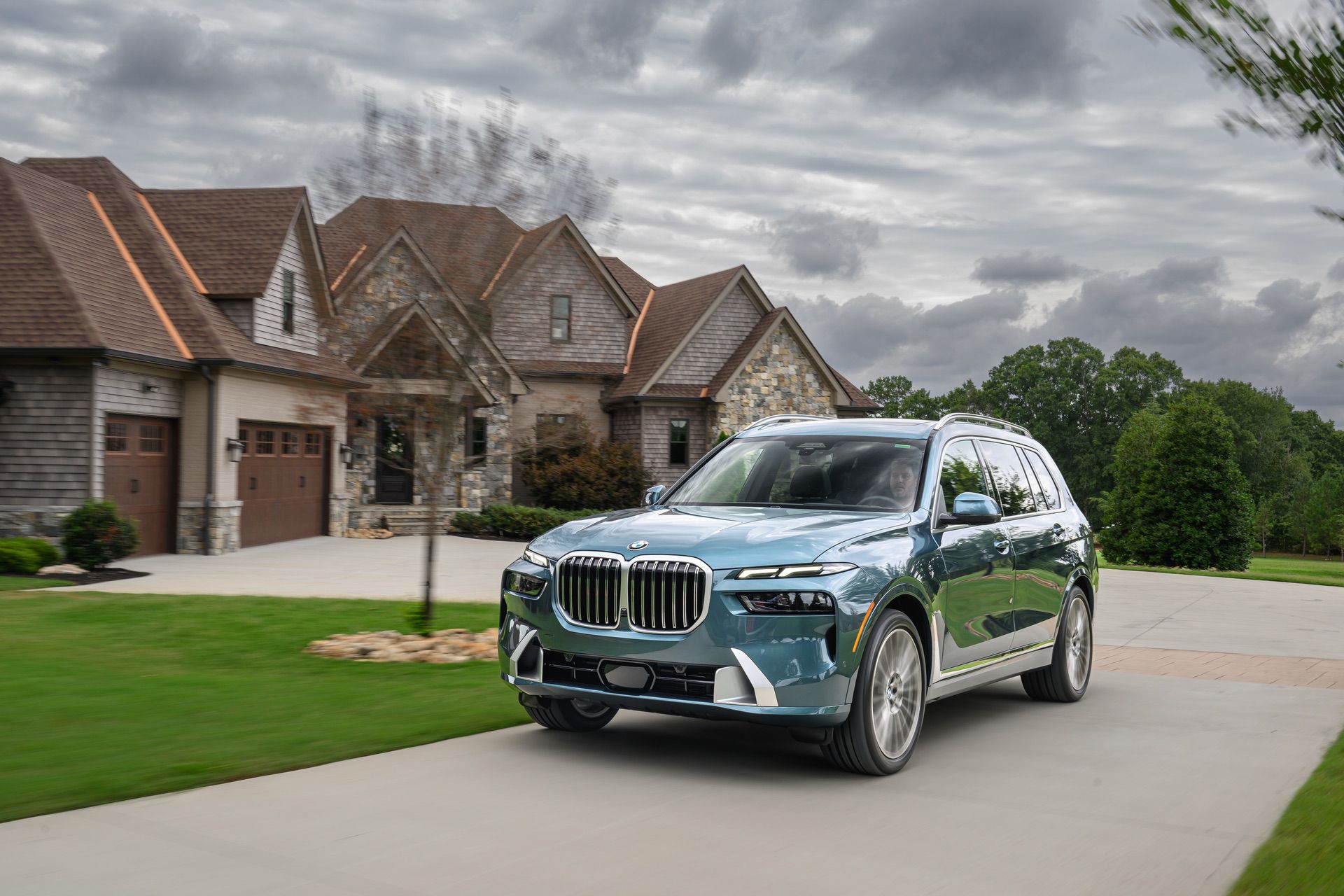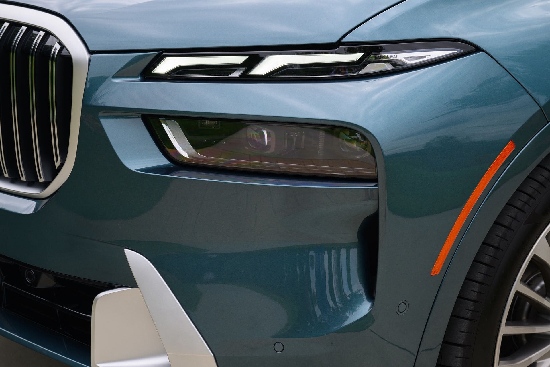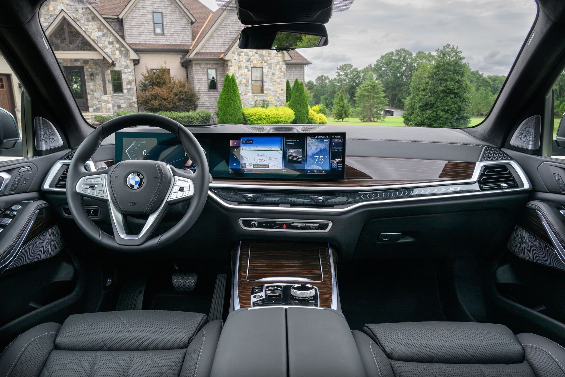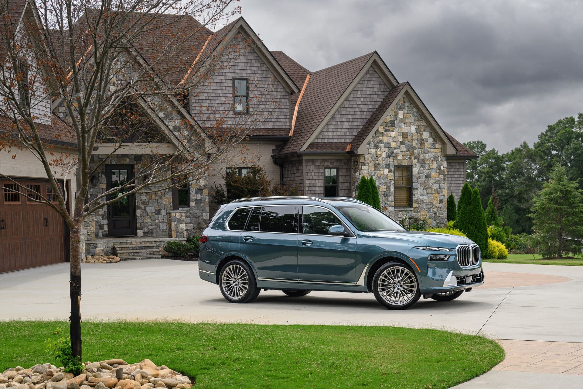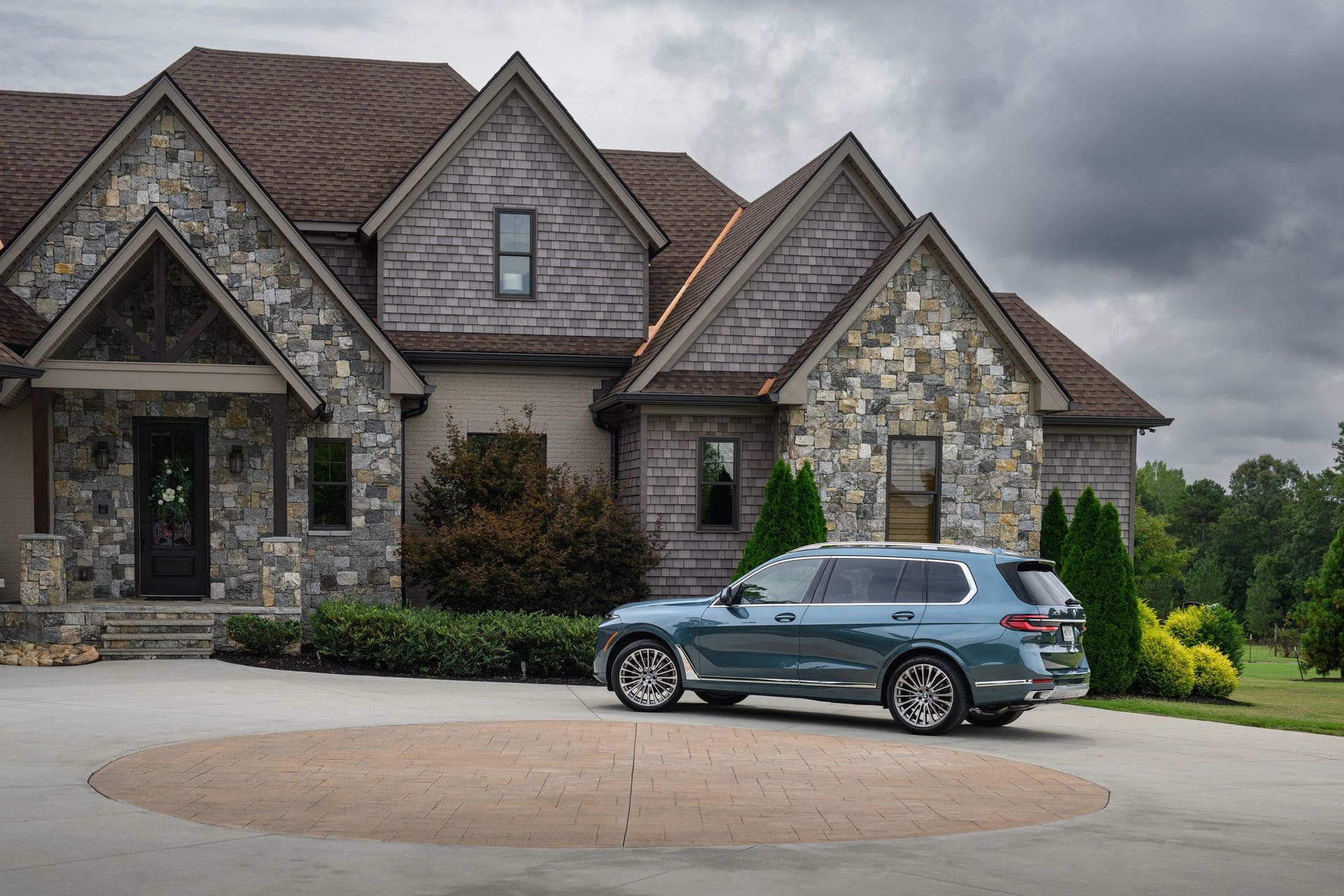 The BMW X7 in this photo gallery is wearing a Blue Ridge Mountain Metallic paint, which is named after the Blue Ridge Mountain range that runs near BMW’s Spartanburg, South Carolina plant. It’s a pretty color that works well with the X7’s enormous size. Inside, it’s black with wood accents and all of the X7’s new tech.