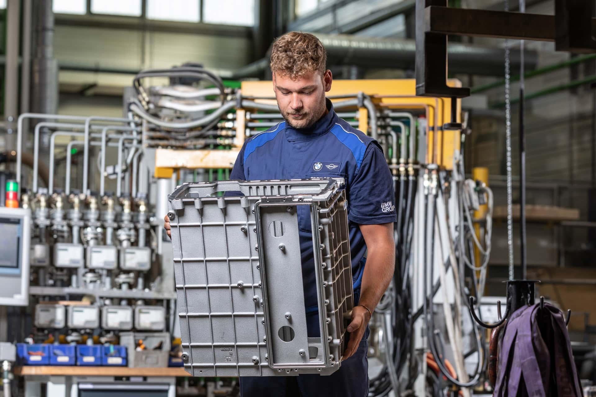 Stacking of the fuel cells is a fully automated process. Once the individual components have been inspected for any damage, the stack is compressed by machine with a force of five tonnes and placed in a housing. The stack housing is manufactured in the light metal foundry at BMW Group Plant Landshut using a sand casting technique. For this, molten aluminium is poured into a mould made from compacted sand mixed with resin in a process specially designed for this small-series vehicle. The pressure plate, which delivers hydrogen and oxygen to the fuel cell stack, is made from cast plastic parts and light-alloy castings, also from the Landshut plant. The pressure plate forms a gas-tight and water-tight seal around the stack housing.