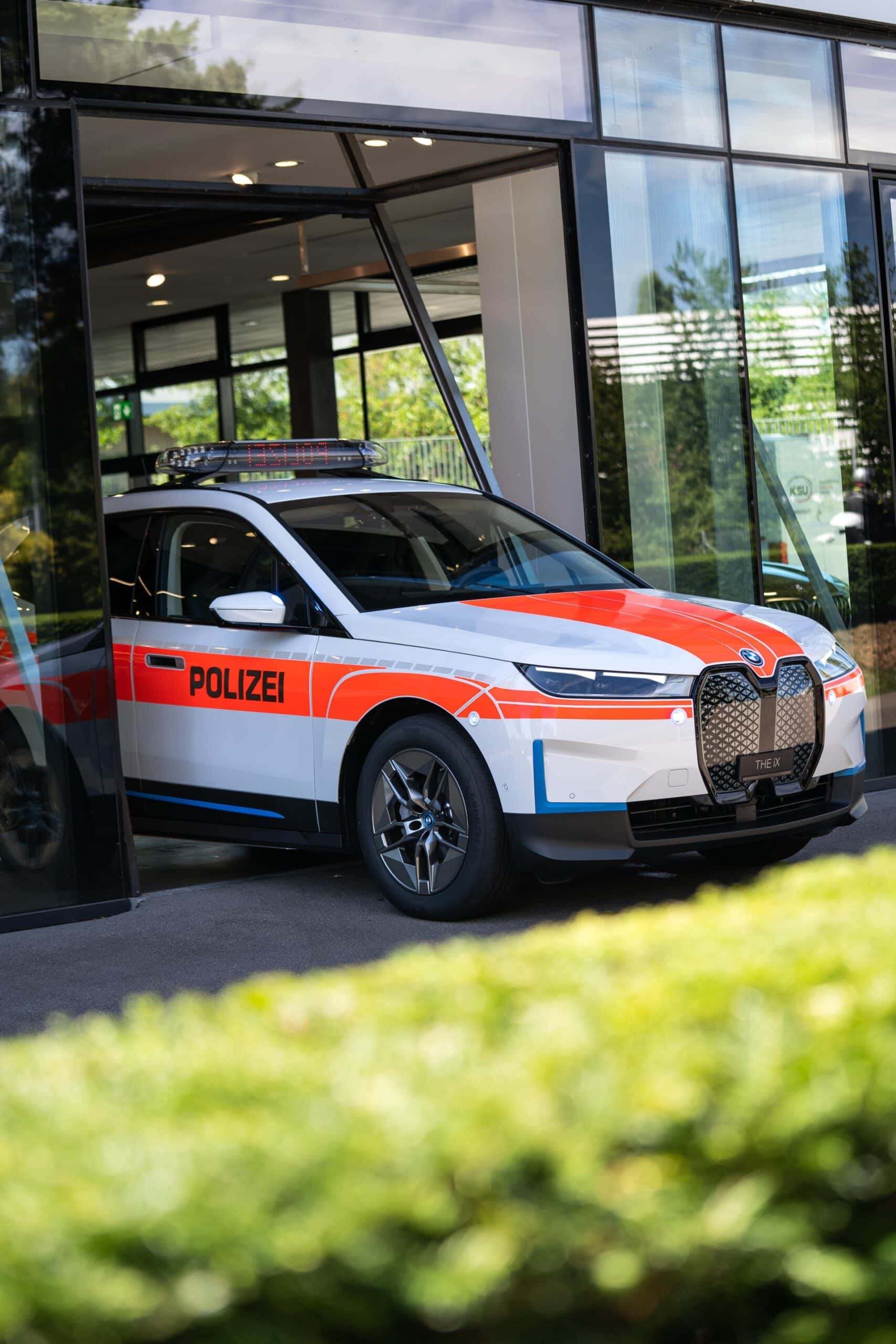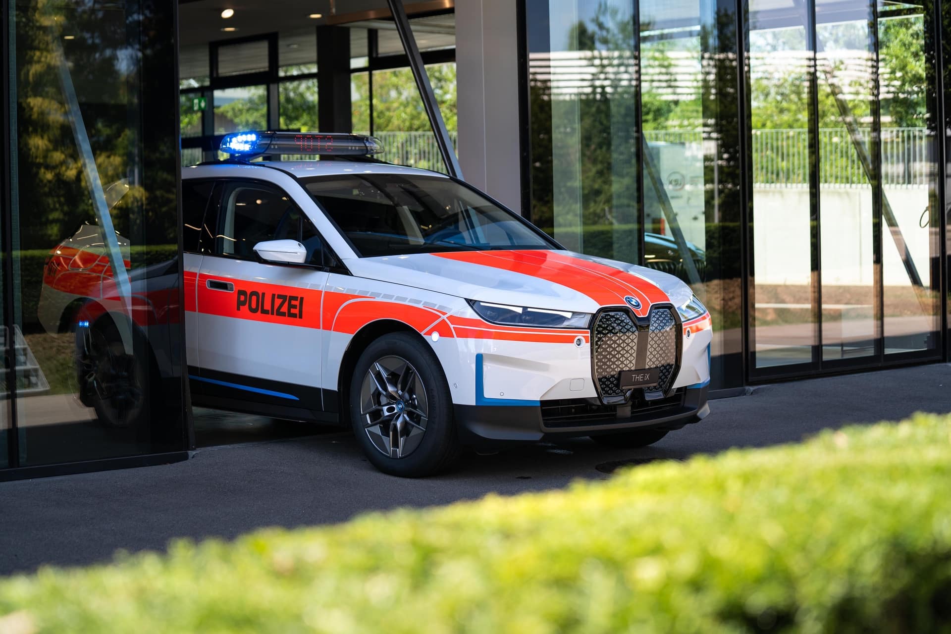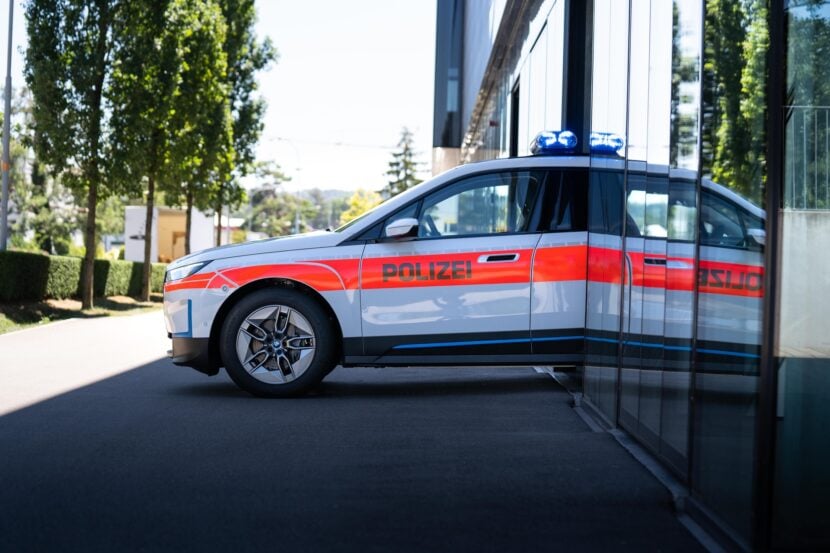 BMW Switzerland delivered today the world’s first BMW ix Police Car. The electric crossover was specially converted for police use. In addition to the vehicle decals, designed according to police specifications, the BMW iX Police Cars include a roof beam system with a lightning module on the exterior. A stop signal matrix provides traffic information such as “STOP, POLICE”, “ACCIDENT” or “PLEASE FOLLOW”.