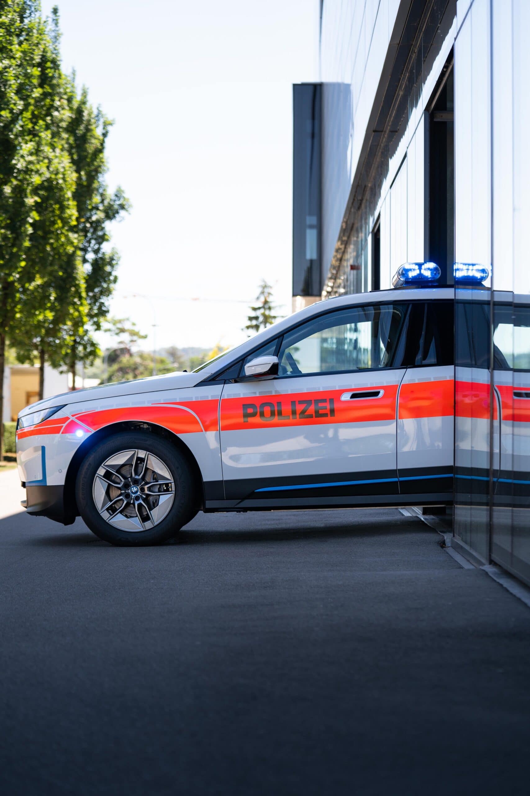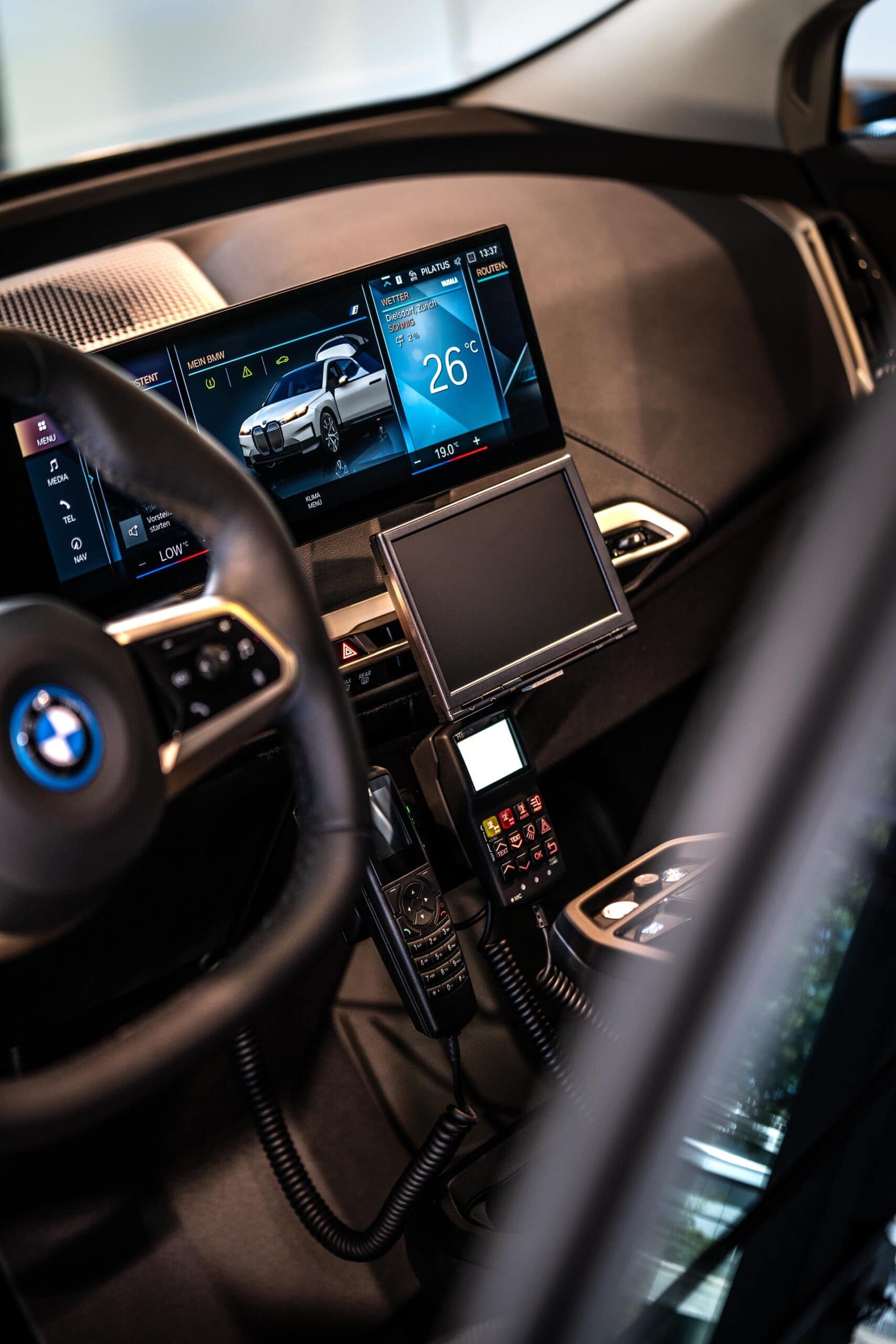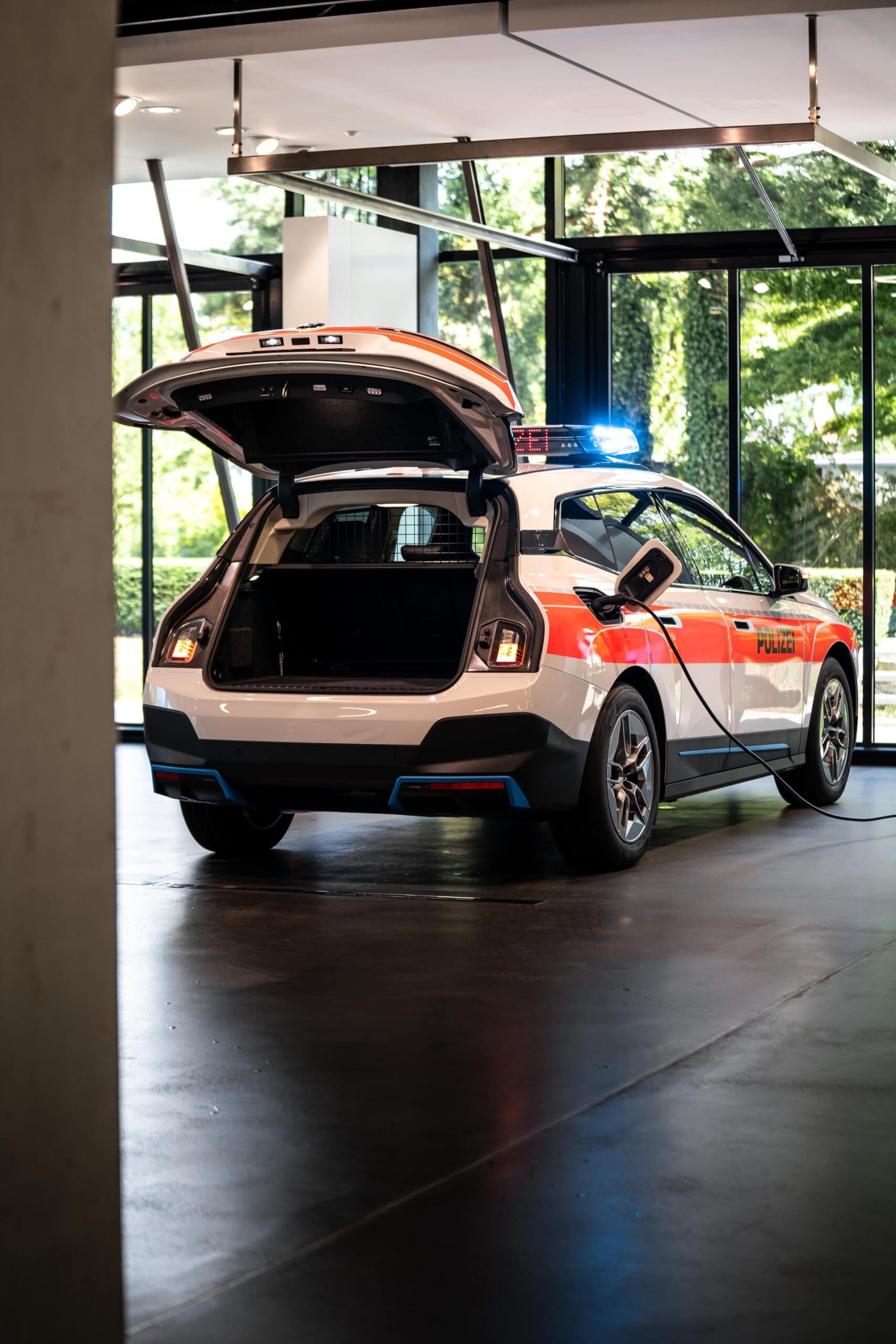 BMW Switzerland delivered today the world’s first BMW ix Police Car. The electric crossover was specially converted for police use. In addition to the vehicle decals, designed according to police specifications, the BMW iX Police Cars include a roof beam system with a lightning module on the exterior. A stop signal matrix provides traffic information such as “STOP, POLICE”, “ACCIDENT” or “PLEASE FOLLOW”.