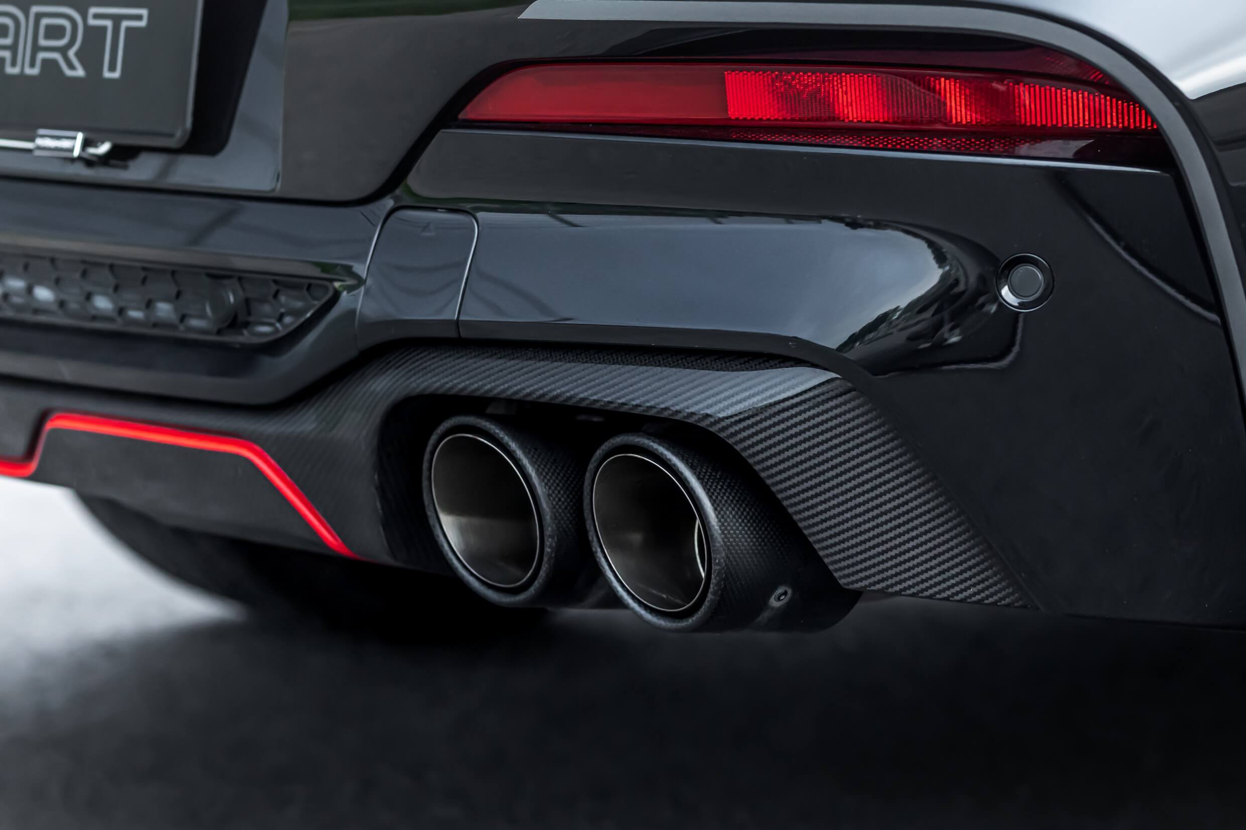 The suspension has been revised by bringing the vehicle closer to the road by 30 millimeters (1.18 inches) after installing H&R springs. In addition, Manhart developed an eight-piece body kit made from carbon fiber to give the coupe-SUV a more aggressive appearance without straying away too far from the standard design.