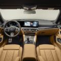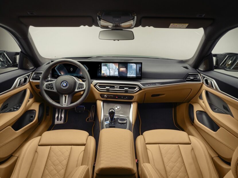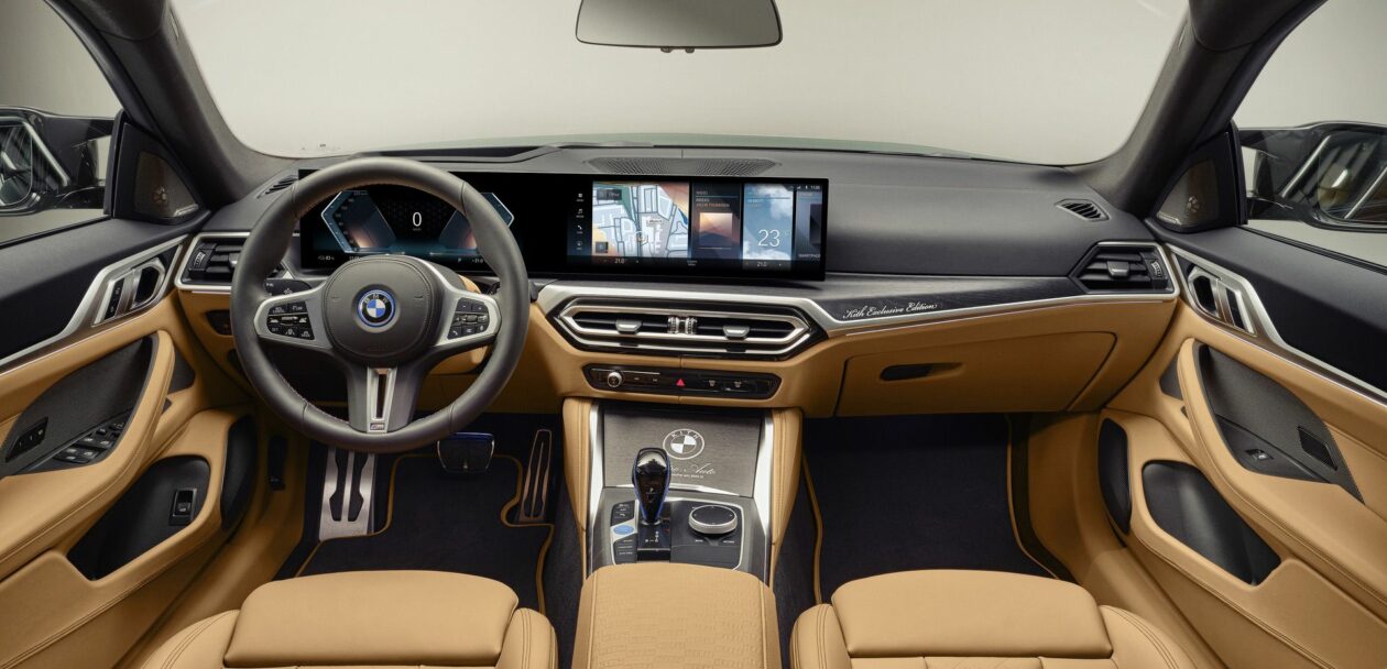 Inside the BMW i4 M50 by Kith, the knee bolster, steering column, seat and side panelling, as well as the lower part of the A and B posts are all upholstered in merino leather. The front and rear floor mats are also trimmed in caramel-colored leather and embroidered with the M logo, which has been changed to Kith, and the M stripes. Kith lettering in a box design is embossed on the headrests as well as the front centre armrest. “KITH Exclusive Edition” has been laser-engraved into the trim.