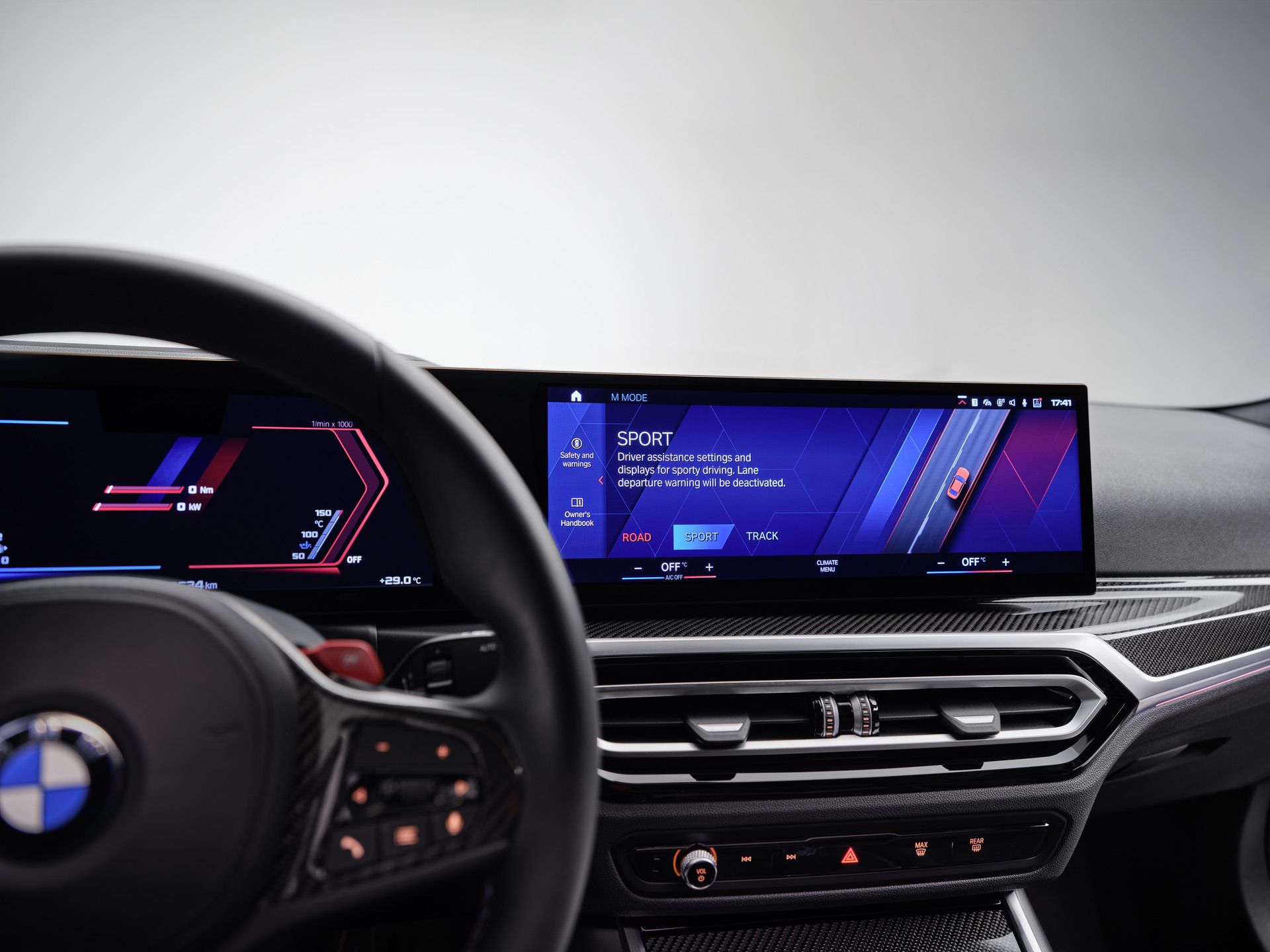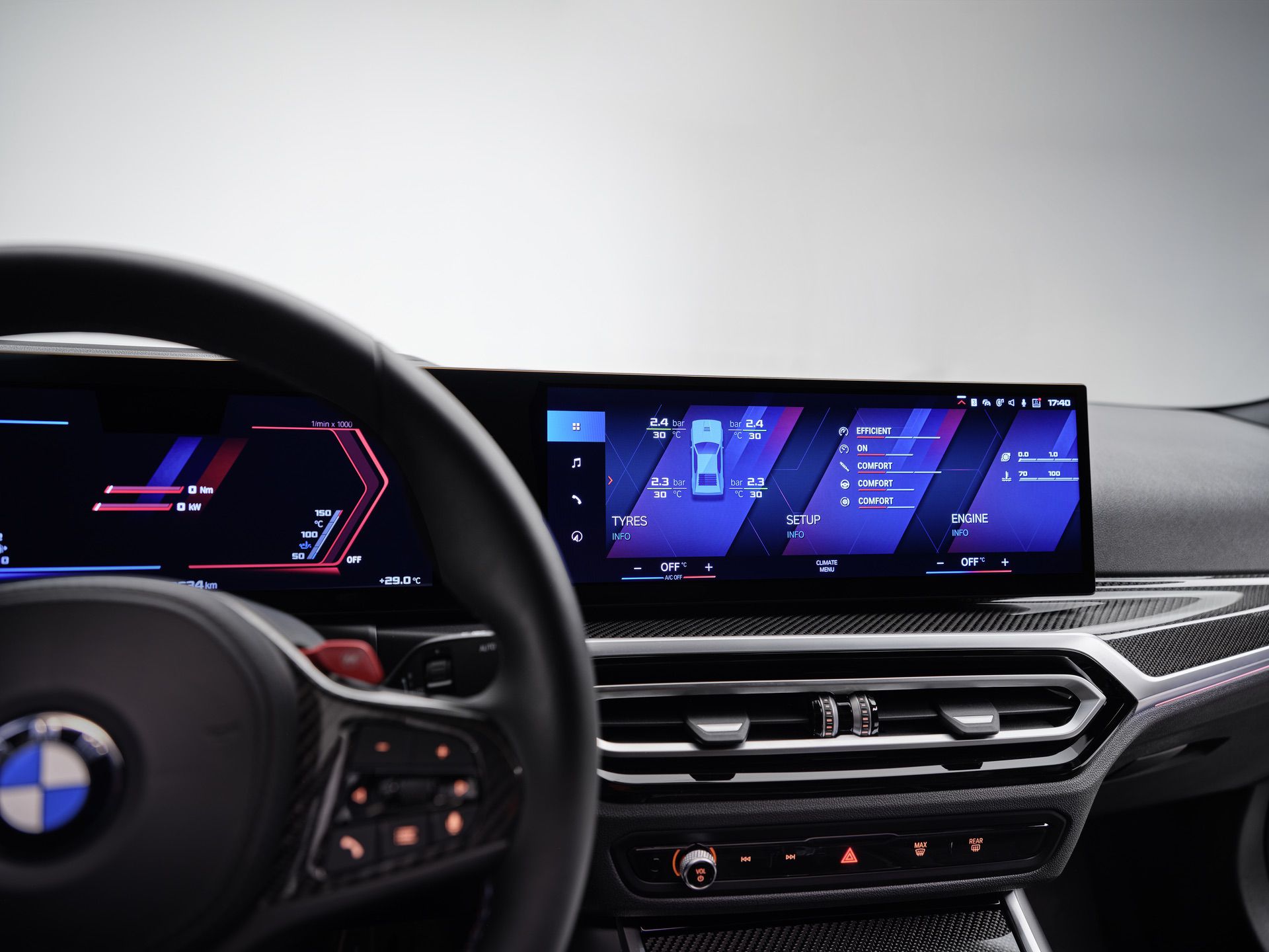 The new M-style gauge features a digital speed readout and fuel gauge on the left side, with revs, current gear, and any driver assistance information on the right. There’s also an M-specific head-up display, similar to what you’ll find in the new BMW XM.