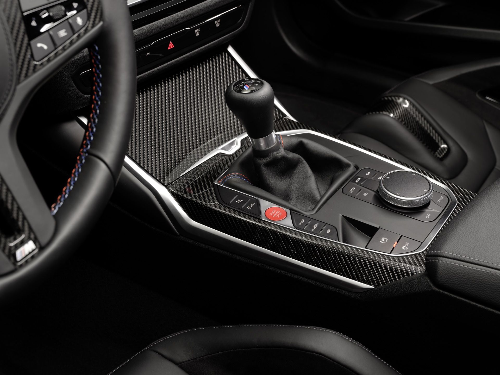 Standard interior trim is high-gloss black plastic, which should be a crime. However, aluminum and carbon fiber trims are available options. If you spec the M Race Track Package, you get the carbon fiber holy trinity: carbon roof, the carbon bucket seats, and carbon fiber trim.