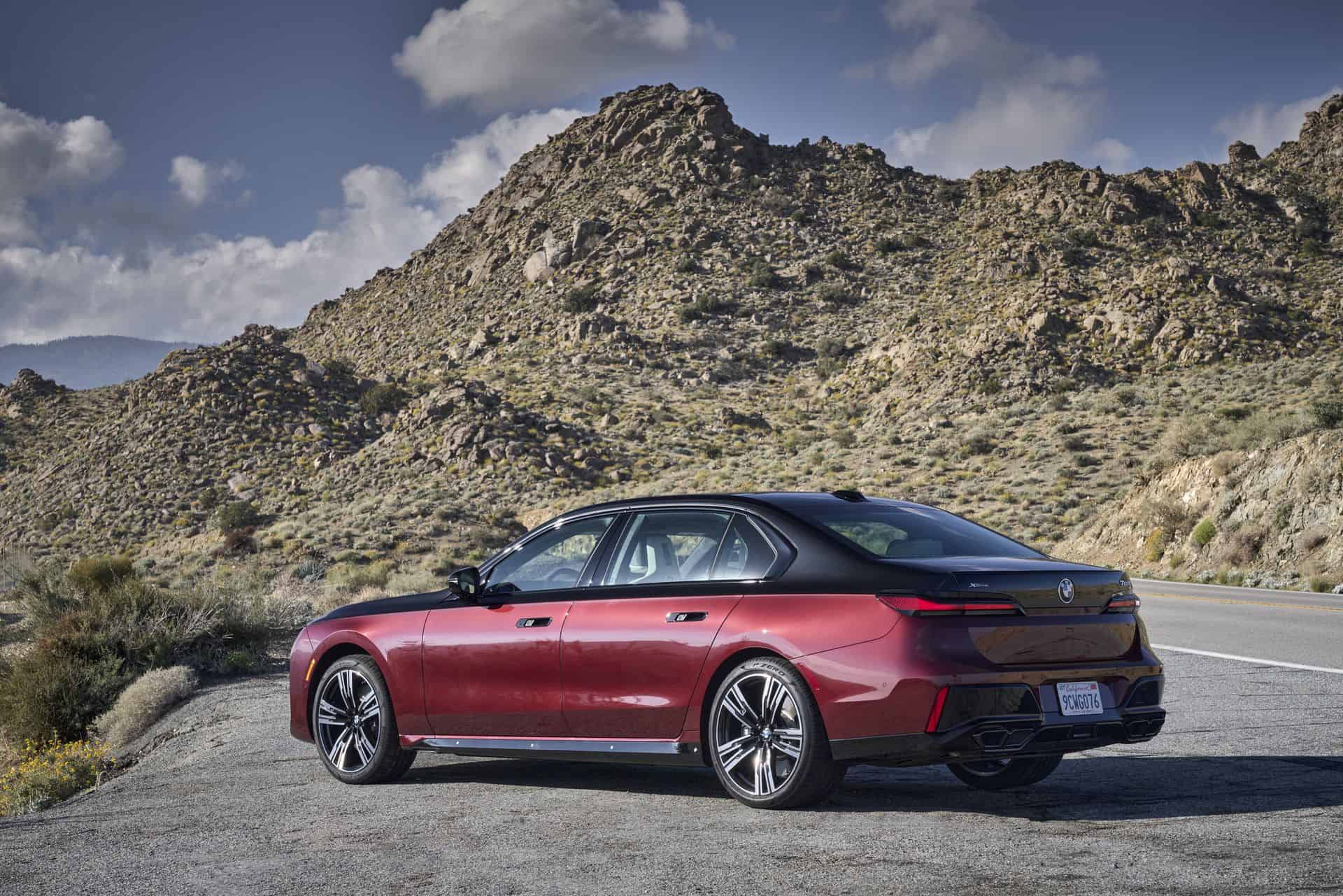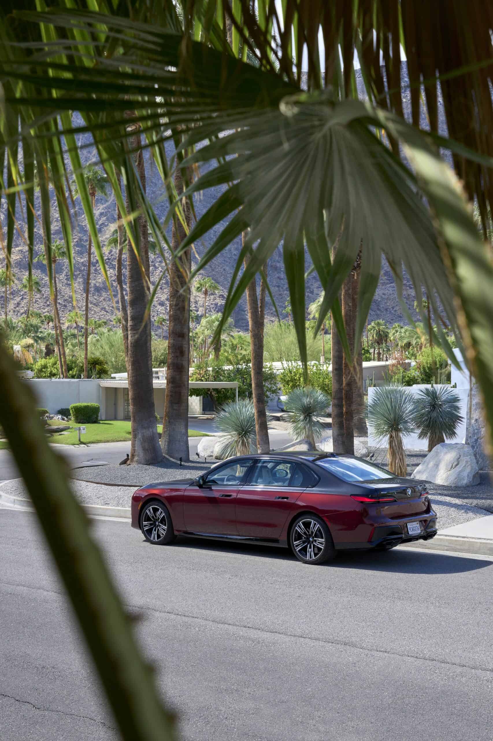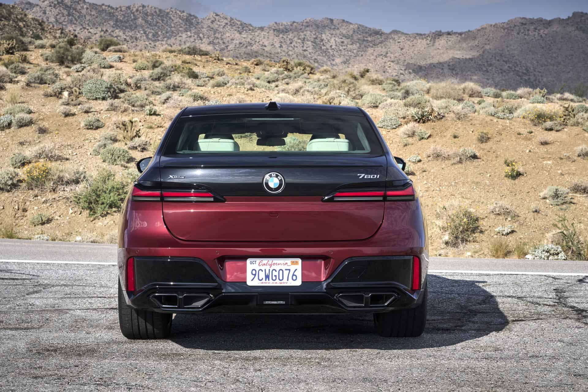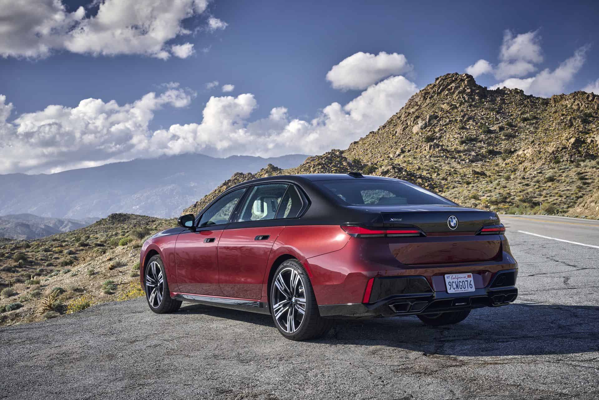 This particular BMW 760i is painted in the Cashmere Silver and Aventurine Red color and it was our tester during the international media launch in Palm Springs. As you can see in the photos below, the 760i is paired with the M Sport Package and the Extended Shadowline Package which adds plenty of black accents. Inside, the 760i features a fancy cashmere wool for the seat surfaces – an absolute premiere for a BMW.