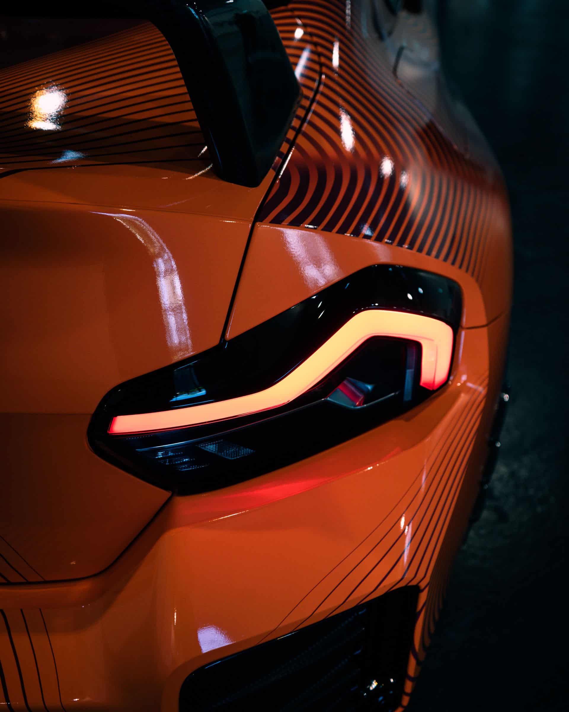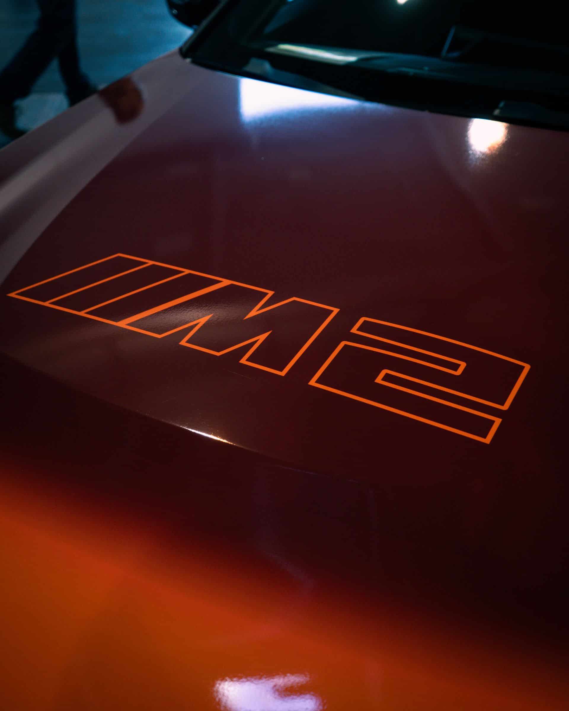 With a flashy orange/burgundy exterior finish, a large M2 decal on the hood, and a plethora of carbon fiber add-ons, this wild build is guaranteed to generate a buzz at the Essen Motor Show. It happens to have the stacked exhaust tips mounted in the center of the aggressive rear diffuser. Also at the back, the large rear wing lends the compact coupe a muscular appearance.