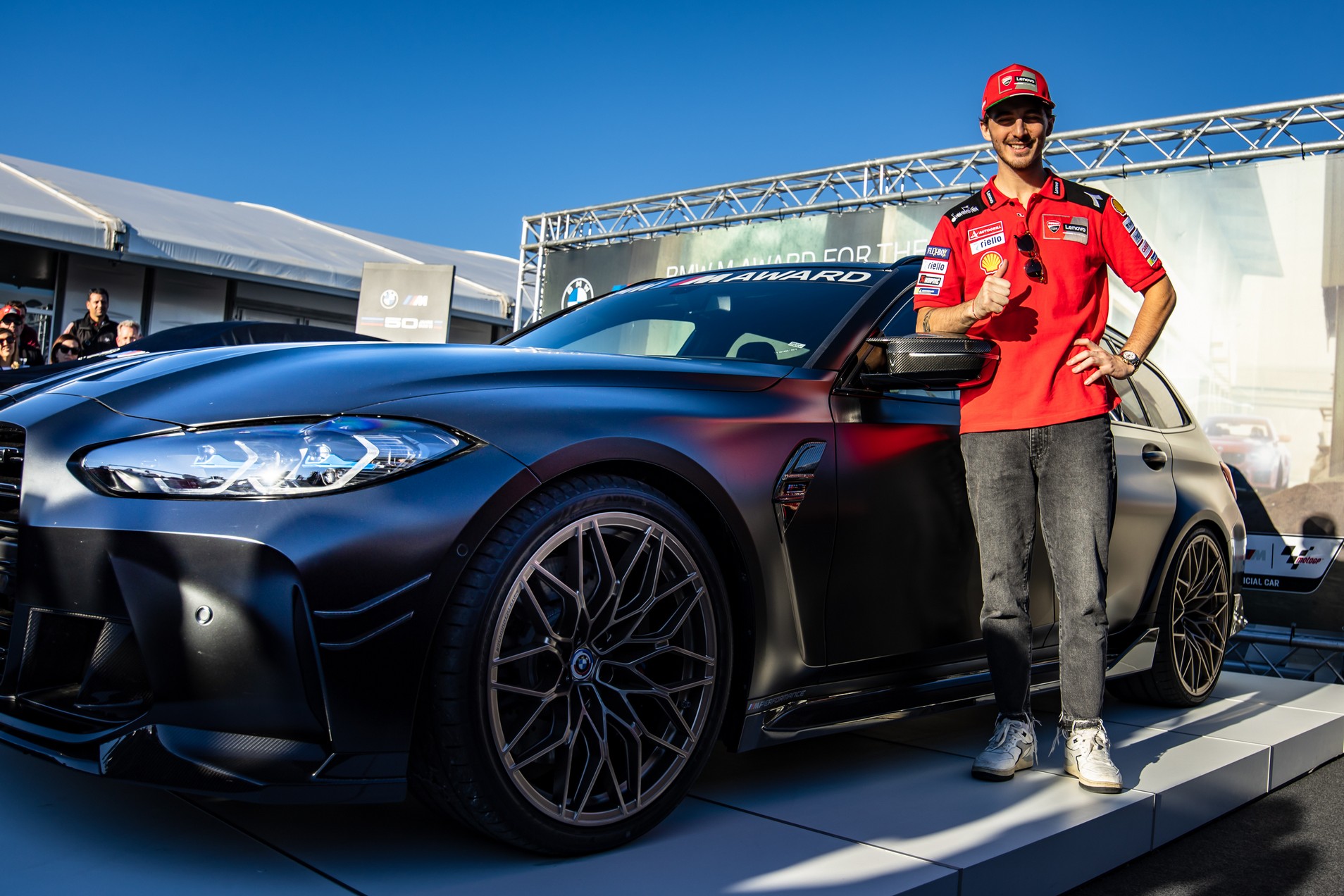 The 2023 M3 Touring served as the BMW M Award this year and Francesco ‘Pecco’ Bagnaia received the keys to his super wagon this weekend. During the final qualifying session of the 2022 MotoGP season, the Ducati rider was officially crowned as the fastest qualifier this year. The car in question is a stealthy example with an Individual Frozen Black matte paint job and optional Frozen Gold wheels (1000 M) from the M Performance Parts catalog.