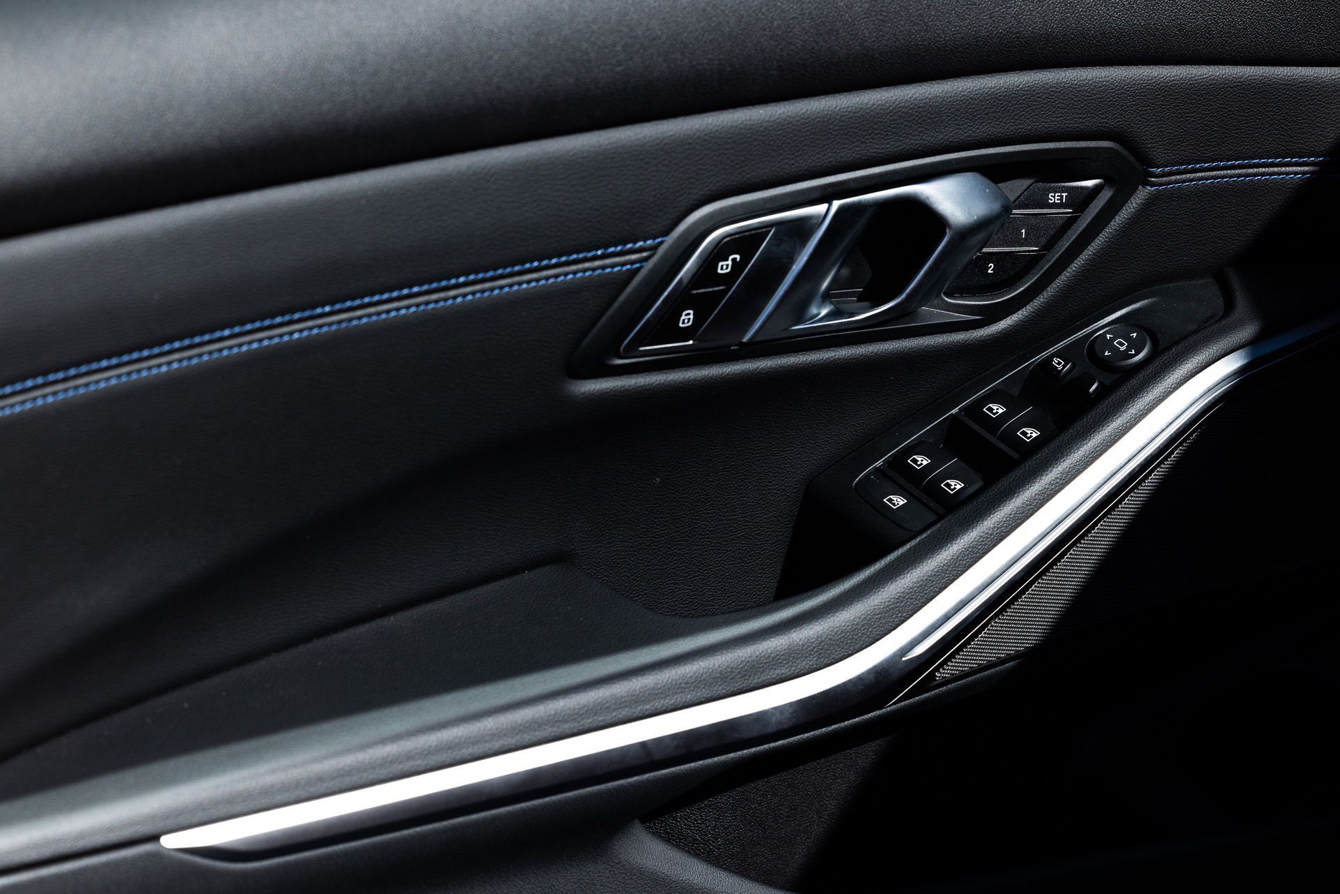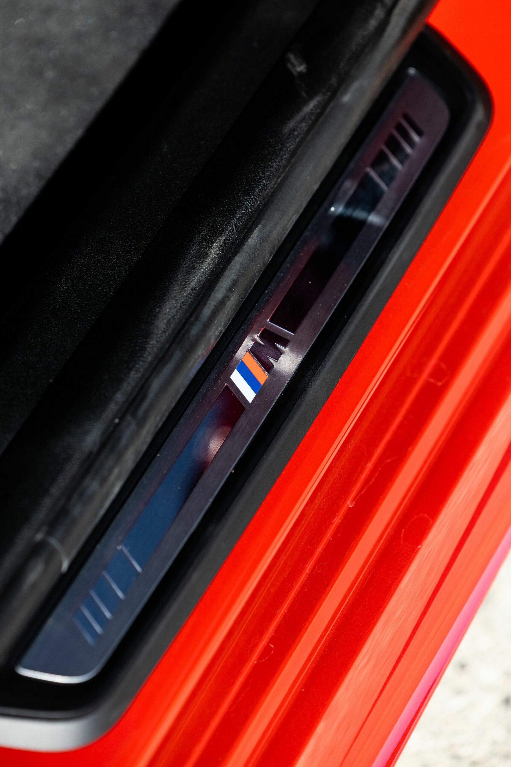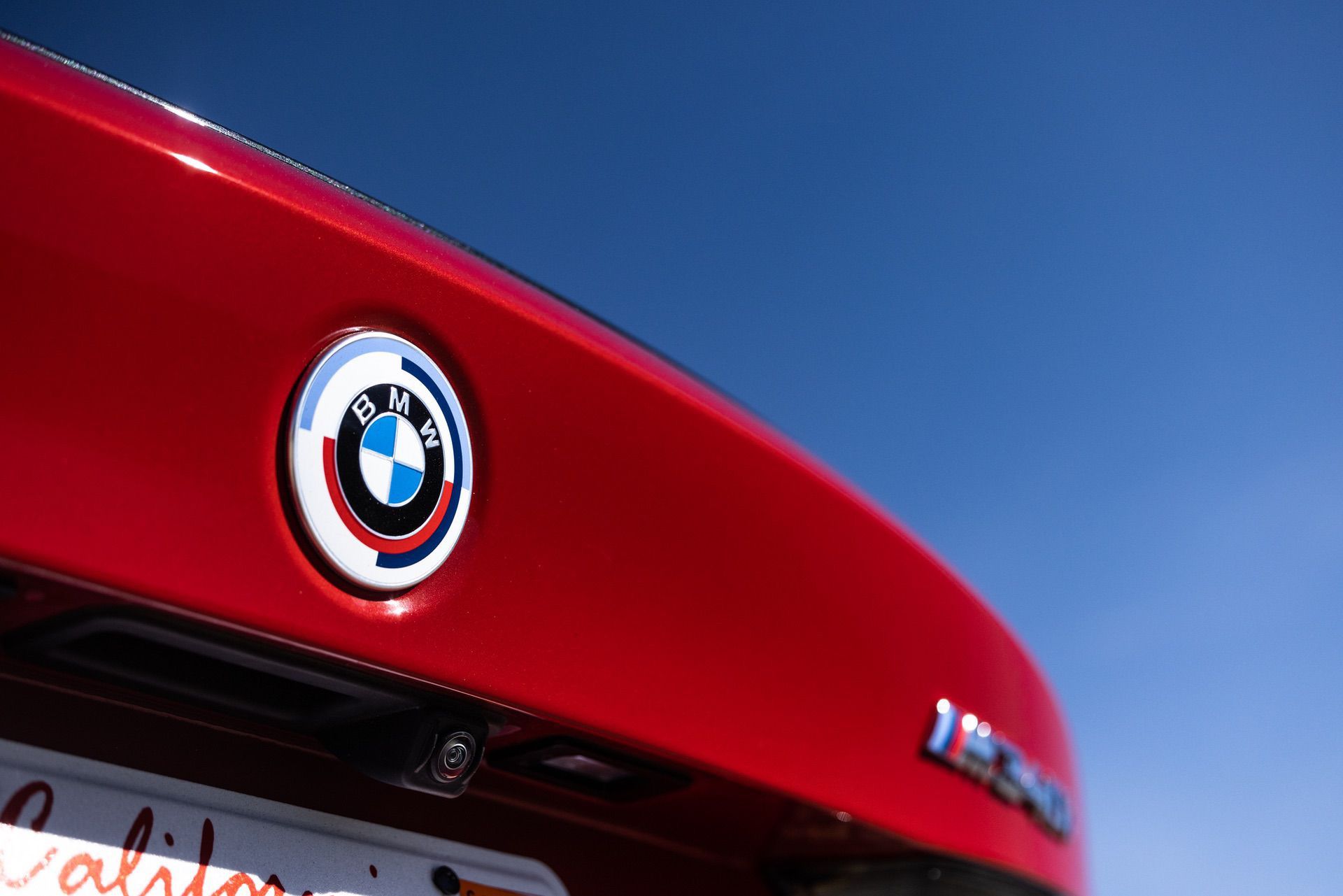 This M Performance 3 Series is an xDrive model with the Shadowline upgrade as denoted by the black kidney grille and the heavily tinted headlights. It’s shown here with optional 19-inch M wheels with a two-tone finish and anniversary emblems. Available for all M Sport and M cars produced in 2022, these 50 years of M roundels are also noticeable at the front and rear.
