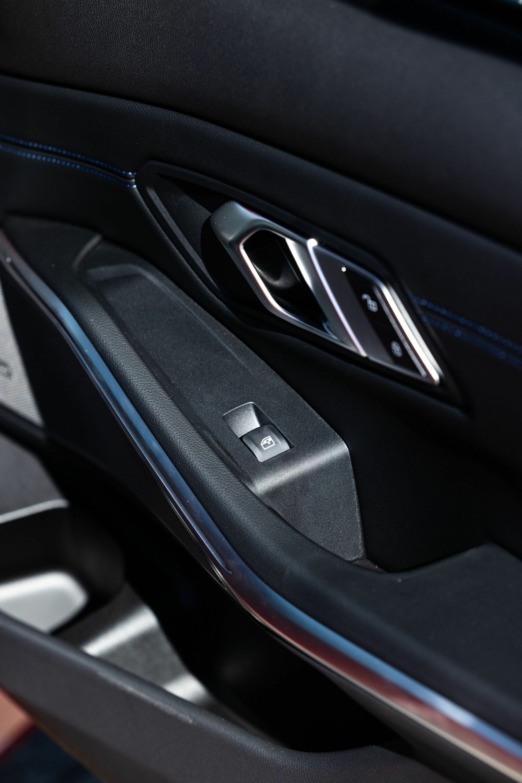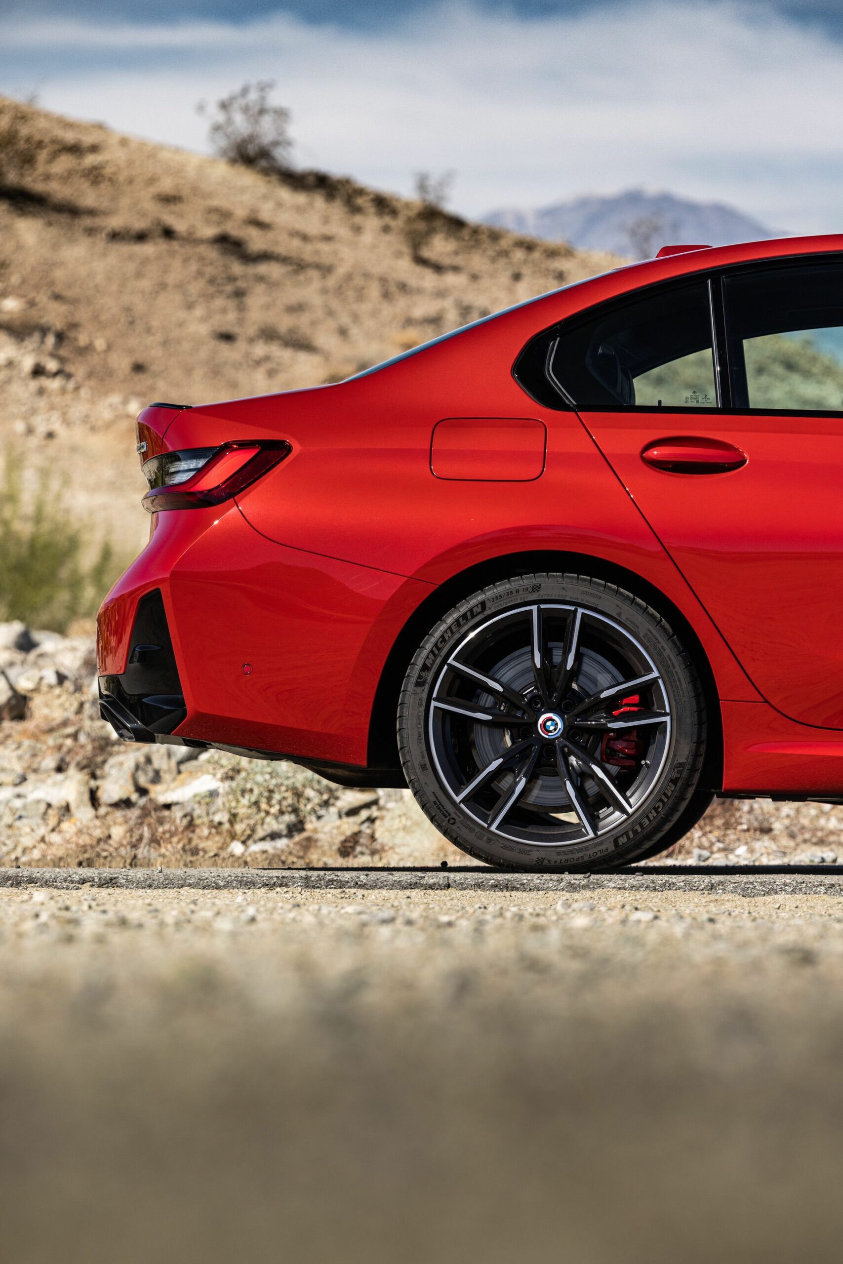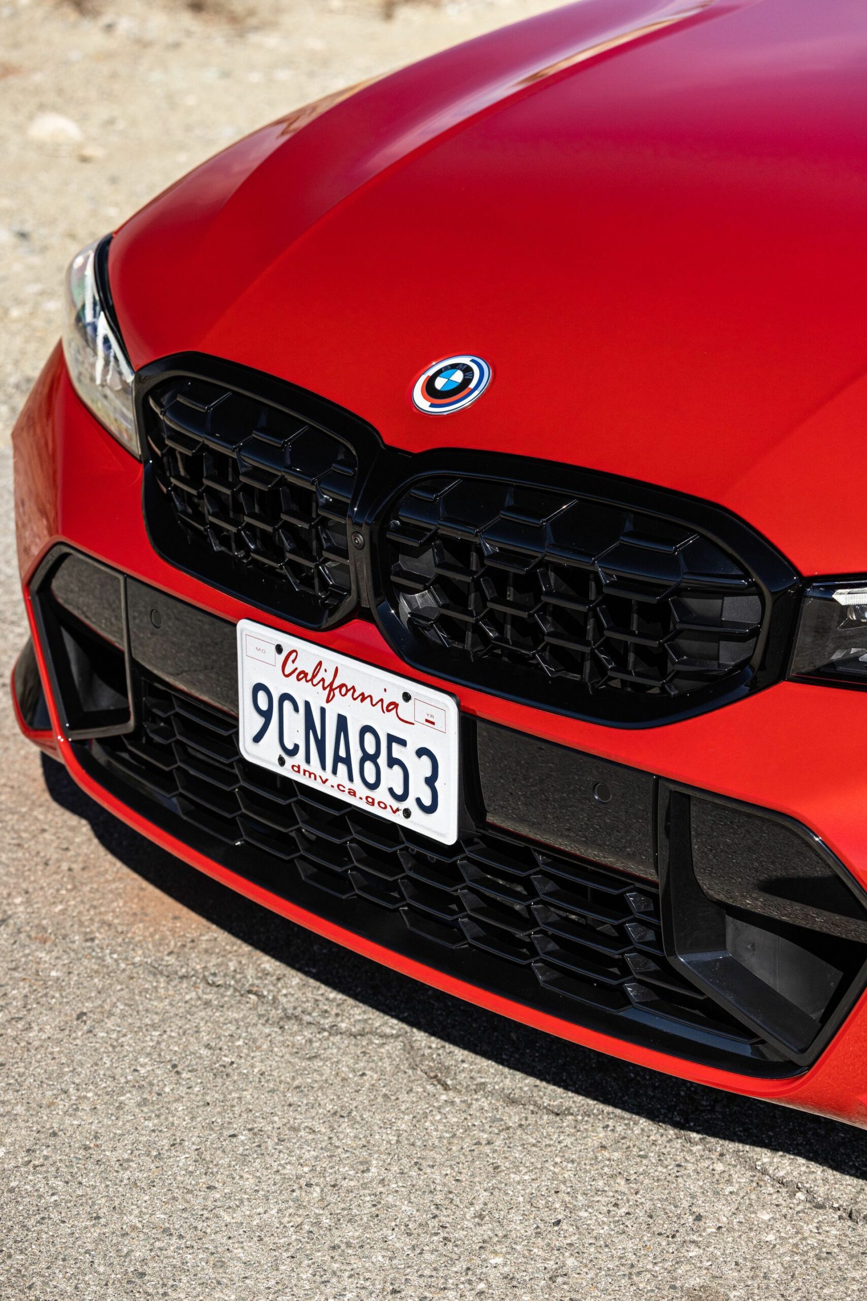 This M Performance 3 Series is an xDrive model with the Shadowline upgrade as denoted by the black kidney grille and the heavily tinted headlights. It’s shown here with optional 19-inch M wheels with a two-tone finish and anniversary emblems. Available for all M Sport and M cars produced in 2022, these 50 years of M roundels are also noticeable at the front and rear.