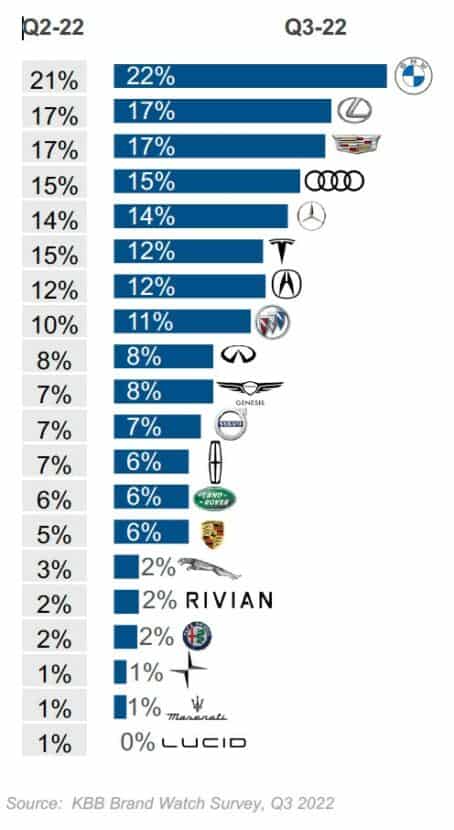 Aside from Tesla, the other brands that were less considered by luxury car buyers were Lucid, Lincoln, and Jaguar. Trailing behind BMW were Lexus and Cadillac, with both at 17 percent, or five percentage points less than the Bavarian brand.